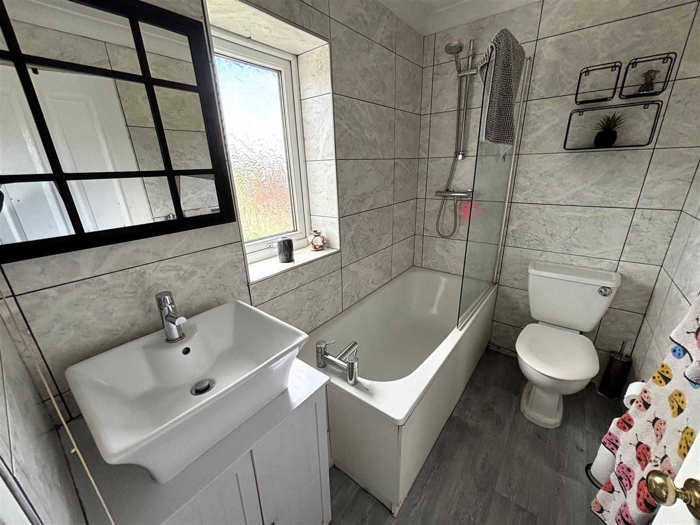 Bathroom - Panelled bath with mixer shower over. Low level W.C. Wash hand basin. Fully tiled walls. Upvc double glazed window to the rear. Heated towel rail.