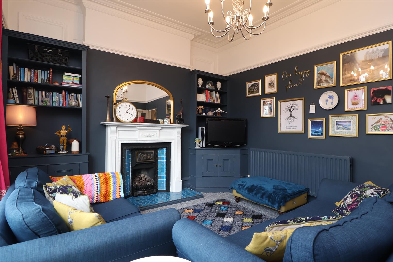 Second Lounge - 4.5 x 3.6 (14'9" x 11'9") - The second lounge is a tranquil and inviting space, with a large window that frames views of the front gardens, allowing natural light to pour in. This room retains a wealth of period features, including classic picture rails and built-in cupboards that add both charm and functionality. The focal point of the room is the elegant fireplace with a gas fire, surrounded by a period-style surround that enhances the room's character. The navy walls create a rich, cosy atmosphere, providing the perfect backdrop for the traditional details. With its blend of classic elements and modern comfort, this second lounge offers a serene retreat within the home.