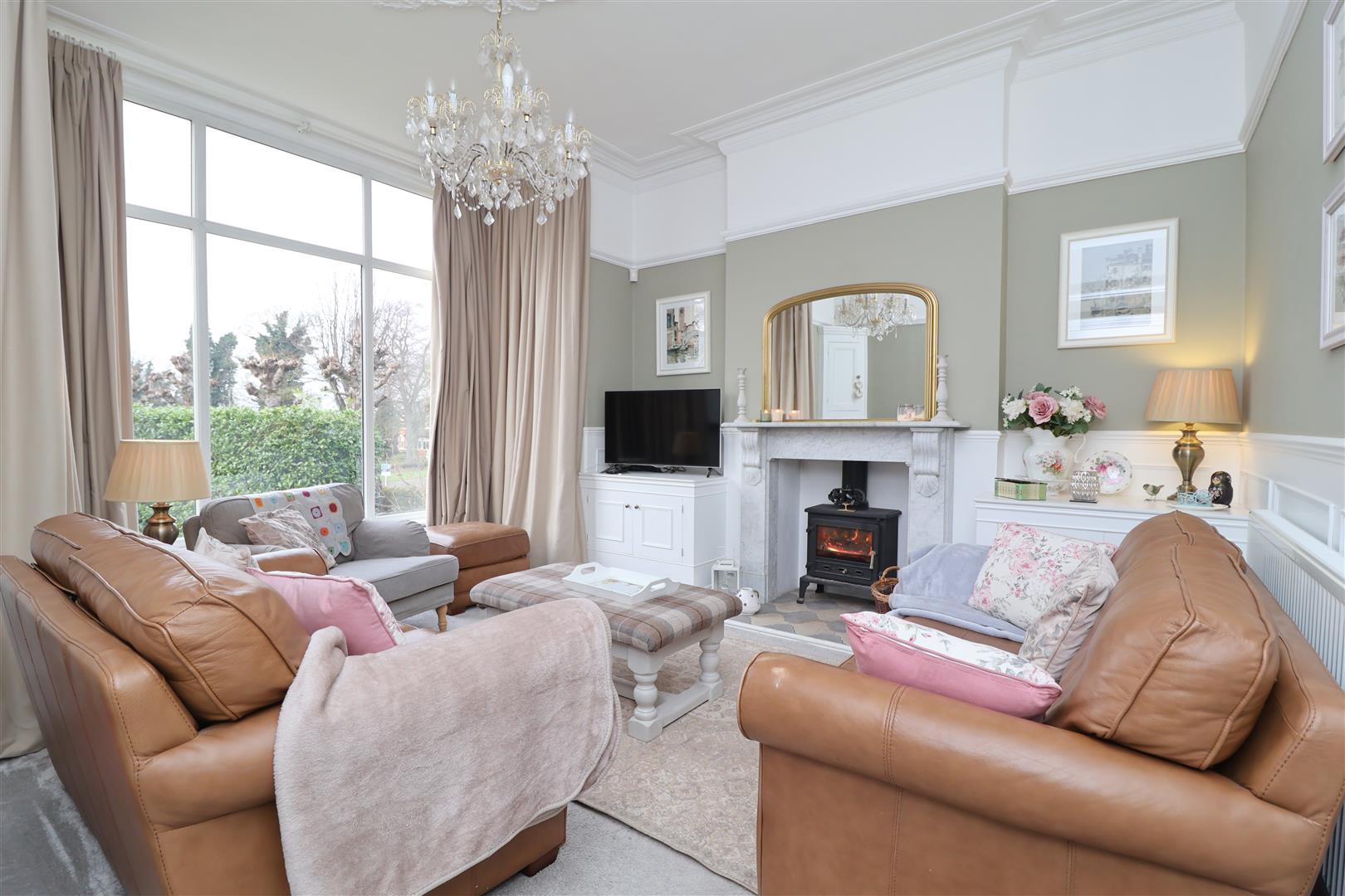 Sitting Room - 4.7 x 4 (15'5" x 13'1") - The period living room exudes timeless elegance, featuring large windows that flood the space with natural light and offer beautiful views of the surrounding area. Classic picture rails and wood panelling add to the room's character, creating a sense of warmth and sophistication. At the heart of the room, a multifuel log burner provides both a focal point and a cozy atmosphere, perfect for relaxing or entertaining. The ceiling rose decoration adds a refined touch, complementing the room's period features while maintaining a sense of grandeur and charm. This living room seamlessly blends traditional craftsmanship with comfort, making it an inviting and stylish space.