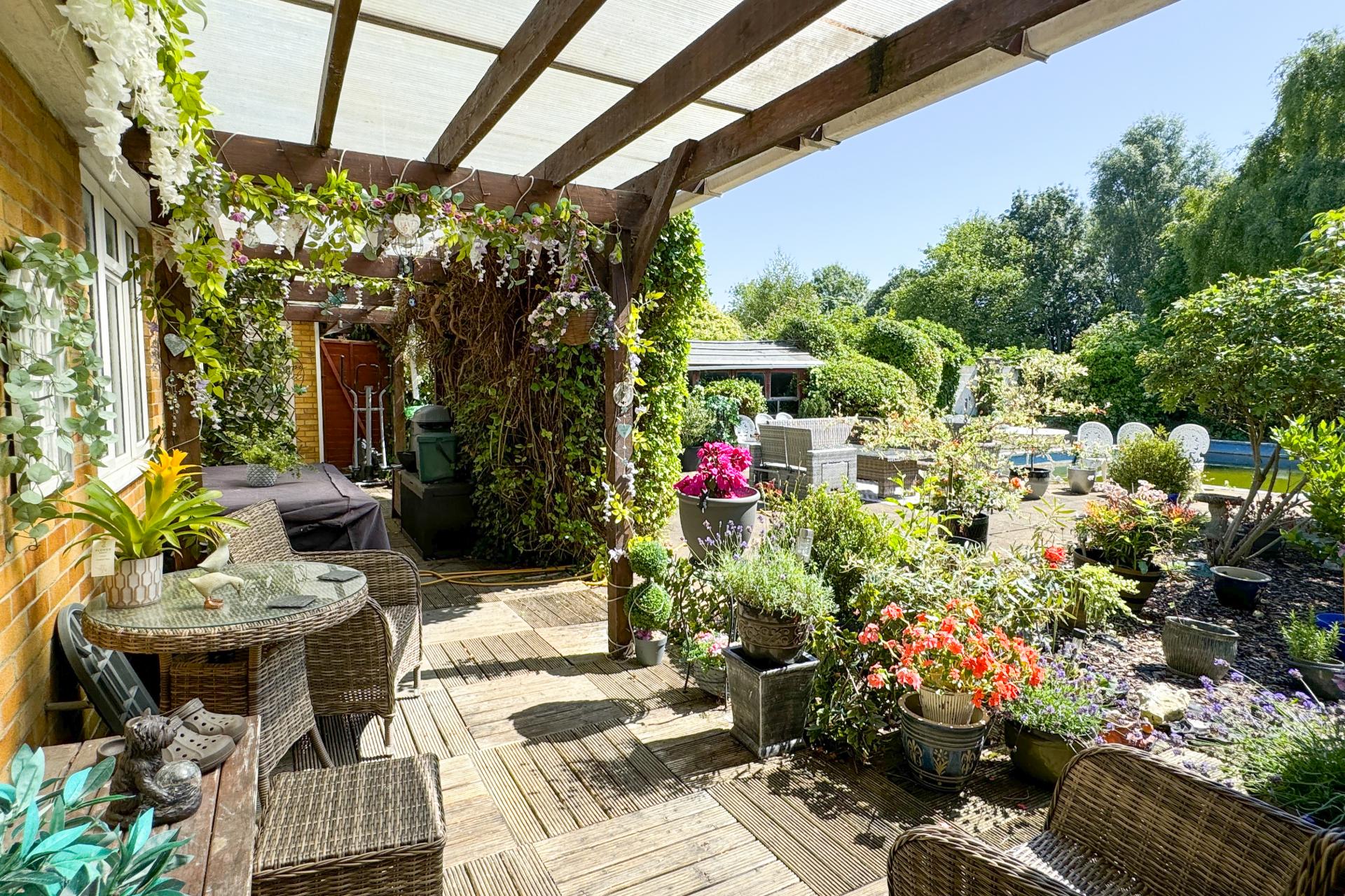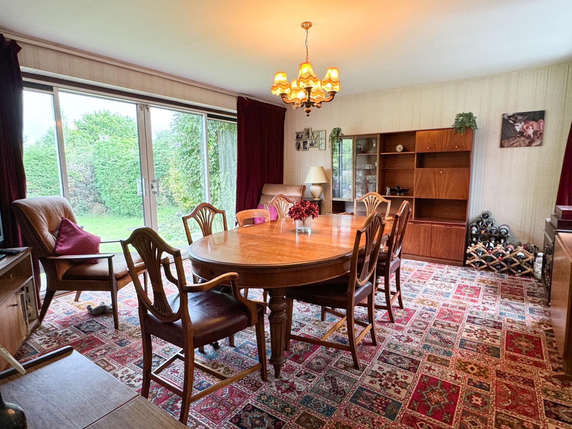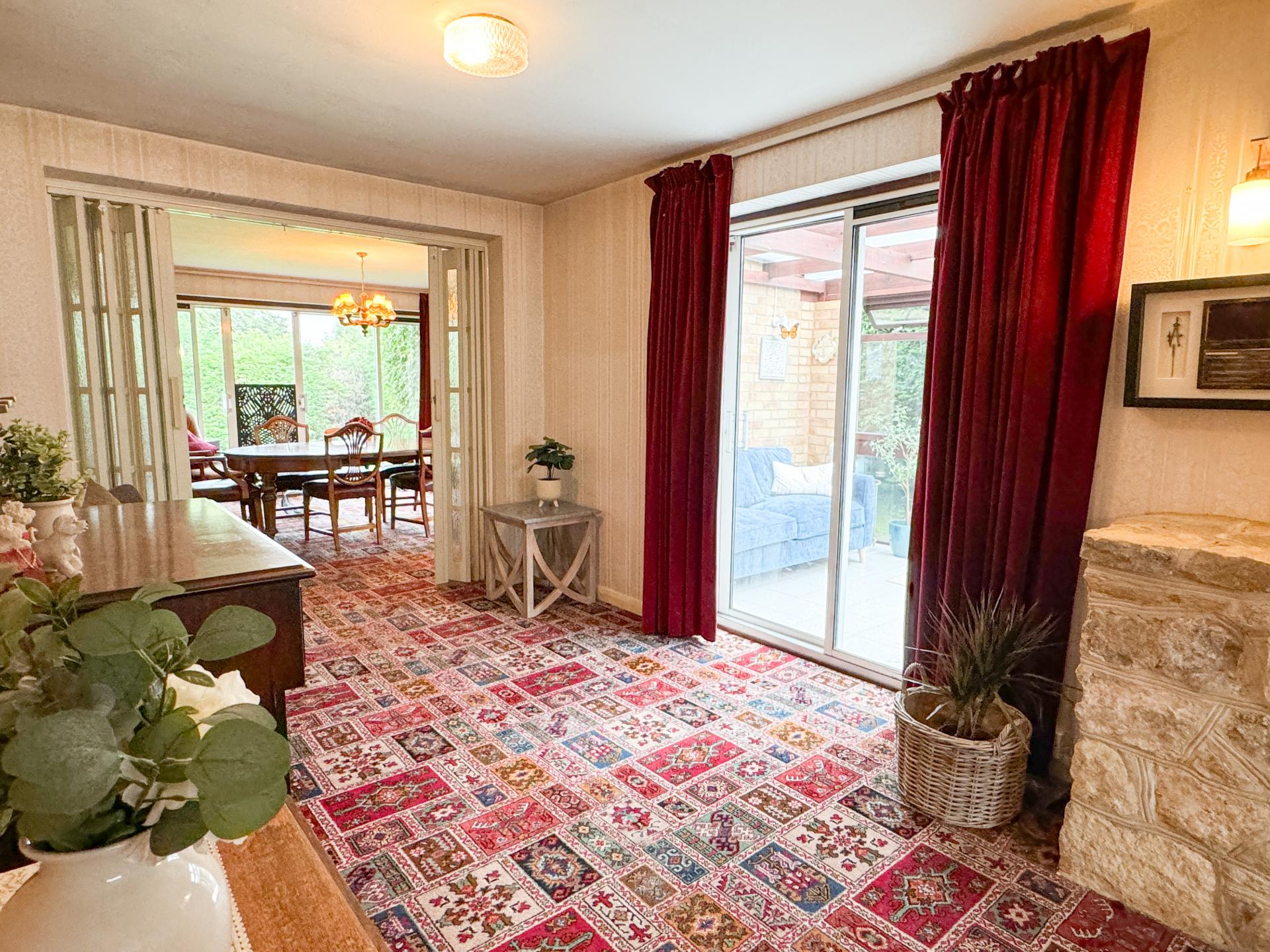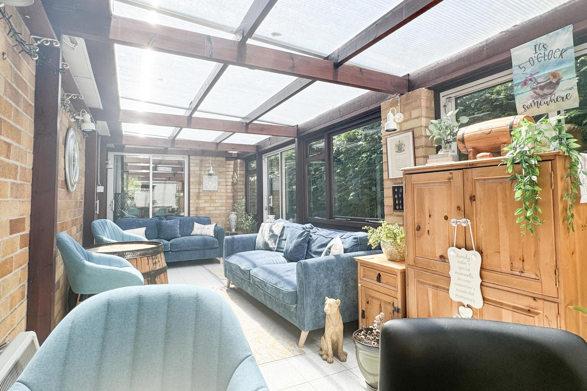 The conservatory, with its tiled floor and built-in bar, is bathed in natural light thanks to windows all around. Two sets of sliding doors provide access to a sunny side patio, perfect for outdoor enjoyment. At the end of the living room, double-glazed doors open into the dining room, which boasts a sliding patio door that reveals a beautiful lawn area and garden views, complemented by a cozy seating patio.