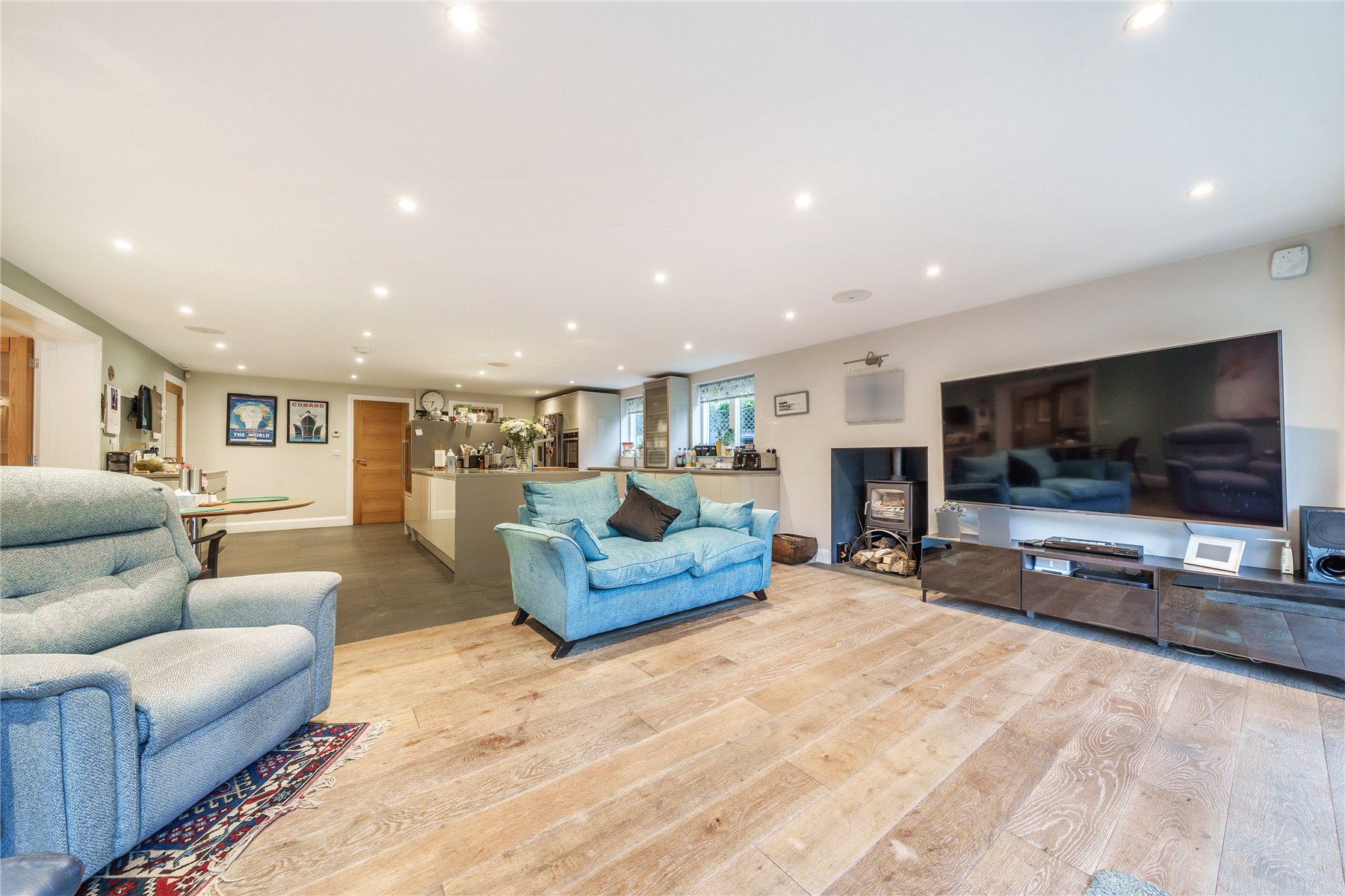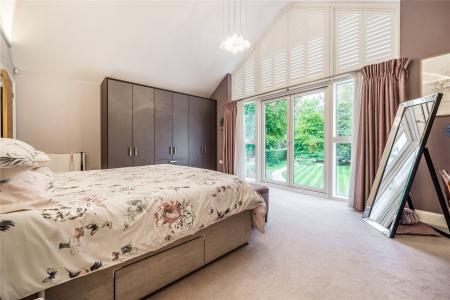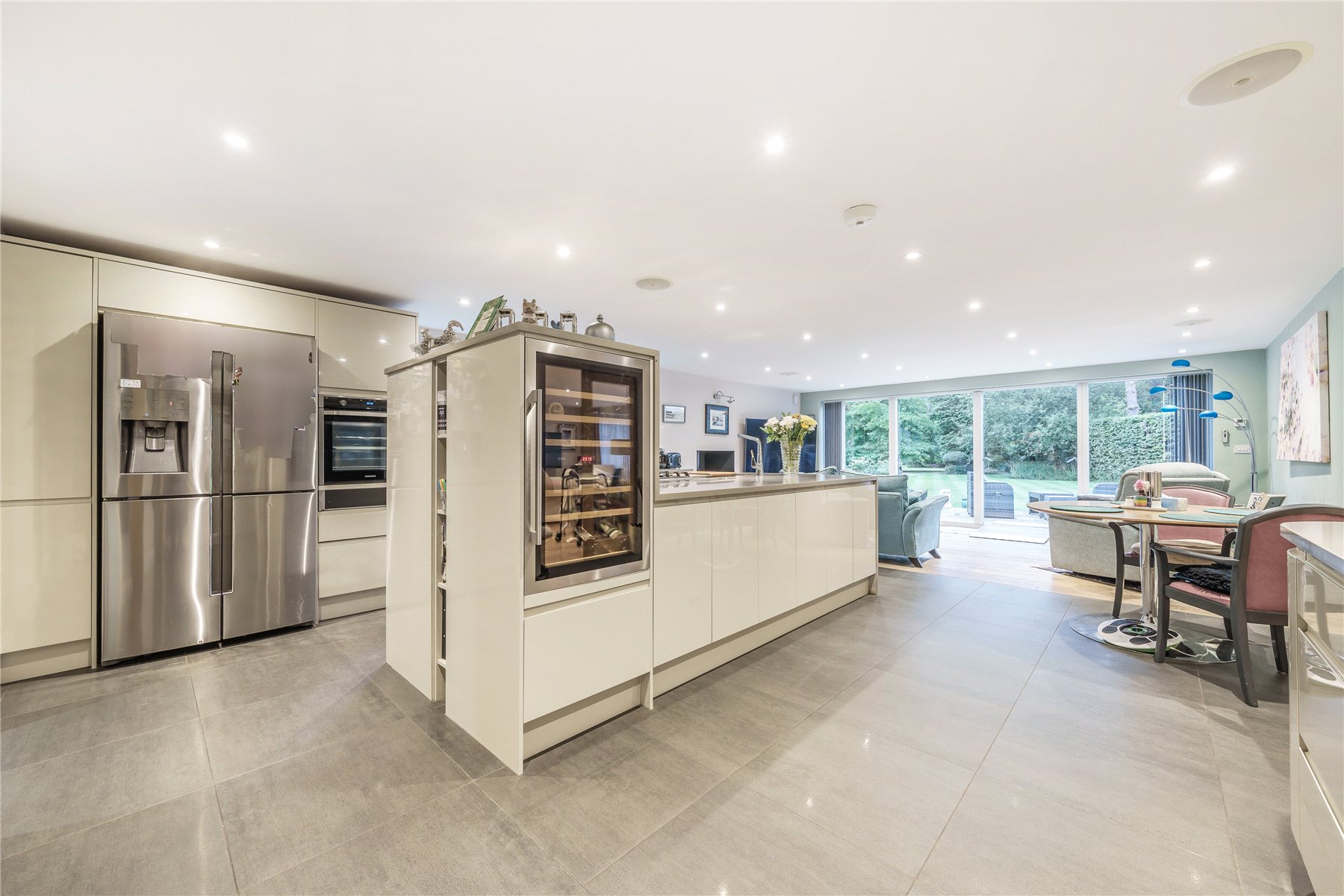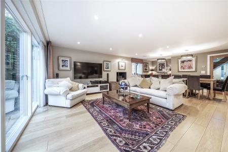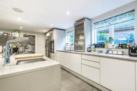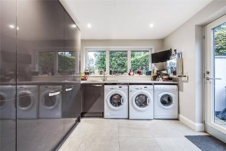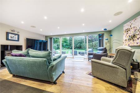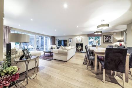 A succession of light filled rooms unfolds from a double height central entrance hall giving an immediate insight into the fluidity of the accommodation. Double doors entice you into a simply stunning double aspect living room that is without doubt an incredibly special place to both relax and entertain. With a wall of sliding doors extending its generous dimensions out onto the south-facing patio, the warm tones of a wood floor lend a hugely restful feel while a log burner adds a traditional focal point. The sense of light and space is replicated in the adjoining kitchen/family/dining room where a further wall of glass makes it equally easy for daily life to filter outside. The sleek streamlined design of the kitchen creates an accomplished space that's both ergonomic and inviting. Family friendly yet also built for evenings spent entertaining friends, its integrated appliances include a notable wine cooler, American-style fridge freezer and Siemens tower ovens. An extensive central island adds to the sociable layout of the room while a clever use of flooring delineates it from the family/dining area. A fabulously large fitted utility room has a wealth of storage and keeps an array of laundry appliances hidden from view.