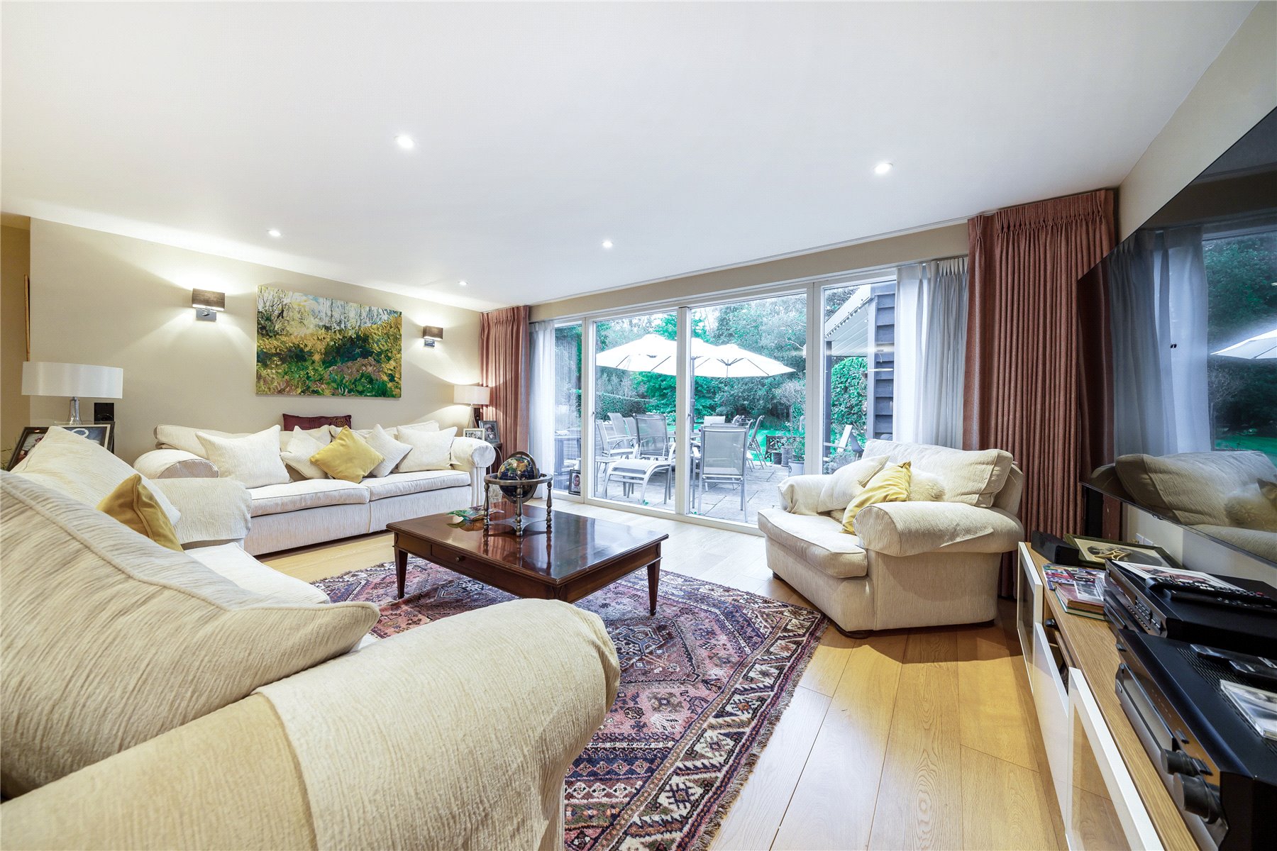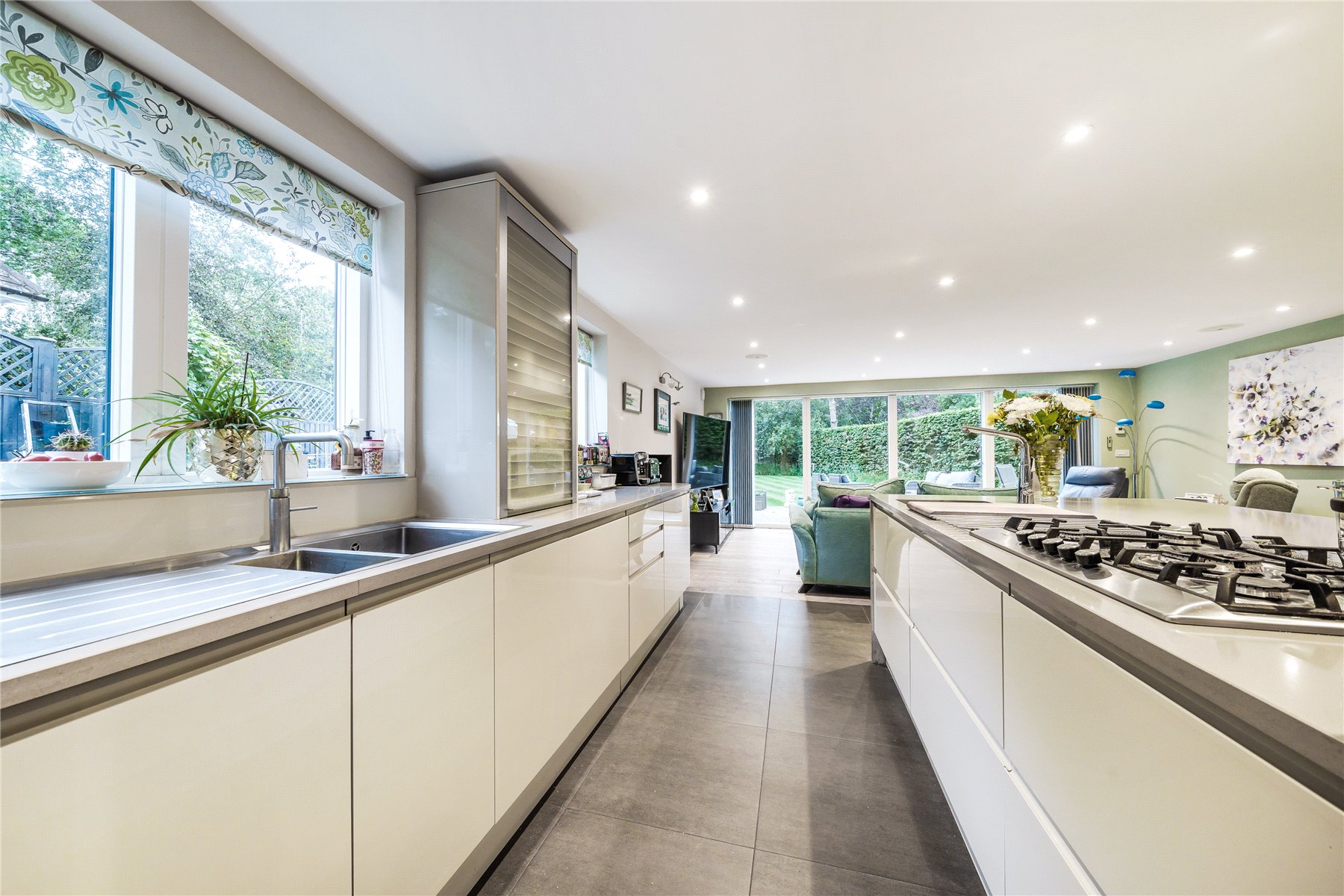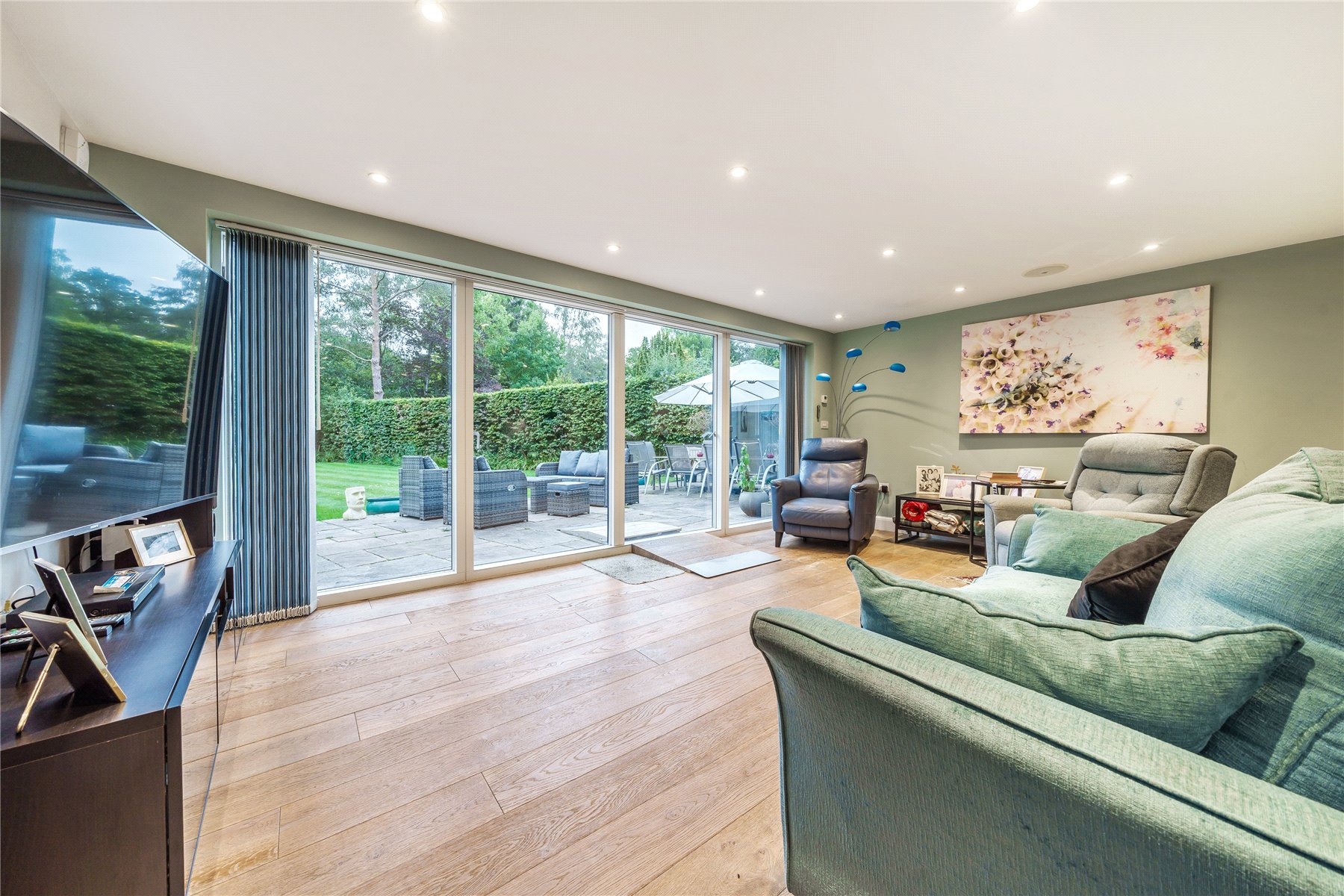 A succession of light filled rooms unfolds from a double height central entrance hall giving an immediate insight into the fluidity of the accommodation. Double doors entice you into a simply stunning double aspect living room that is without doubt an incredibly special place to both relax and entertain. With a wall of sliding doors extending its generous dimensions out onto the south-facing patio, the warm tones of a wood floor lend a hugely restful feel while a log burner adds a traditional focal point. The sense of light and space is replicated in the adjoining kitchen/family/dining room where a further wall of glass makes it equally easy for daily life to filter outside. The sleek streamlined design of the kitchen creates an accomplished space that's both ergonomic and inviting. Family friendly yet also built for evenings spent entertaining friends, its integrated appliances include a notable wine cooler, American-style fridge freezer and Siemens tower ovens. An extensive central island adds to the sociable layout of the room while a clever use of flooring delineates it from the family/dining area. A fabulously large fitted utility room has a wealth of storage and keeps an array of laundry appliances hidden from view.