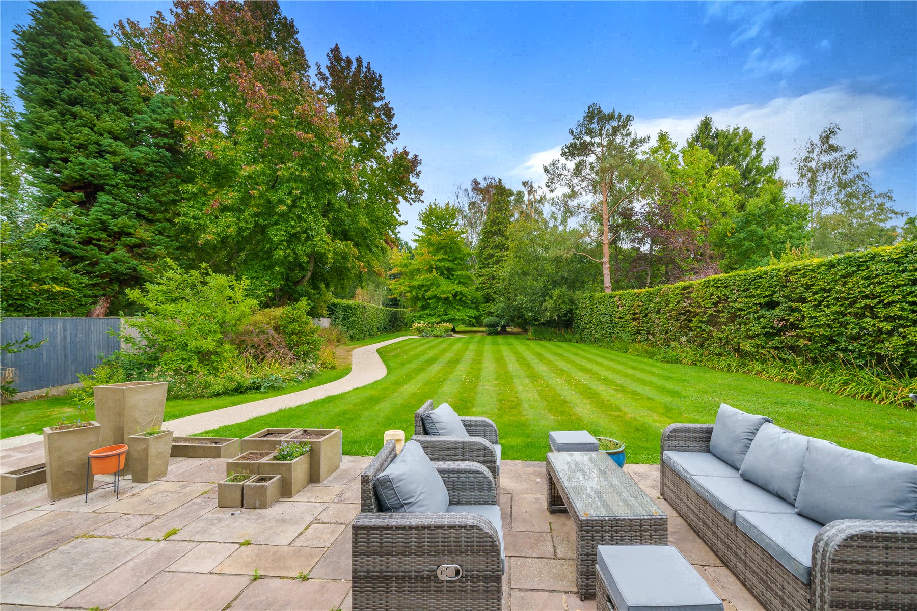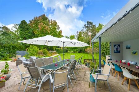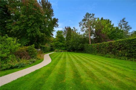 The established lawns wrap-around to a prodigious south-facing garden that has a cherished level of privacy and tranquillity. The ground floor's expansive walls of sliding doors allow a considerable stone paved patio to play an integral part of your daily life. Ideally sized for lazy weekend brunches, sundowners or the simple pleasure of an afternoon slice of cake, its covered al fresco dining area is an inspired addition. High conifer hedging and beds of mature grasses, shrubs and feature trees frame the long lawn that stretches out before you. The straight lines of its manicured stripes are contrasted by the gentle curves of a paved path that gives you every excuse to take a stroll to the rear.
