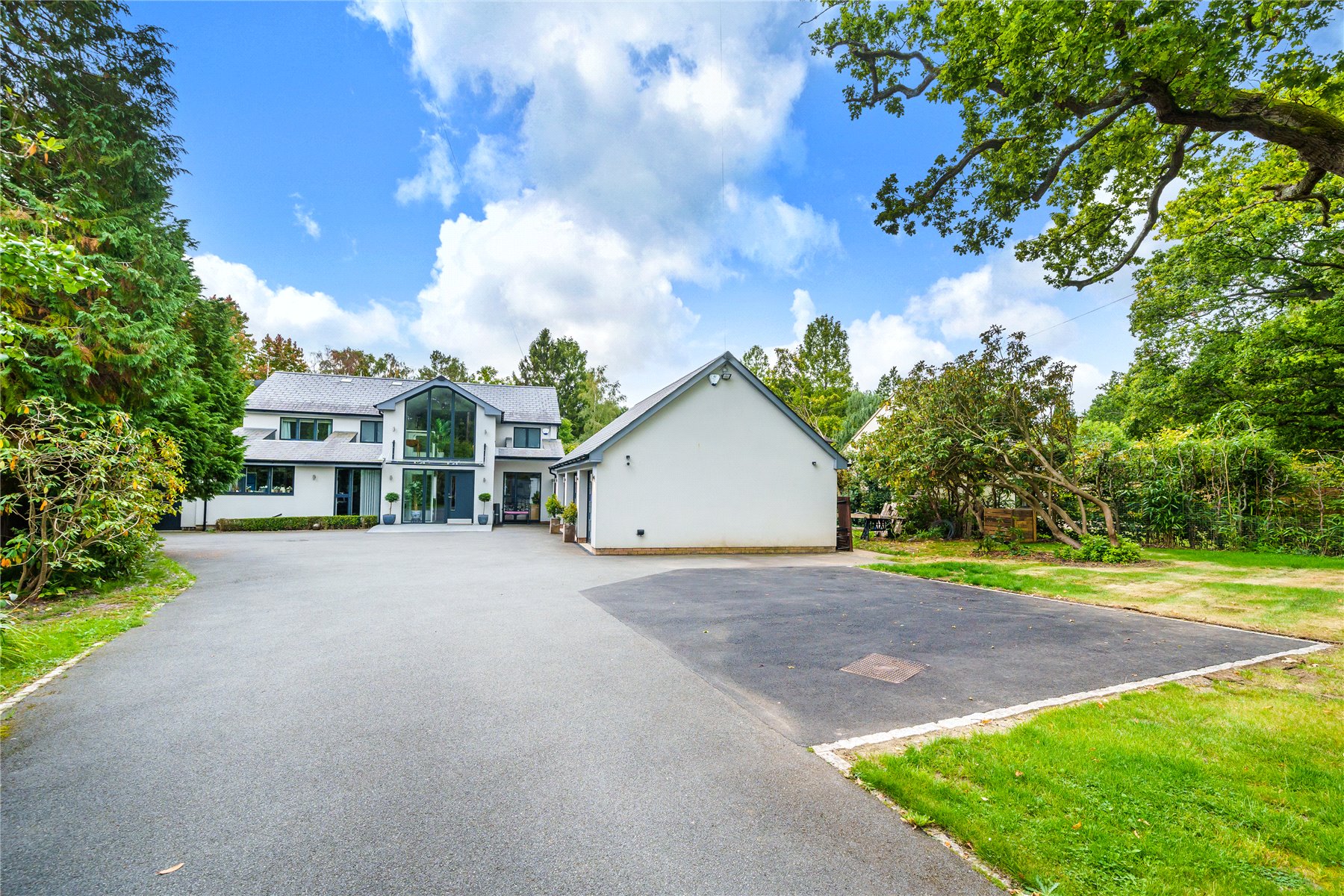 Tucked back from the leafy setting of Ash Road, Mandalay sits at the end of a commendably long tree-lined driveway that gives the perfect vantage point to admire the contemporary architecture of a double fronted facade. To its side detached triple garaging has a first floor studio of 23'5ft x 12'5ft that gives a host of possibilities with its main open plan space, trio of skylights and cloakroom.
