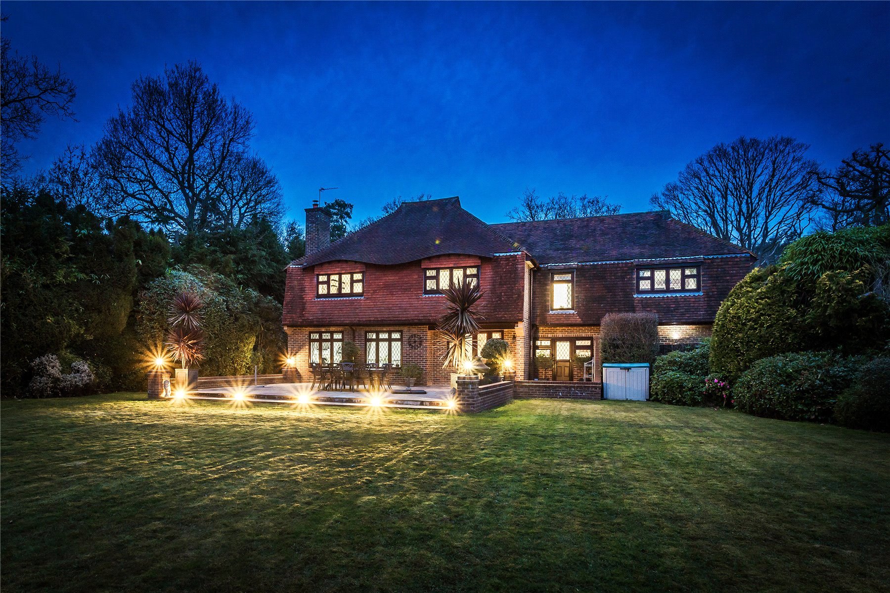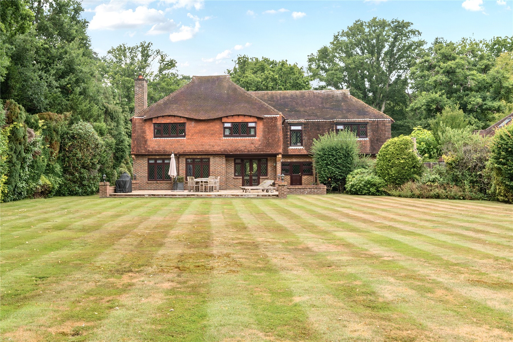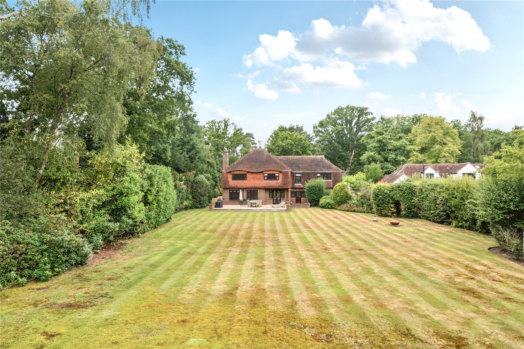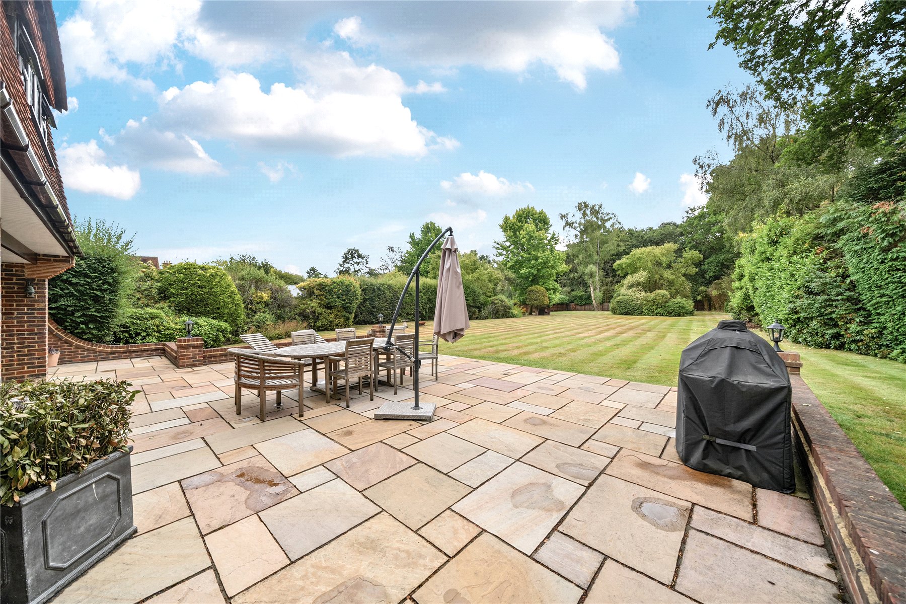 - Expansive gardens with mature hedging, extensive lawns, and large paved terraces ideal for entertaining