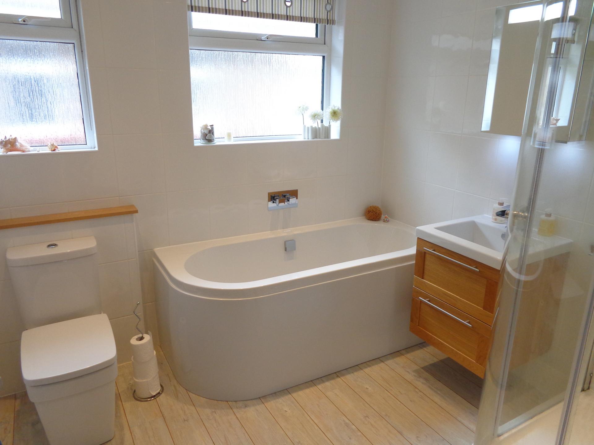 Low level wc, vanity basin with storage under, panelled bath, large shower cubicle with mixer control and rainfall shower head. Chrome ladder style towel rail. Kamaro flooring. 2 double glazed windows side aspect.