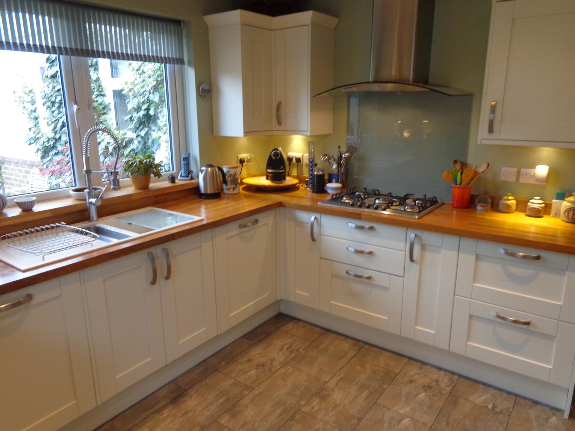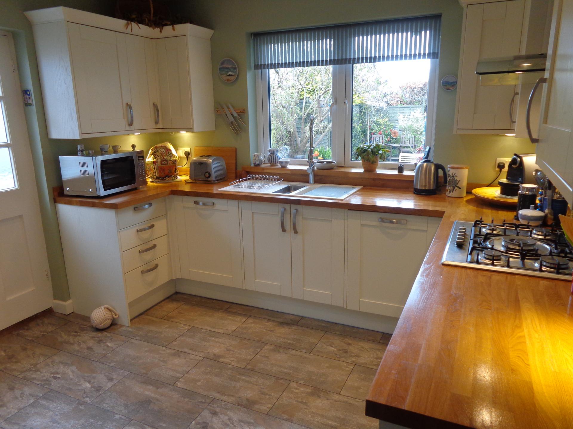 One and half bowl sink unit with pull out shower tap. Wide range of wall, base and storage units with wooden worktops. Built in double oven and 5 ring gas hob with extractor over. Integrated washing machine and dishwasher. Space for fridge/freezer. Designer radiator. Kamara flooring. Window overlooking rear garden which fully opens to the patio area. Door to side lobby.