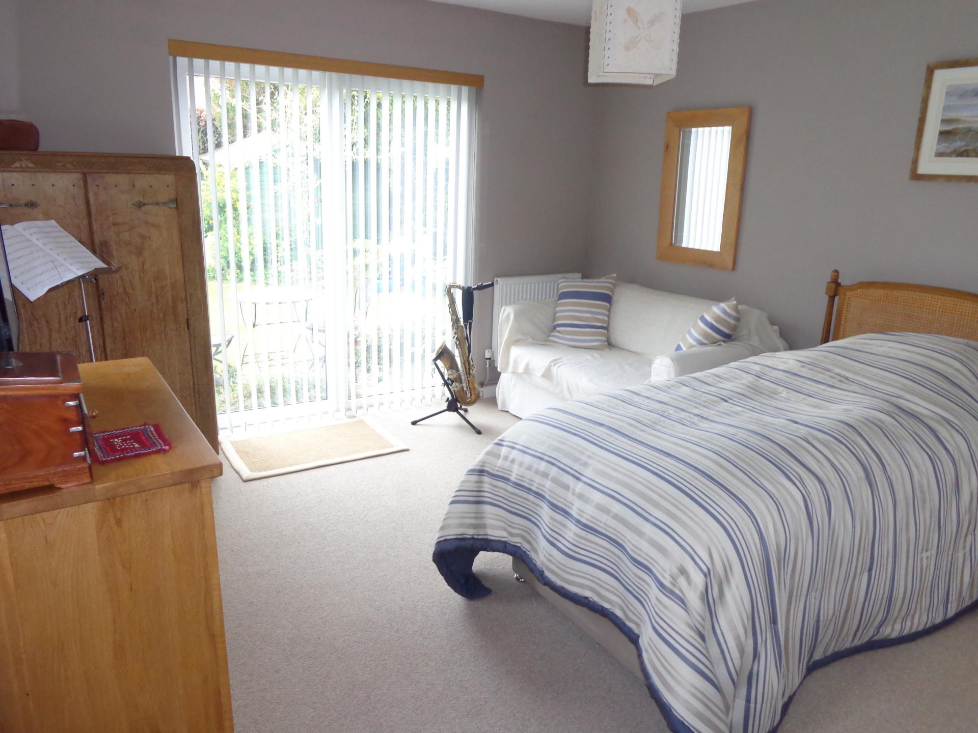 Extensive range of fitted wardrobes with hanging and shelving. 2 radiators. 2 double glazed windows to side and double glazed patio doors to the rear garden.