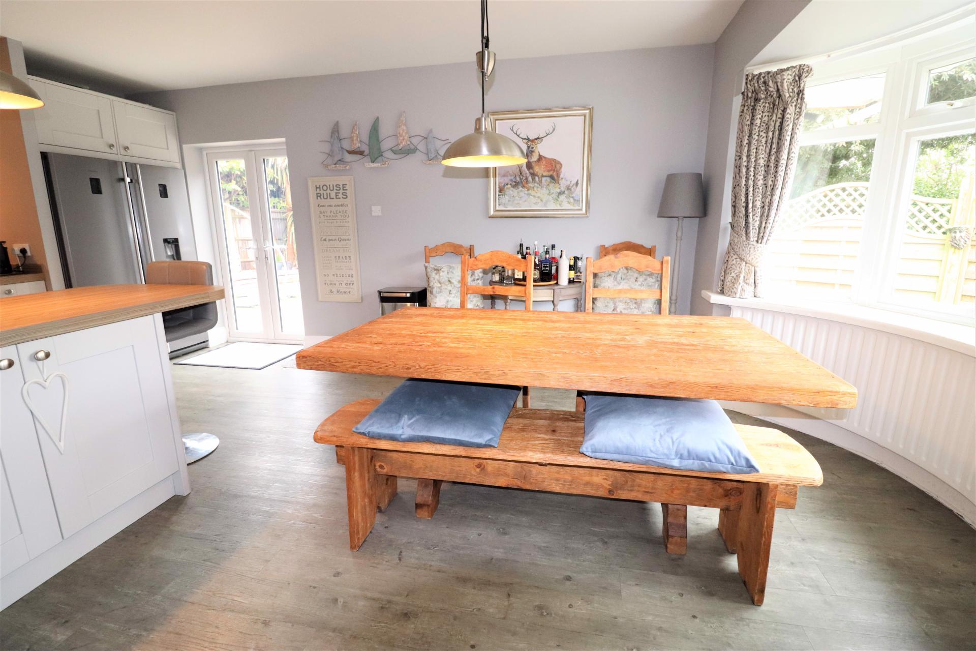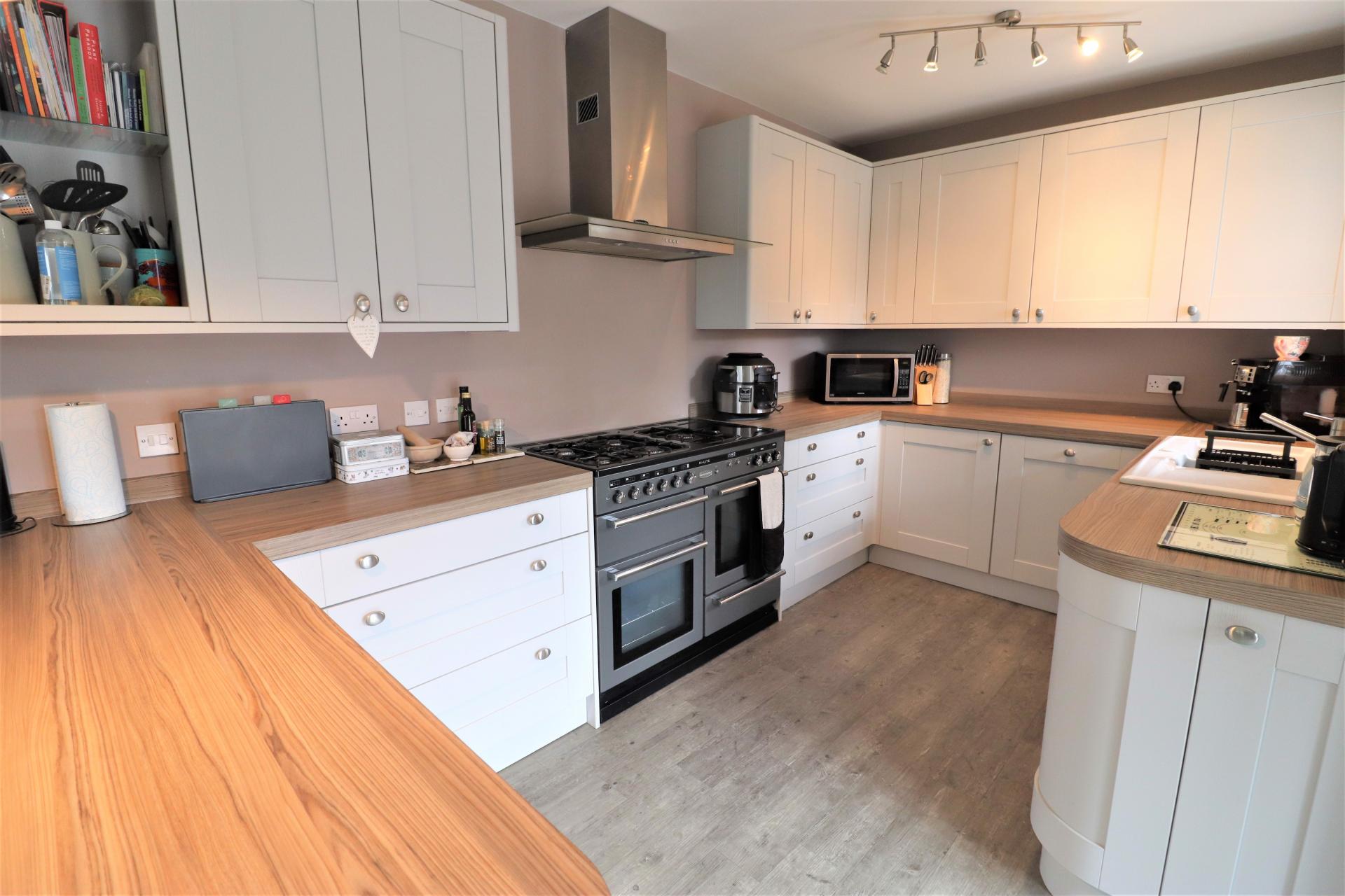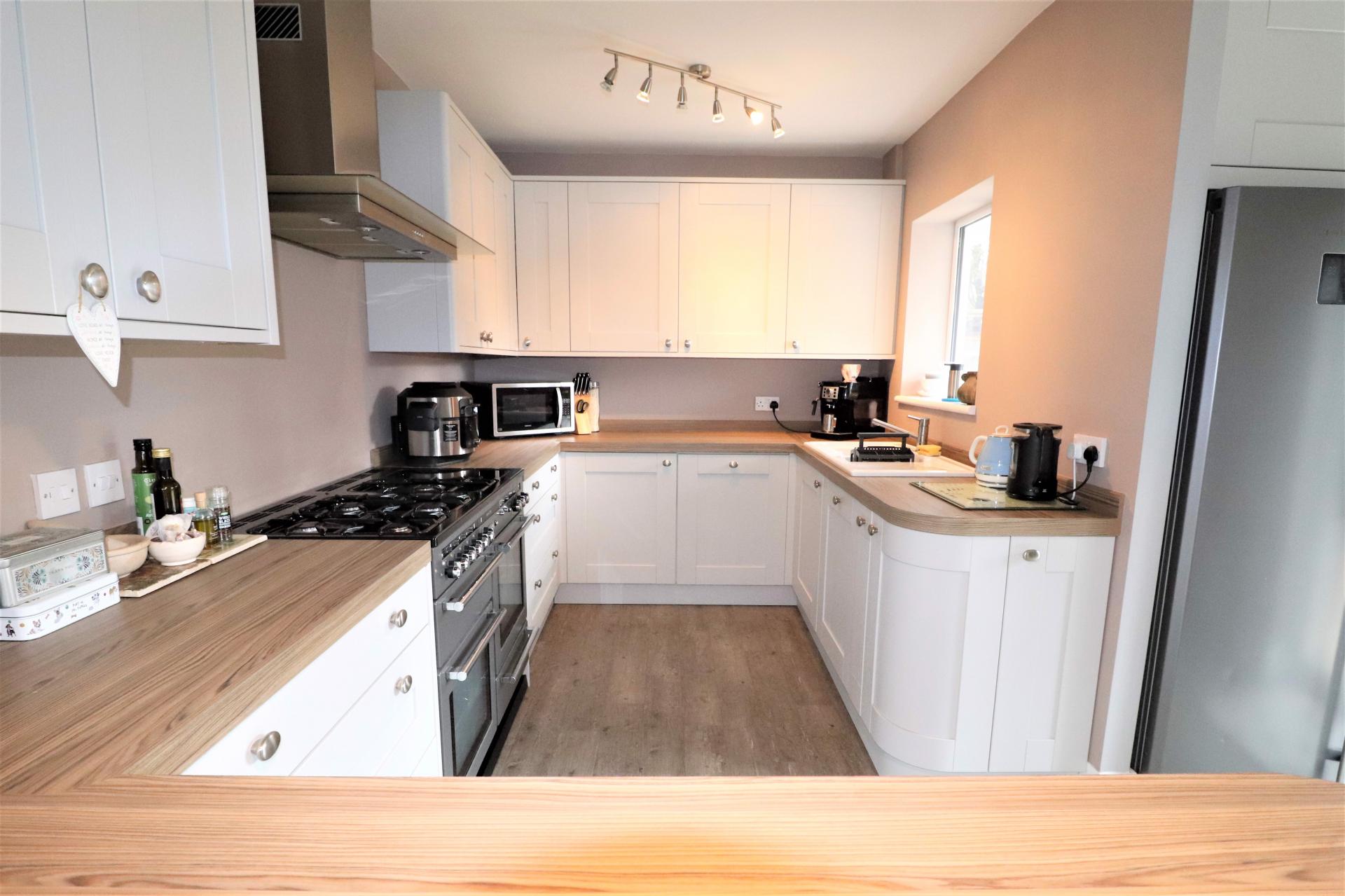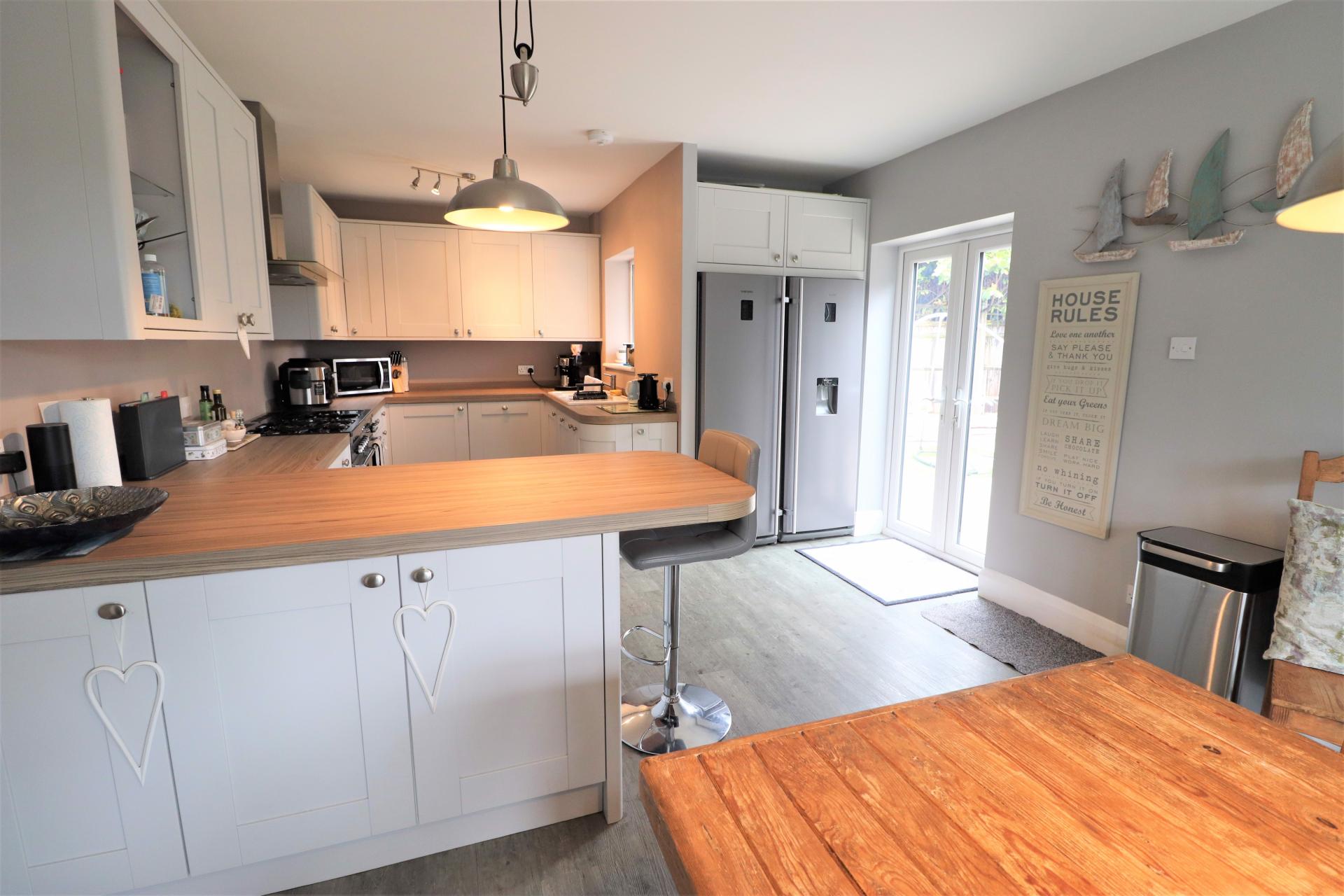 Double glazed bay window to the front. Double opening, Double glazed doors to the side. Double glazed window to the side. Worktops with inset one and a half bowl, single drainer sink unit with mixer tap. Range of base units and drawers with matching wall mounted cupboards. Breakfast bar. Space for a range cooker with a stainless steel and glass extractor hood over. Integrated dishwasher. Space for an American style fridge freezer. Single panel radiator.