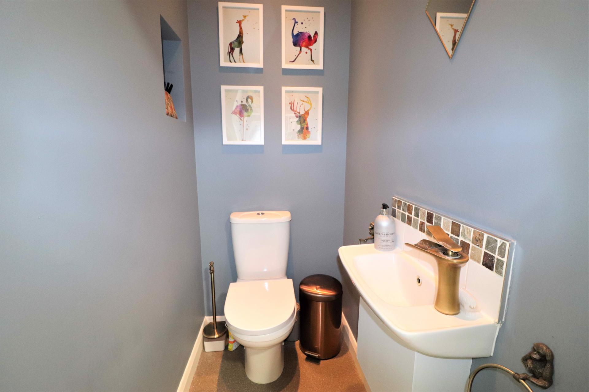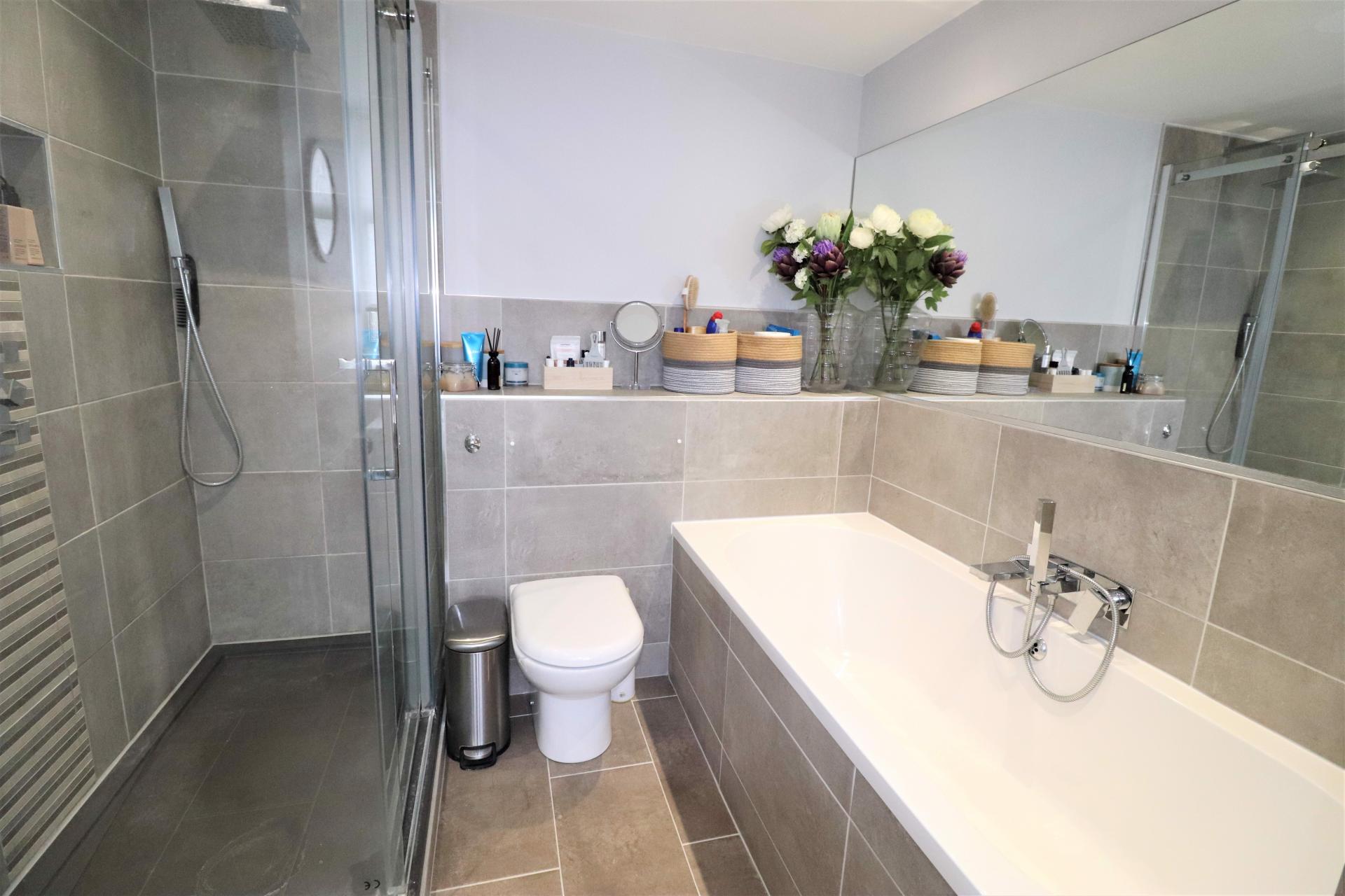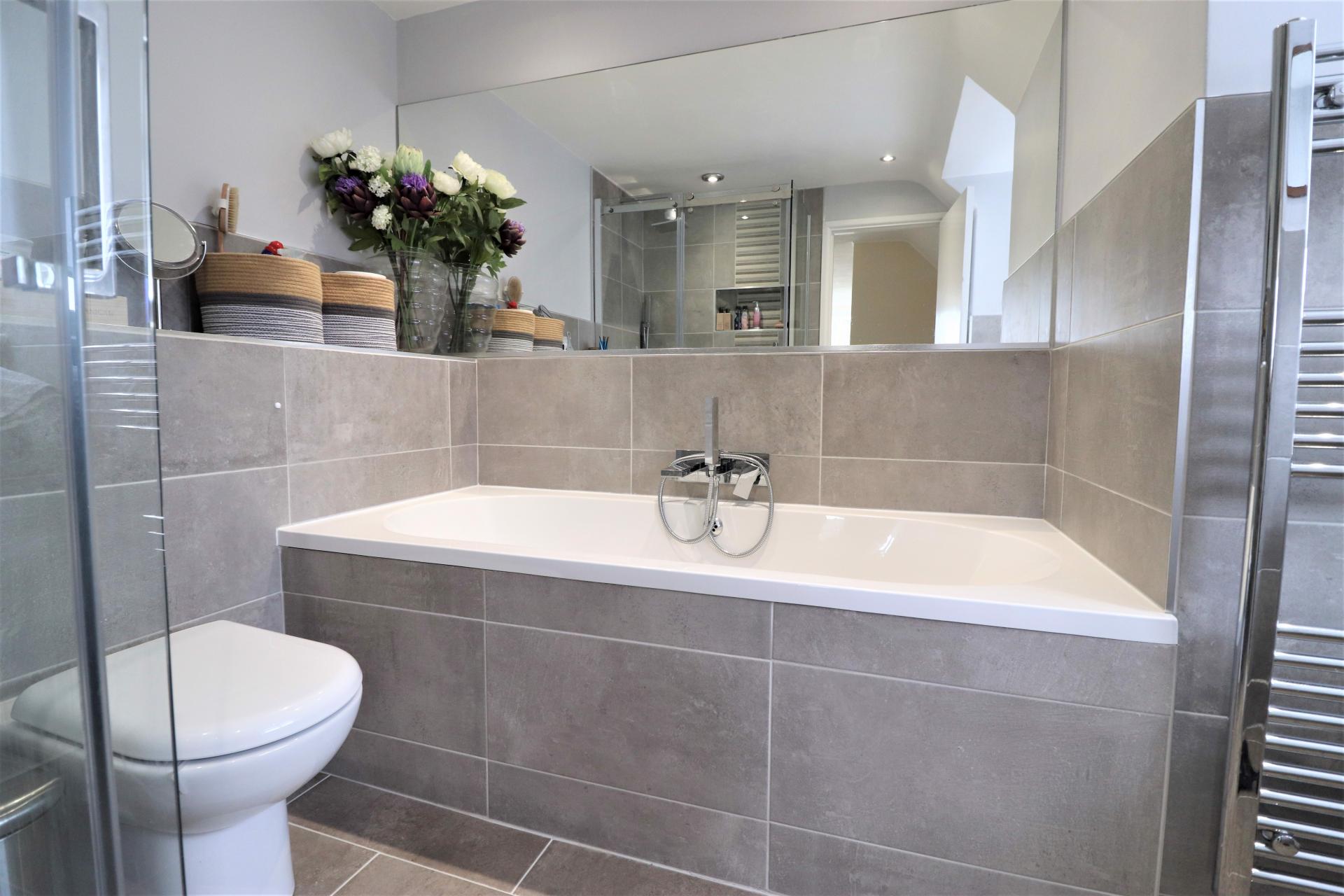 Par tiled with double glazed window to the side. Enclosed bath with mixer tap and hand held shower attachment. Double width shower cubicle with additional hand held shower attachment. Wash hand basin with vanity cupboard below. Low level WC. Heated towel rail.