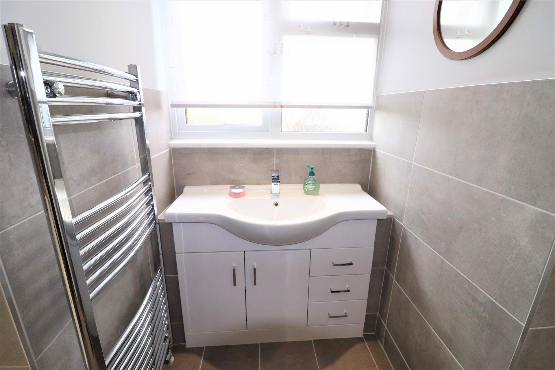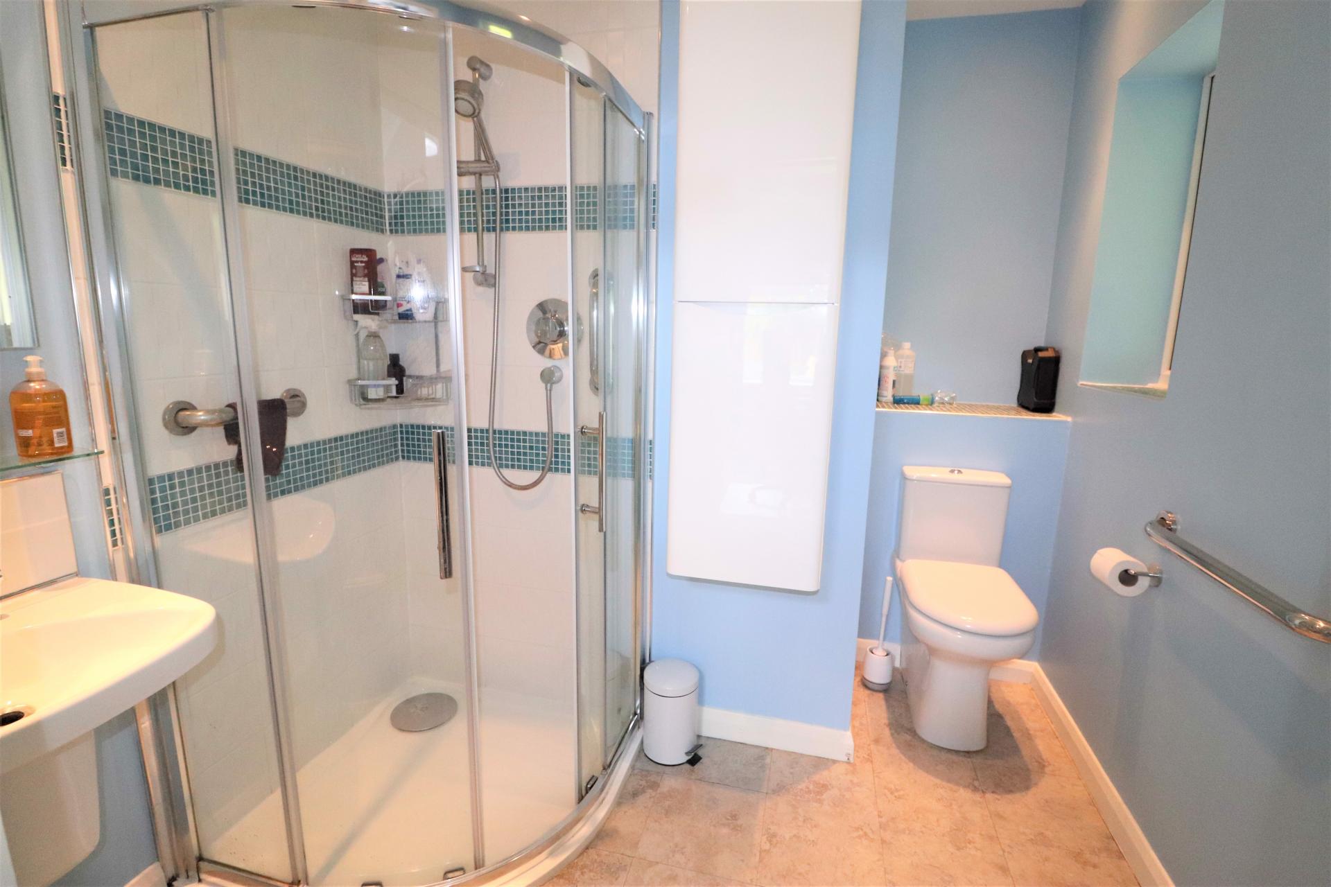 Two double glazed windows to the side. Glazed corner shower cubicle with wall mounted controls. Low level WC. Wash hand basin with tile splashback. Heated towel rail. Inset ceiling spot lights.