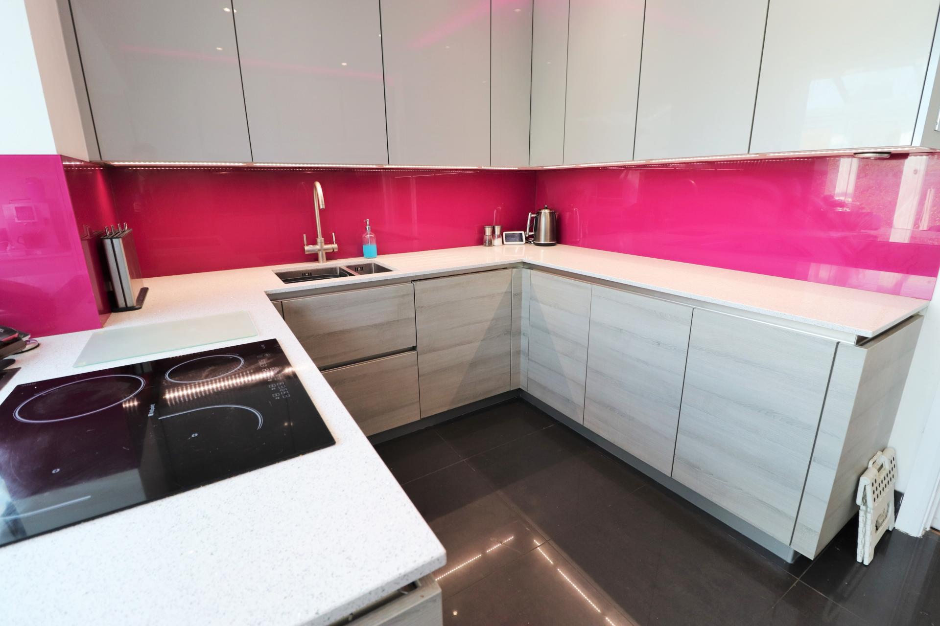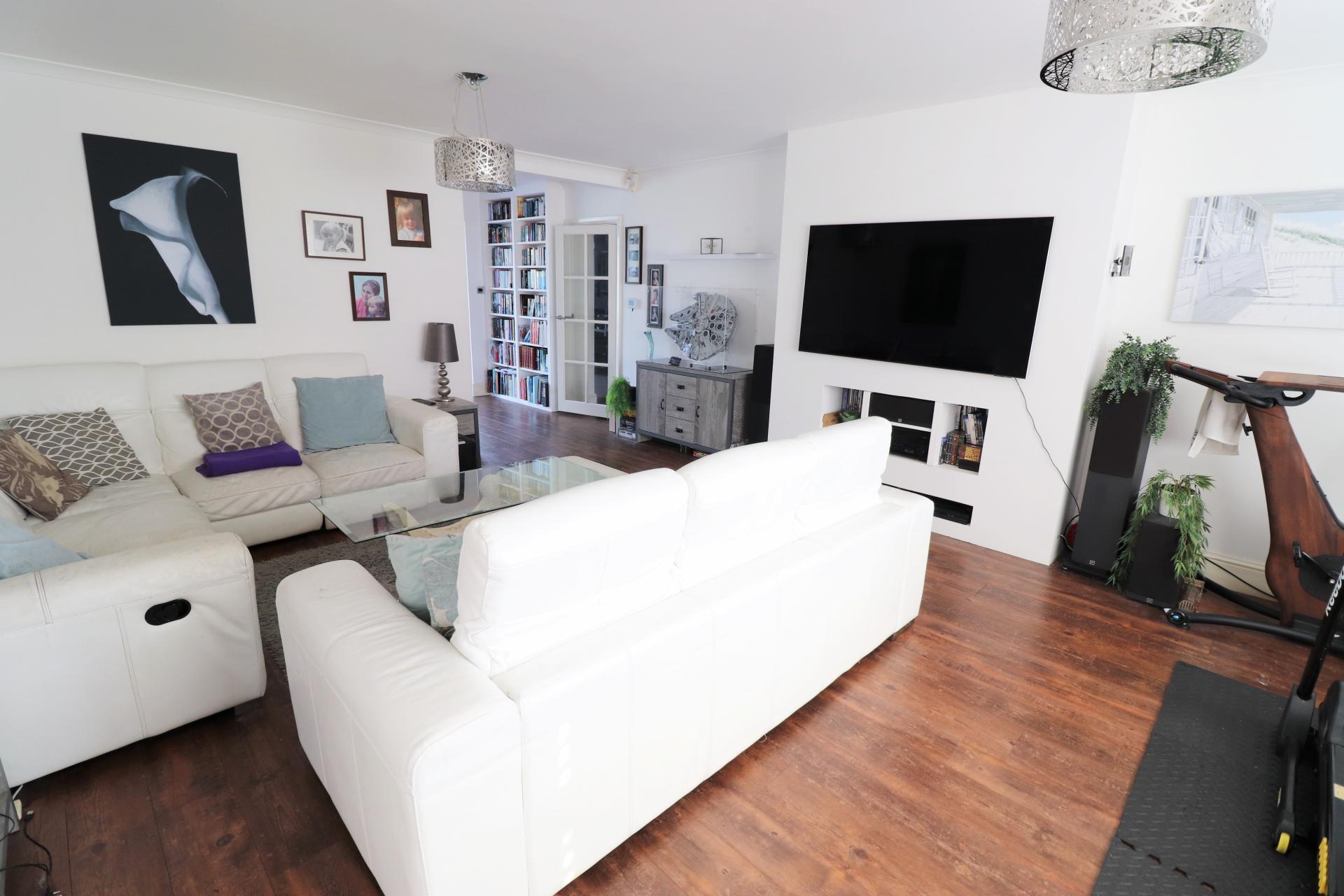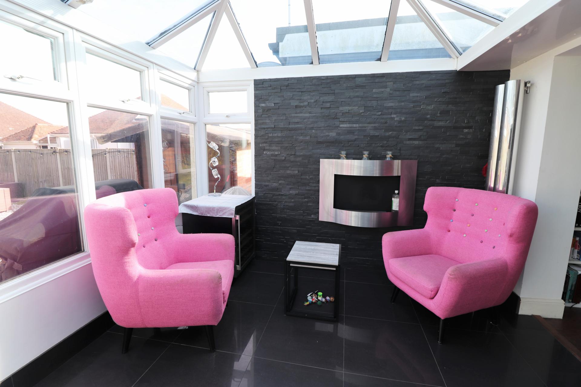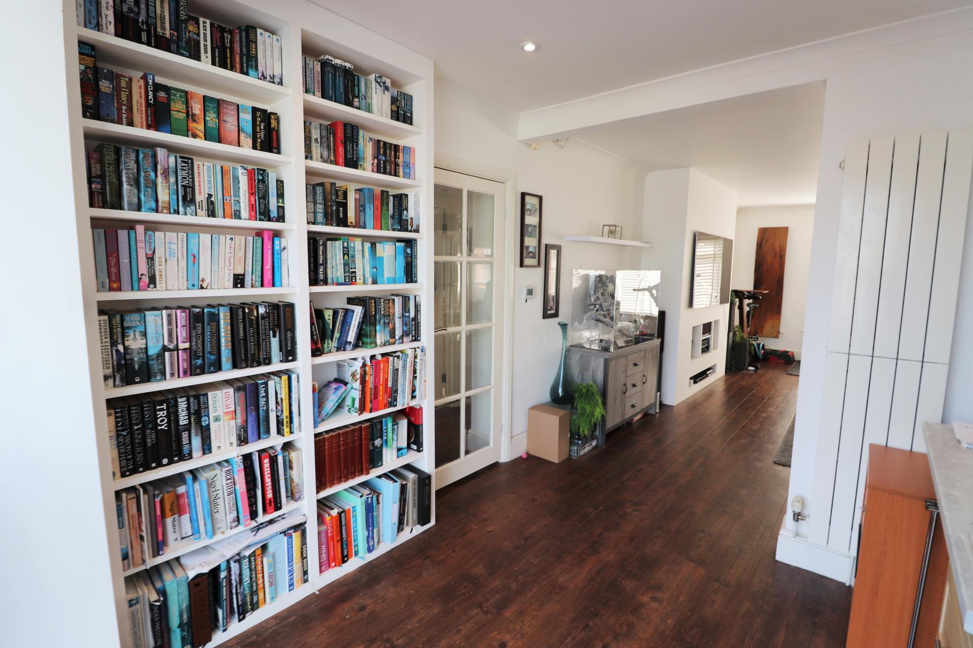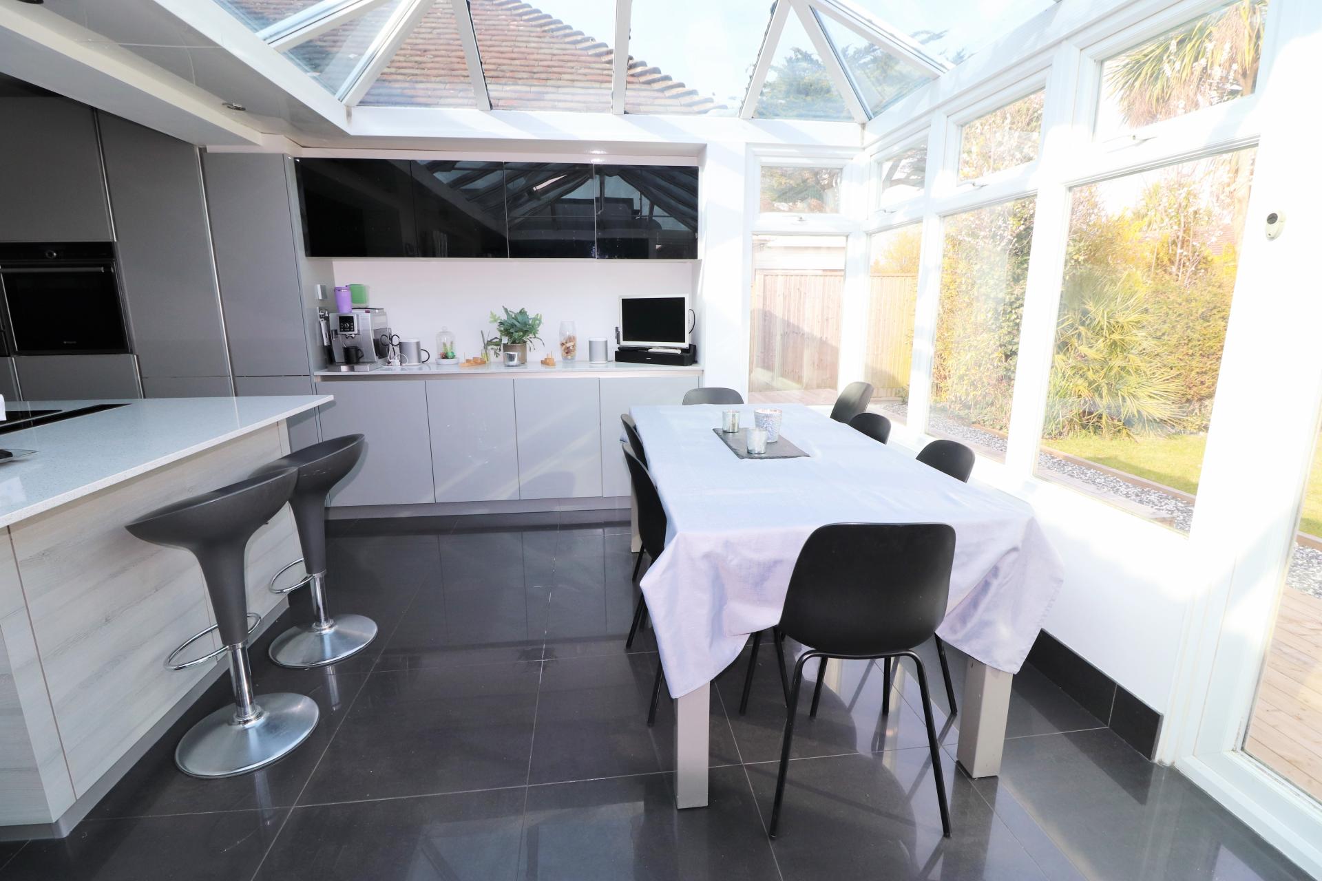 Open plan with the kitchen with double opening double glazed doors to the rear garden. Additional double glazed windows to three sides. Wall mounted ornamental stainless steel fireplace. Bespoke radiator.