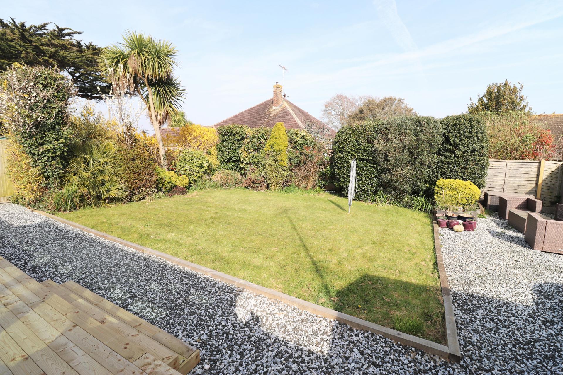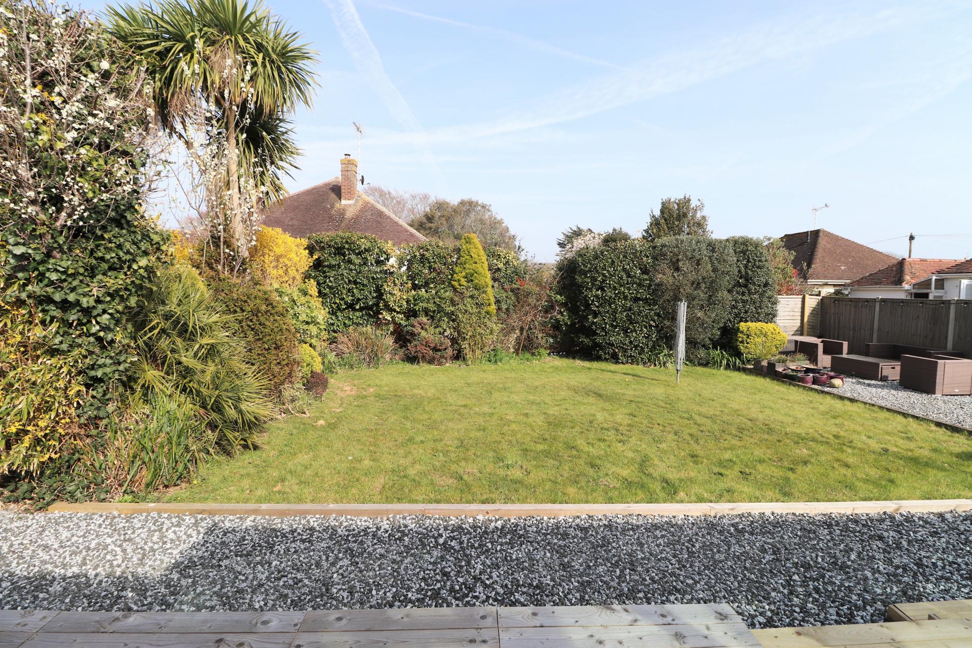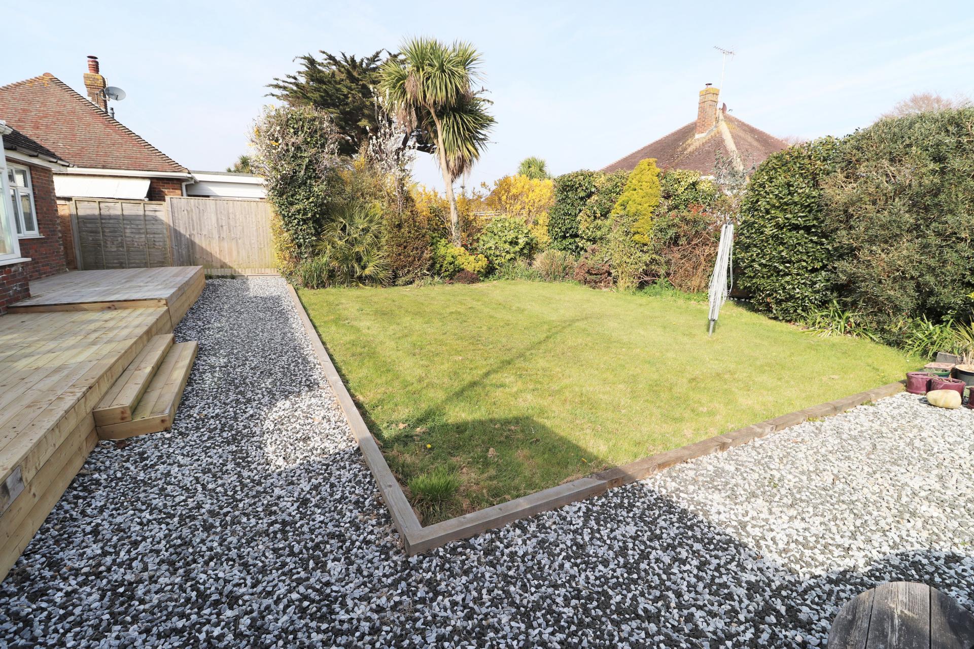 Extensive area of decking across the back. Lawn with mature trees and shrub borders. Additional seating area. Gate giving side access.