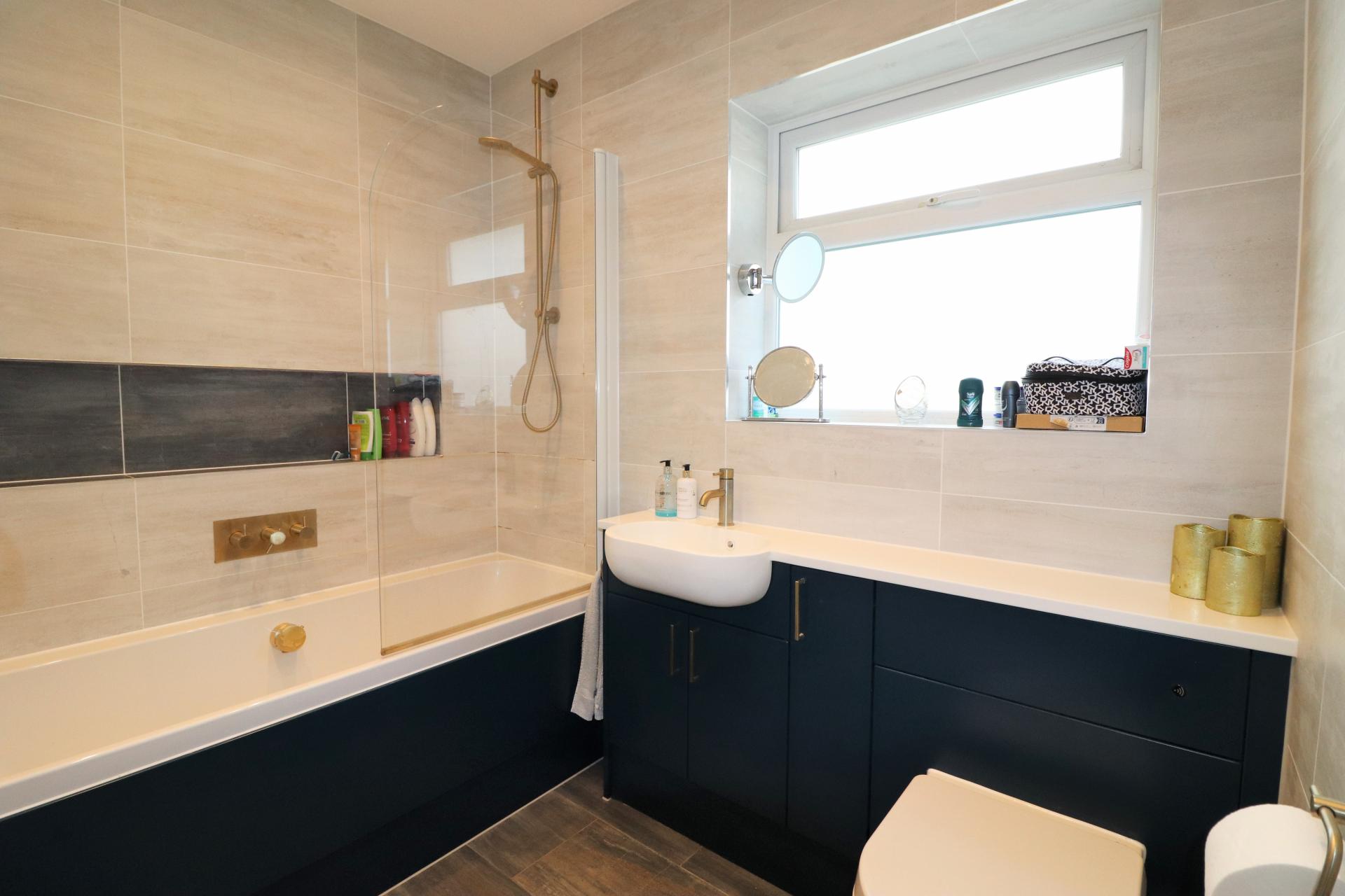 Double glazed window to the side. Panel enclosed bath with shower unit over. Wash hand basin with vanity cupboard below. Low level WC. Vertical radiator. Inset ceiling spot lights.