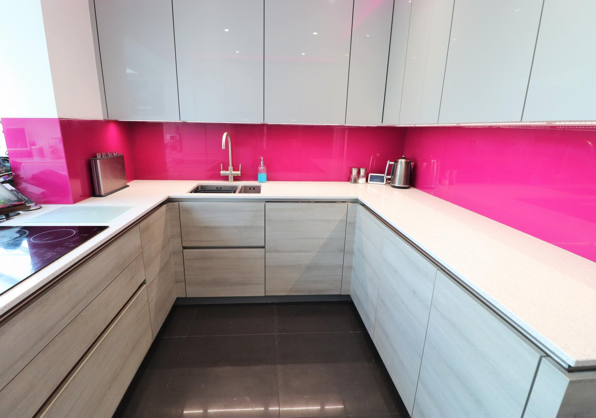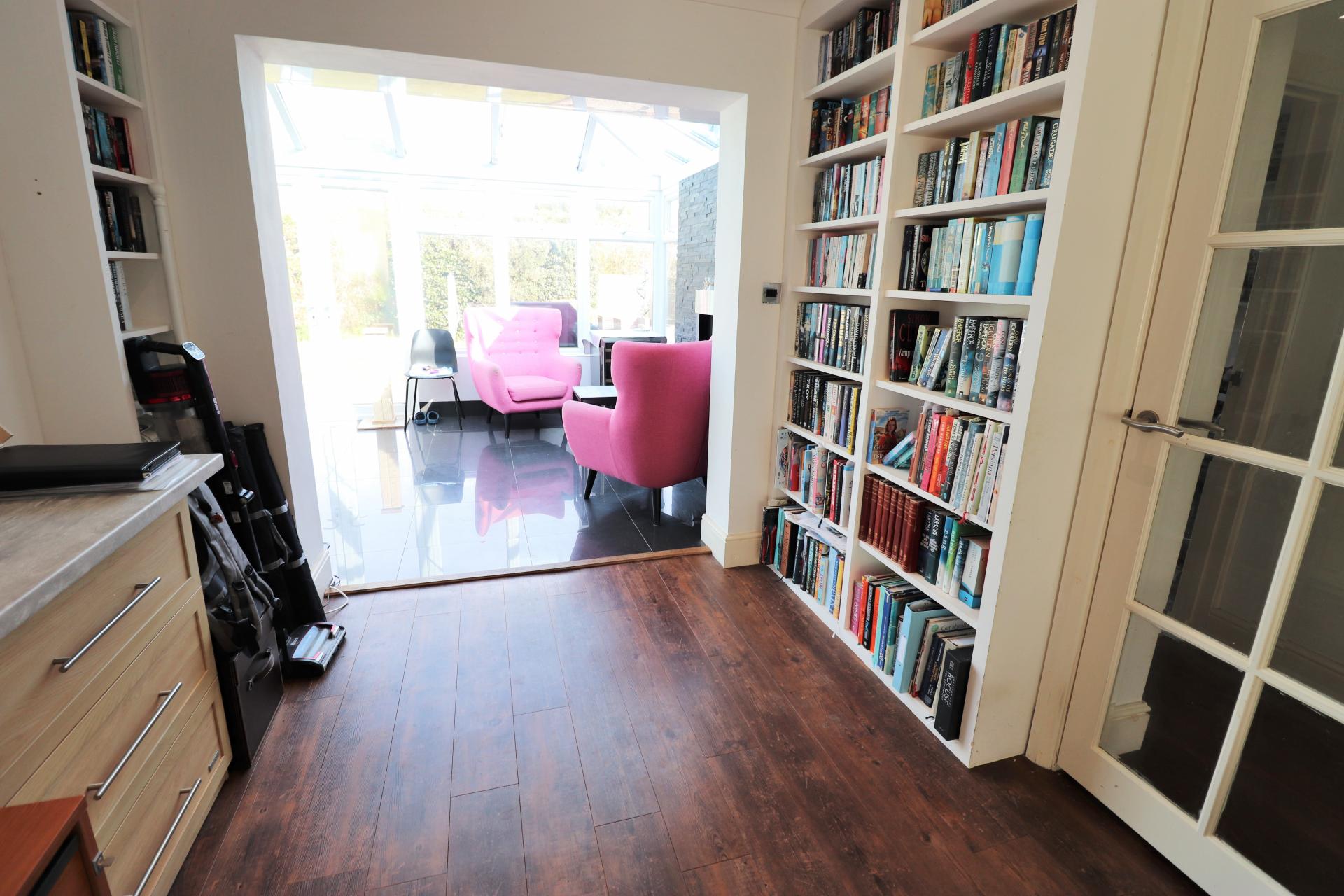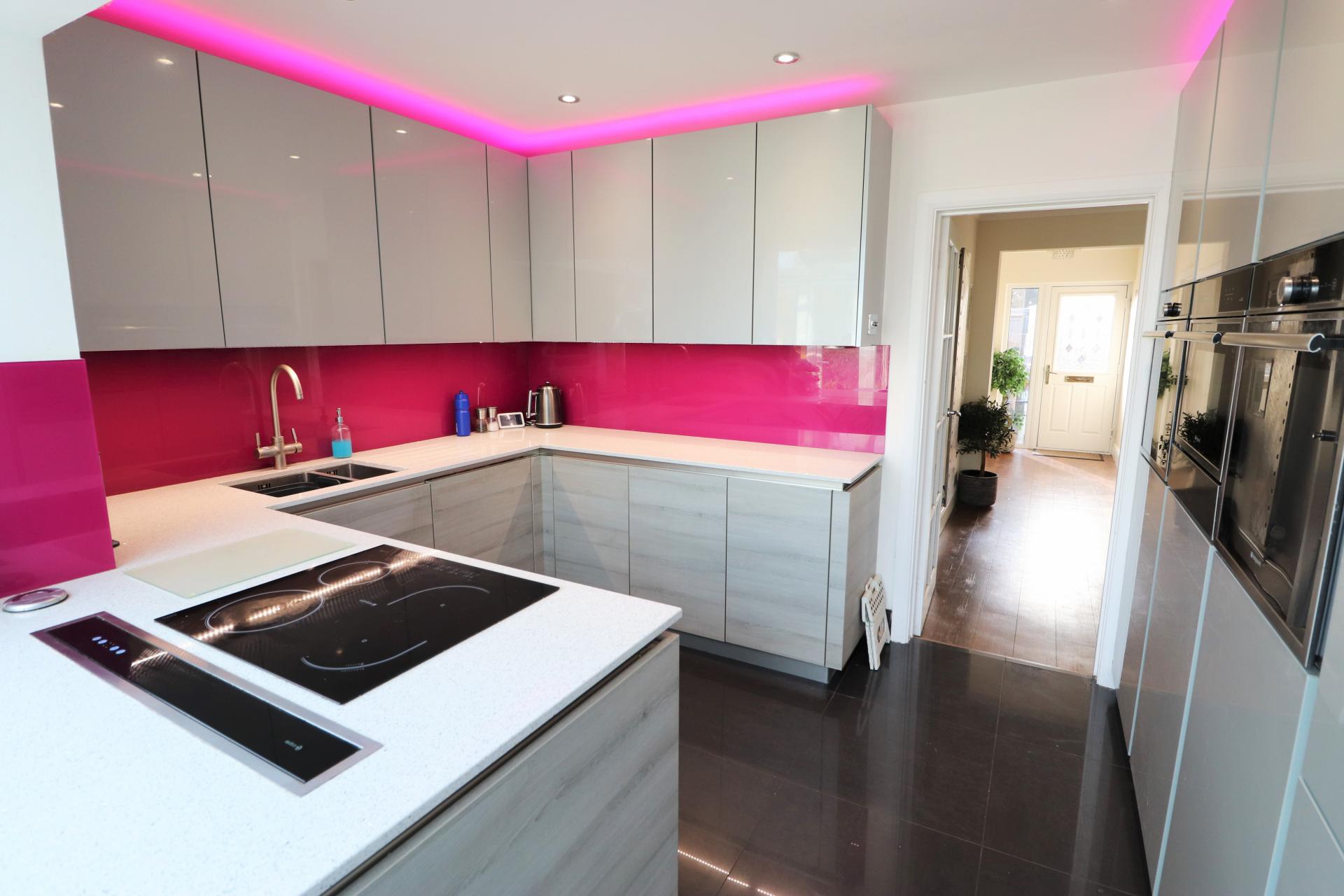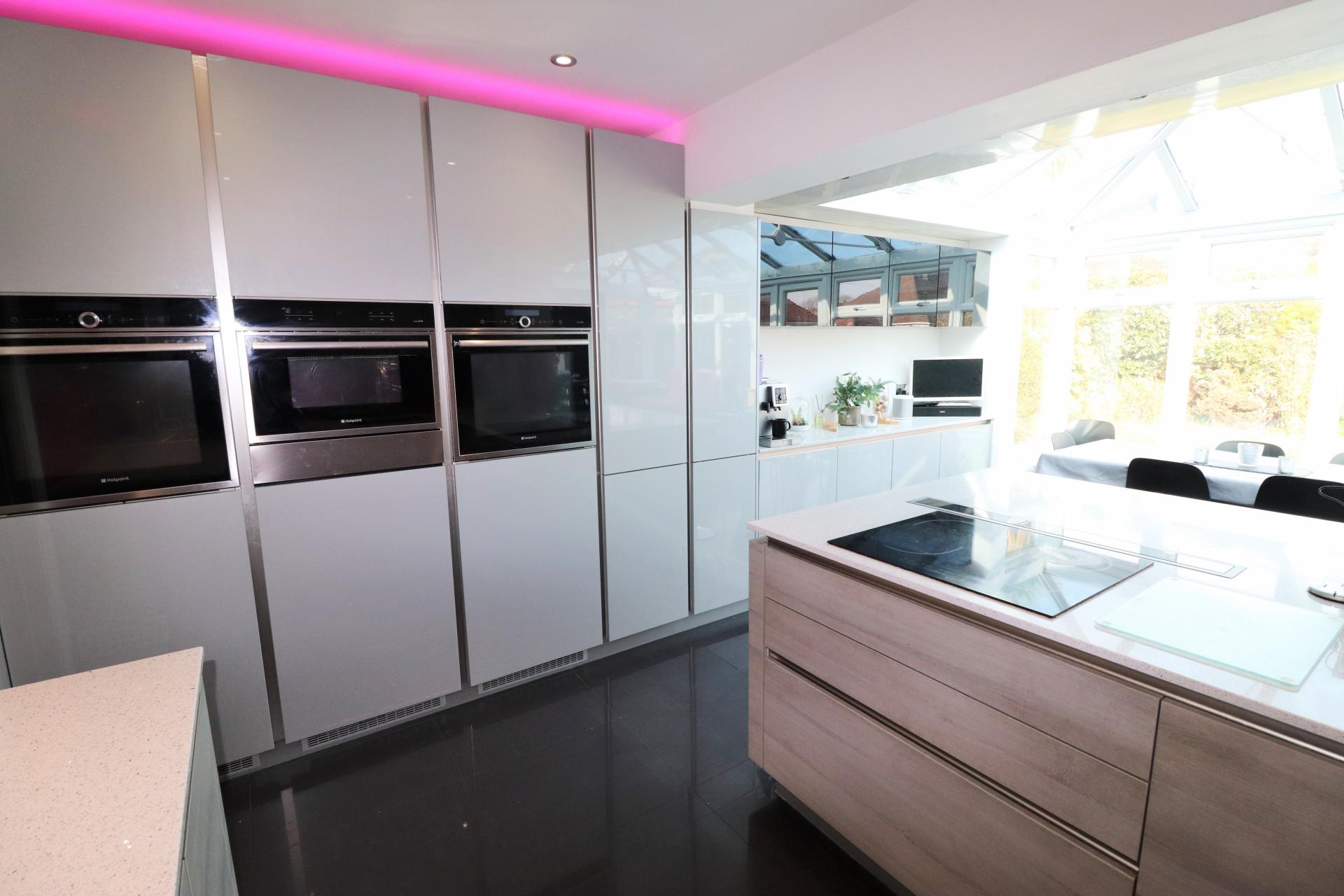 Open plan with the conservatory. Worktops with inset one and half bowl, single drainer sink with mixer tap. Range of base units and drawers with matching wall mounted cupboards including glazed display cabinets. Bespoke coloured splashbacks and concealed lighting. Breakfast bar. Triple fitted ovens. Four ring induction hob. Two Integrated fridges. Integrated dishwasher. Inset ceiling spot lights.