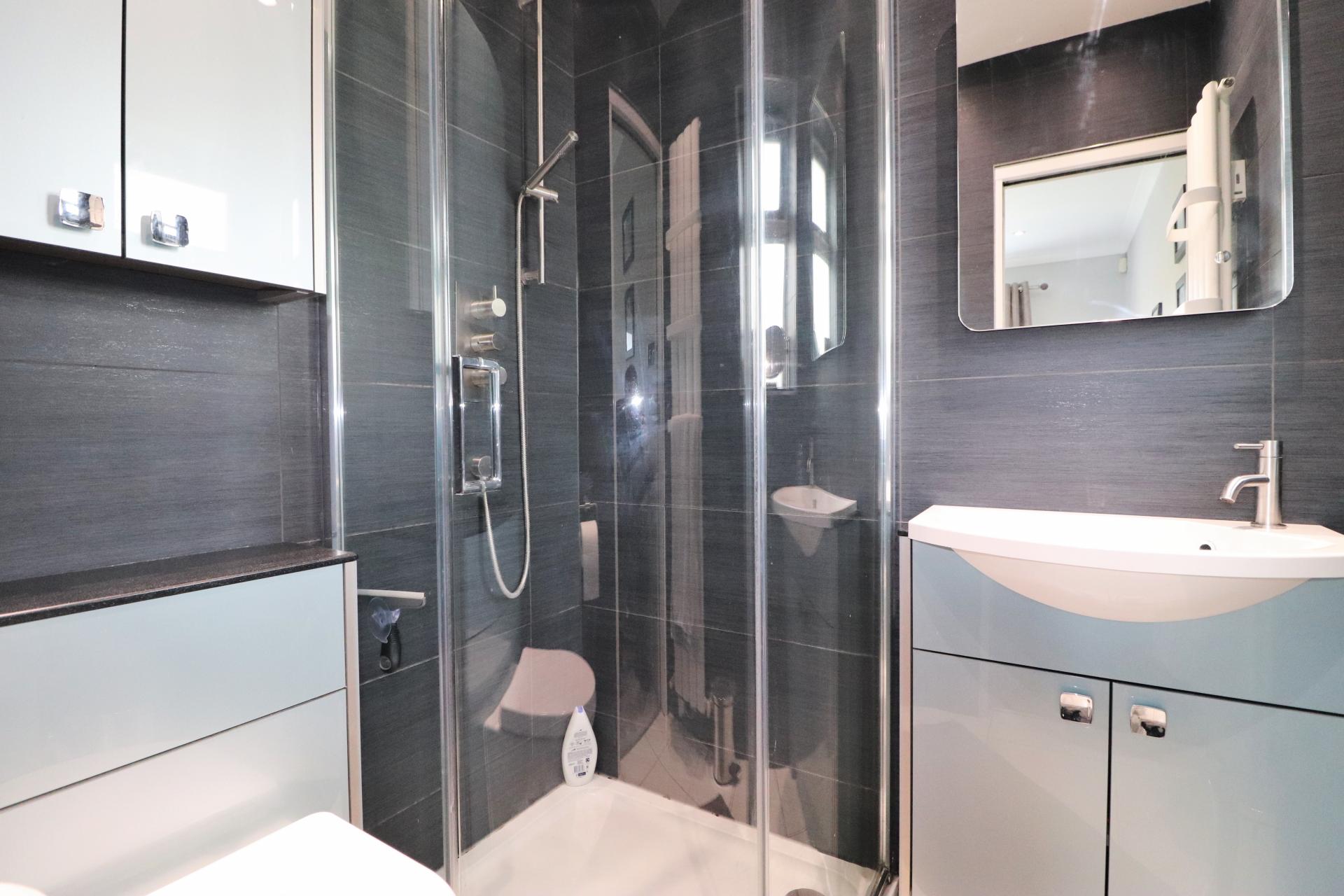 Double glazed window to the side. Corner shower cubicle. Wash hand basin with vanity cupboard below. Low level WC. Vertical radiator. Inset ceiling spot lights.