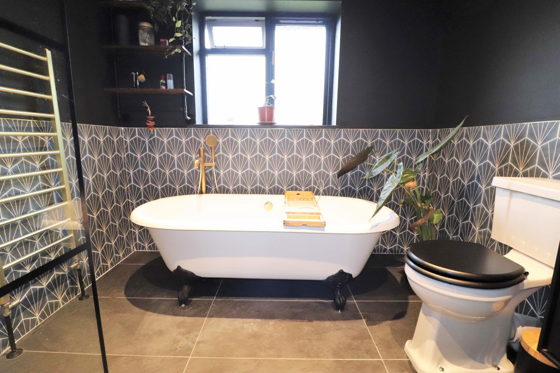 A London boutique hotel style bathroom with a double glazed window to the rear. Feature roll top and claw feet bath with mixer tap and separate hand held shower attachment. Walk in shower area with glazed panel divide. Bowl wash hand basin with drawer below. Low level WC. Inset ceiling spotlights.