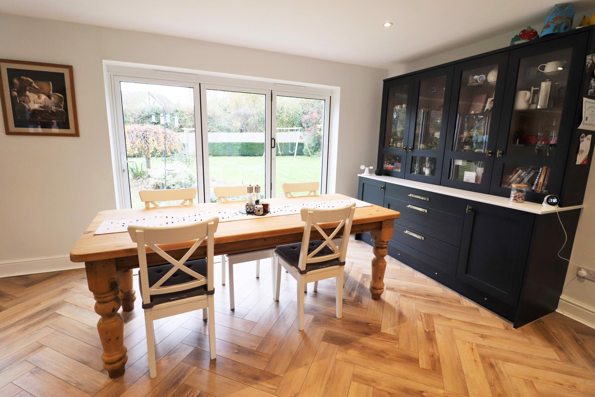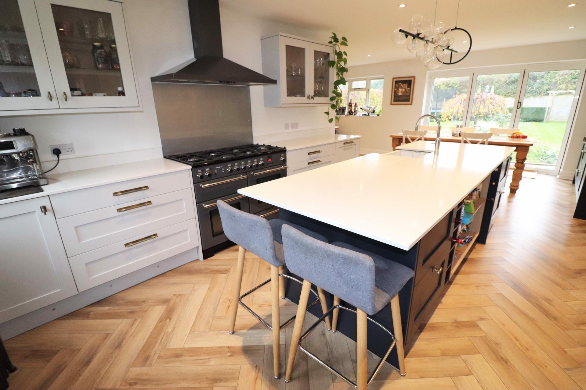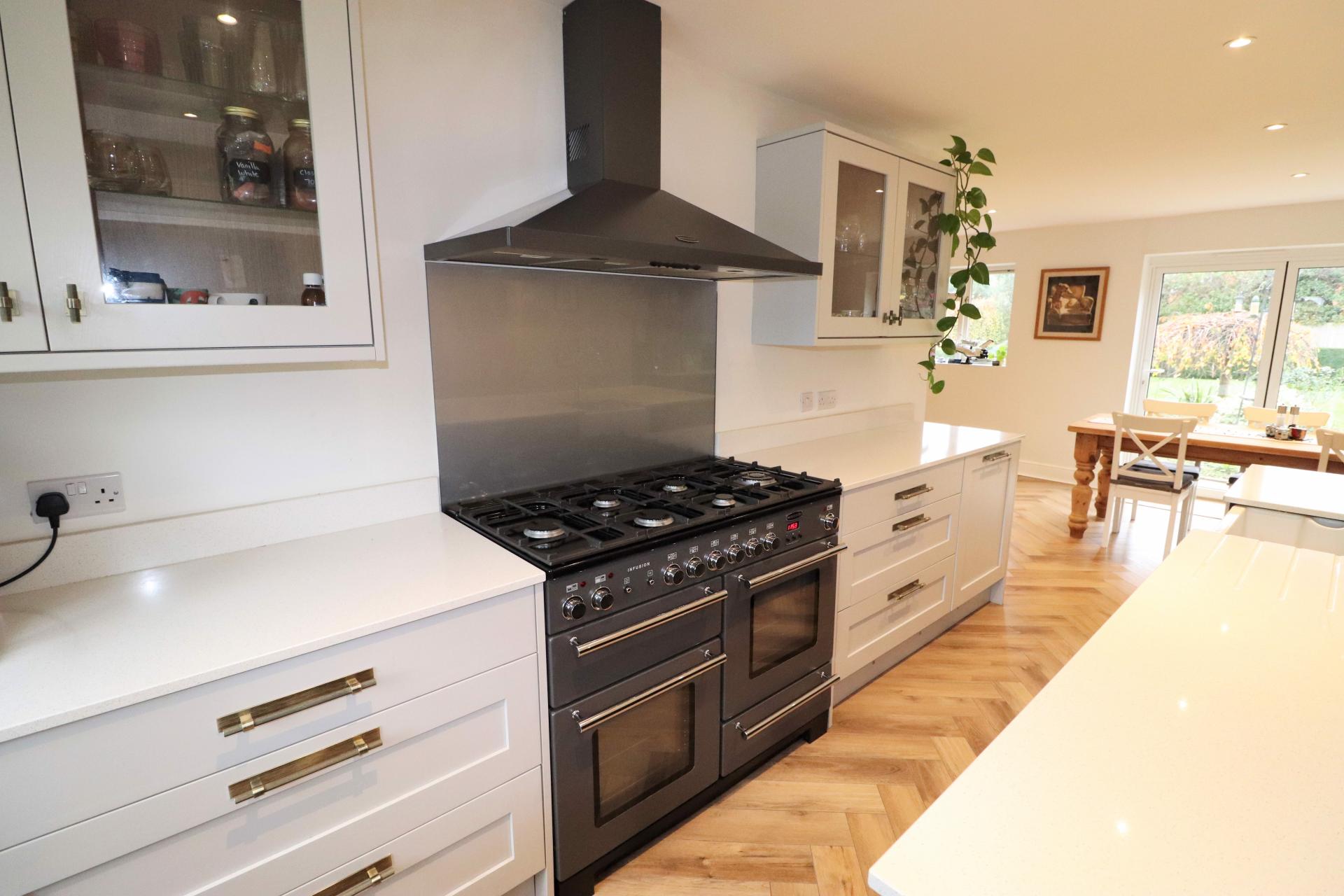 Double glazed bifold doors leading to the rear garden. Two leaded light double glazed windows to the front. Feature centre island with quartz worktop, inset butler sink with instant hot and cold filter water tap, a range of cupboards and drawers, integrated dishwasher and a wine cooler. There are also additional quartz worktops with matching base units, drawers and wall mounted glass fronted display cabinets. Dresser with cupboards and drawers below and glass fronted display cabinets above. 6 ring range oven with double extractor hood over. Integrated microwave. Space and plumbing for an American style fridge freezer. Two vintage style radiators. Inset ceiling spotlights.