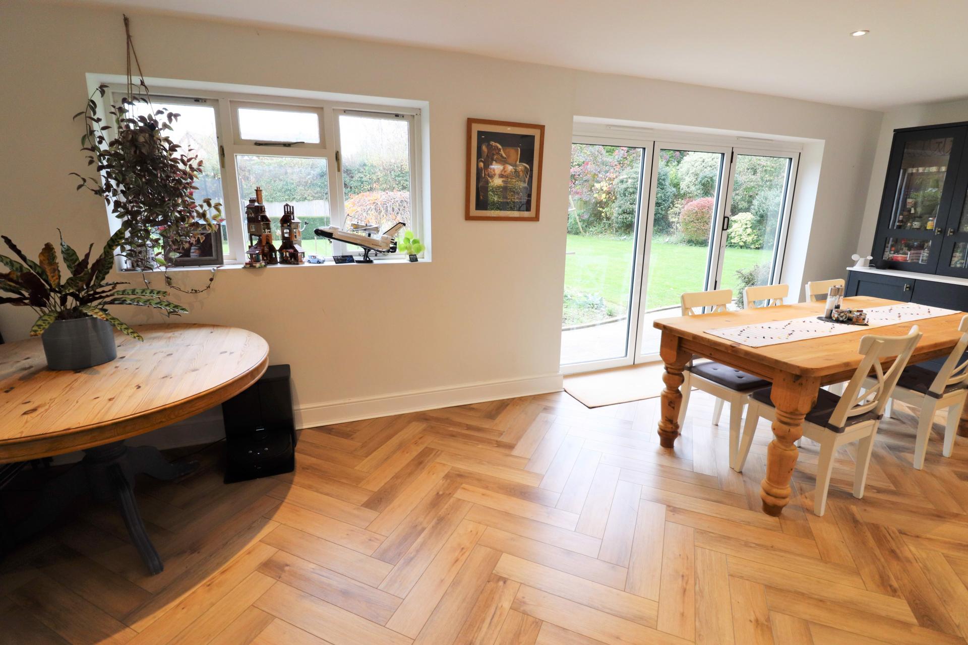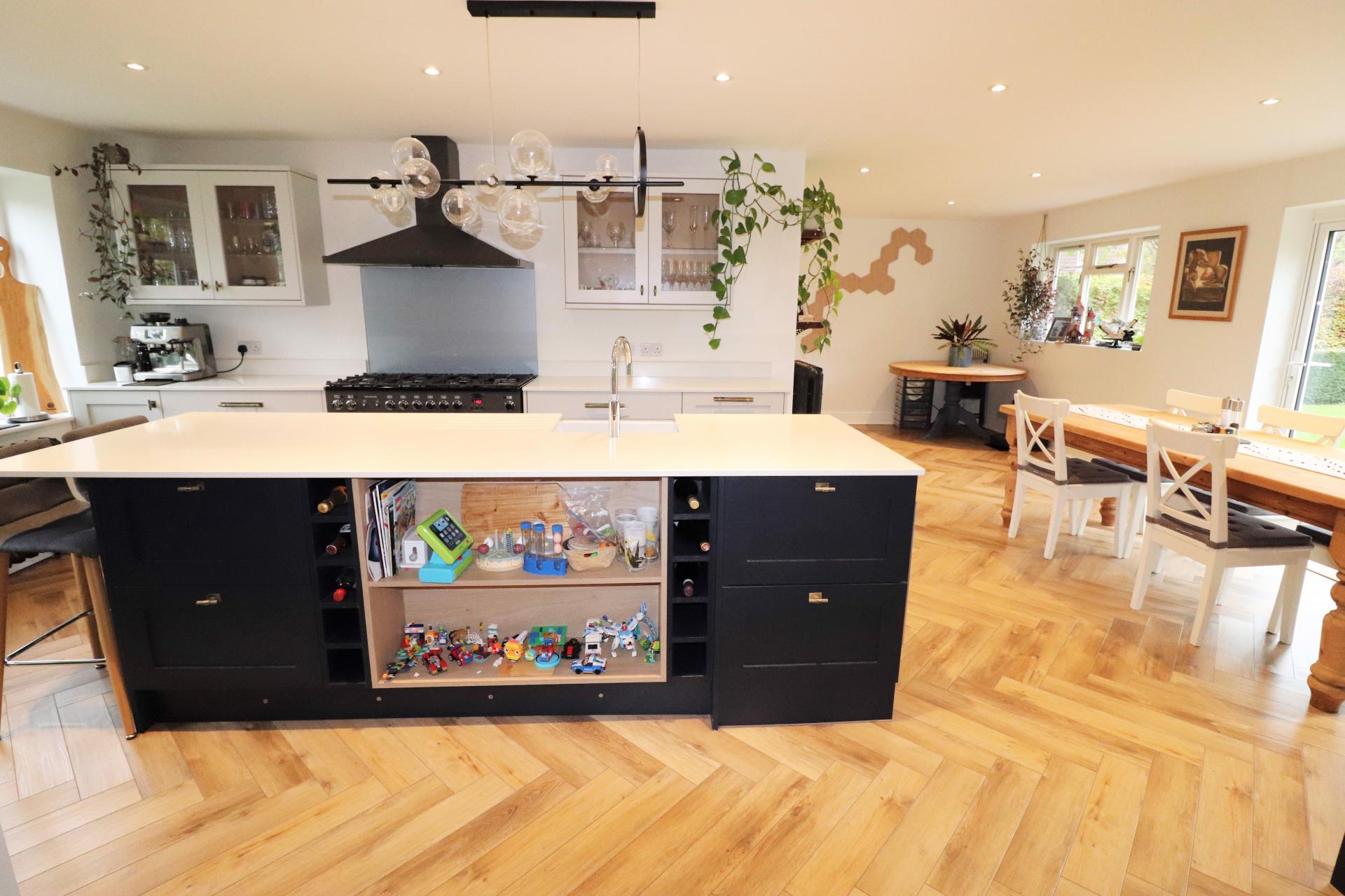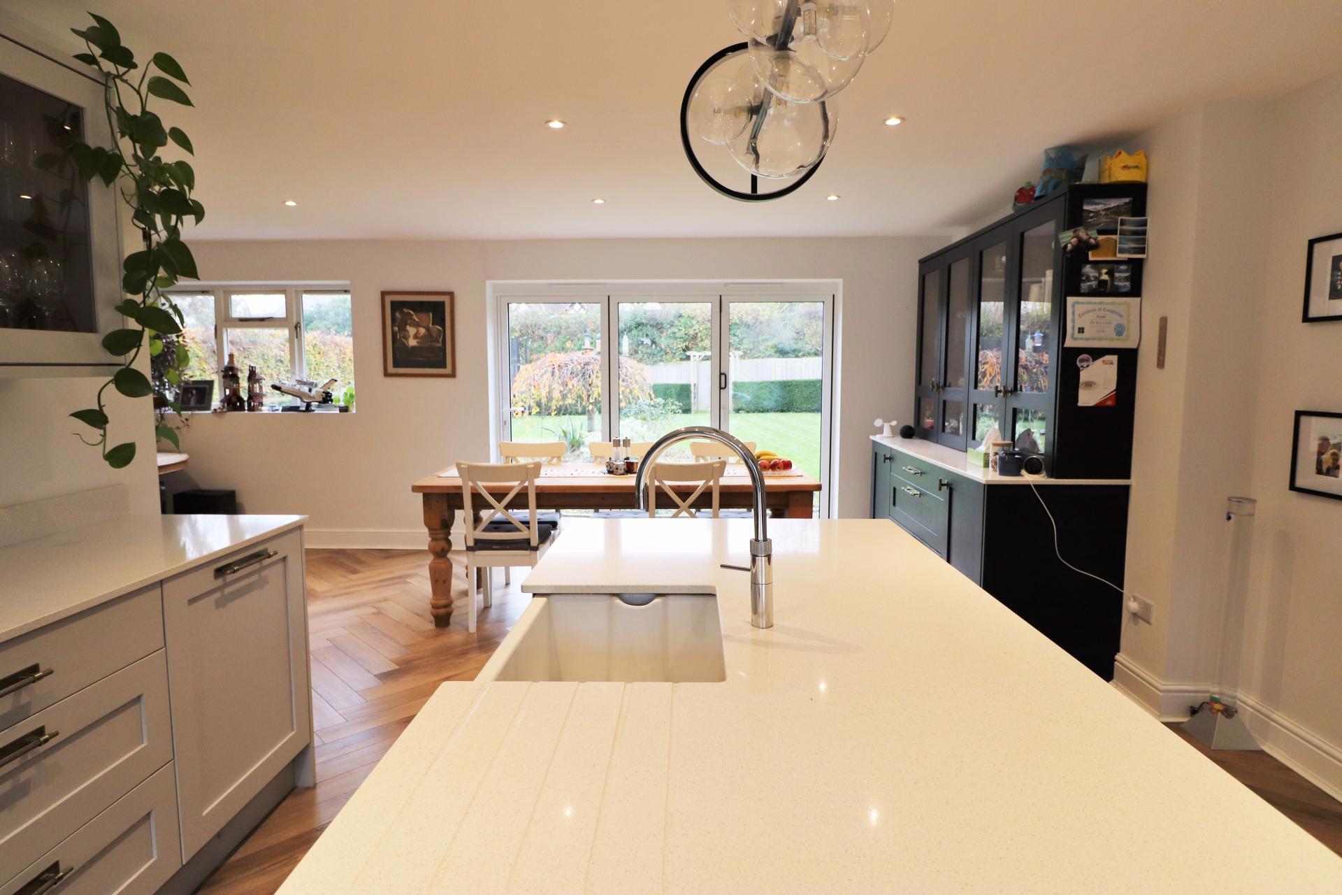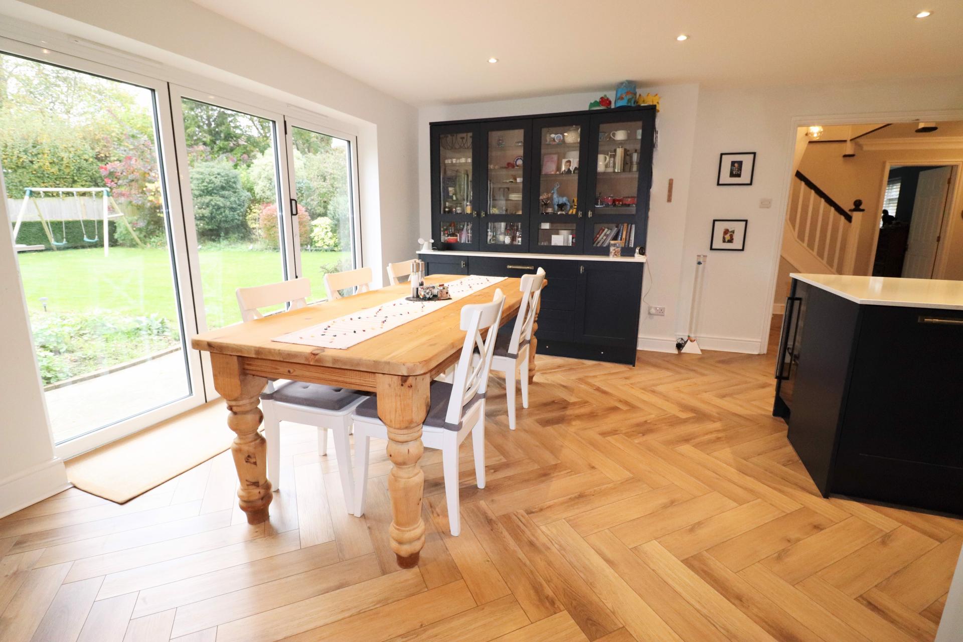 Double glazed bifold doors leading to the rear garden. Two leaded light double glazed windows to the front. Feature centre island with quartz worktop, inset butler sink with instant hot and cold filter water tap, a range of cupboards and drawers, integrated dishwasher and a wine cooler. There are also additional quartz worktops with matching base units, drawers and wall mounted glass fronted display cabinets. Dresser with cupboards and drawers below and glass fronted display cabinets above. 6 ring range oven with double extractor hood over. Integrated microwave. Space and plumbing for an American style fridge freezer. Two vintage style radiators. Inset ceiling spotlights.