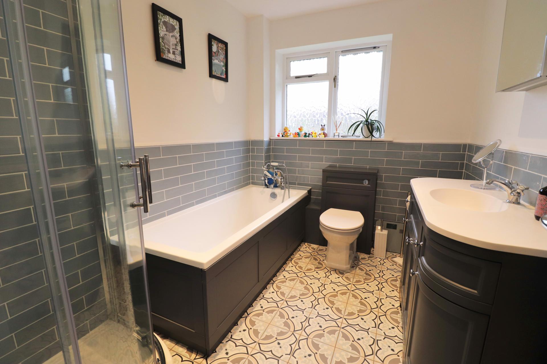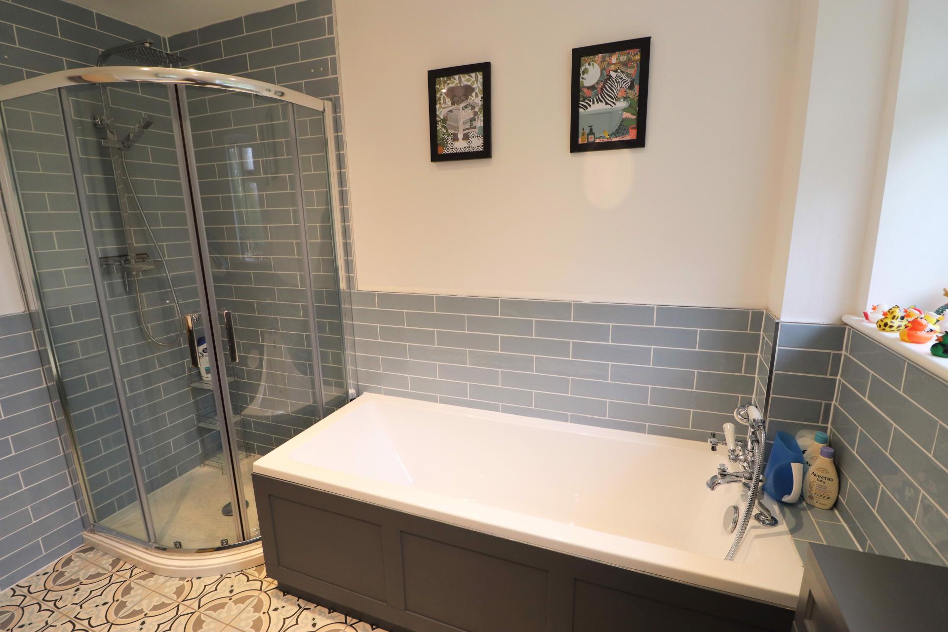 Double glazed window to the rear. Panel enclosed bath with mixer tap and telephone style hand held shower attachment. Corner shower cubicle with wall mounted controls and separate hand held shower attachment. Wash hand basin with cupboards and drawers below. Low level WC. Heated towel rail. Inset ceiling spotlights.