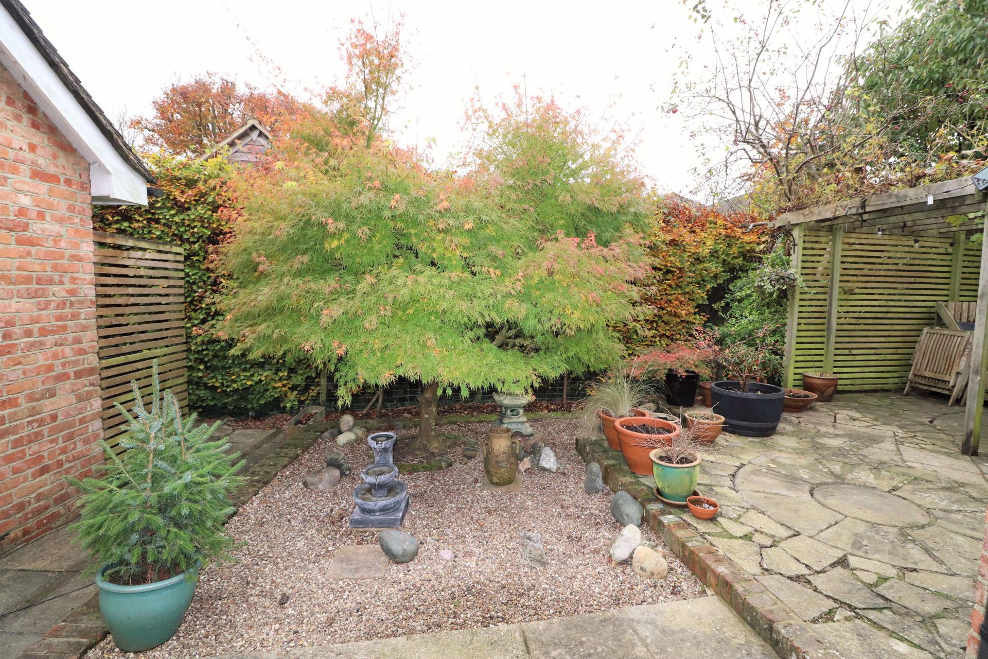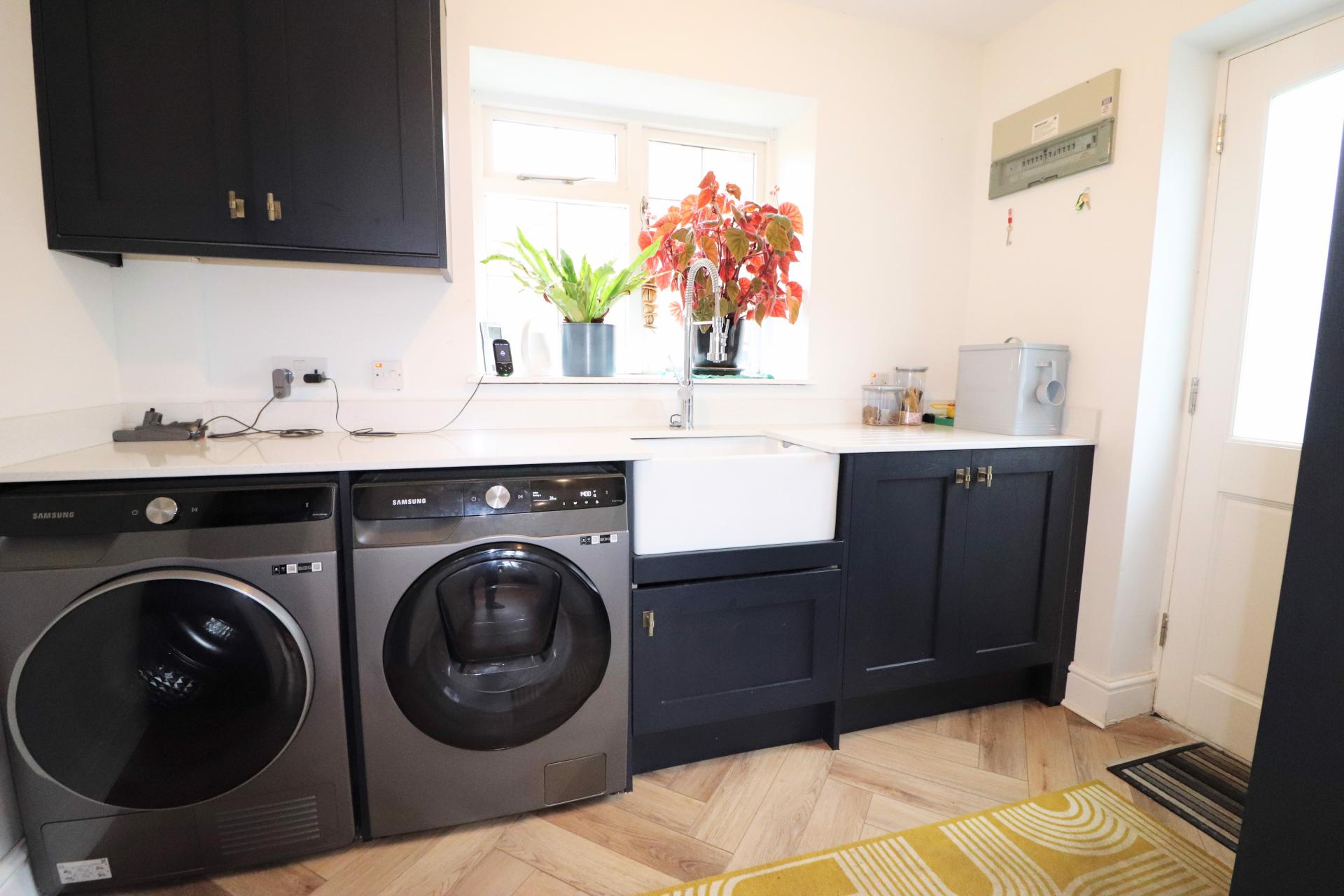 Leaded light double glazed window to the front. Double glazed door to the side. Quartz worktop with inset butler sink with mixer tap. Space and plumbing for a washing machine and tumble dryer. Range of storage cupboards. Boiler (recently replaced). Loft access.