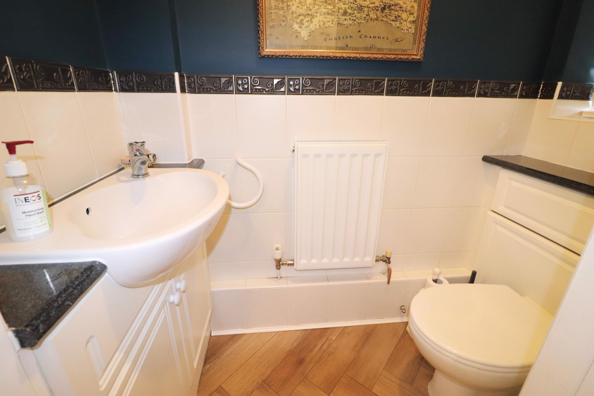 Leaded light double glazed window to the front. Low level WC. Wash hand basin with vanity cupboard below. Double panel radiator.