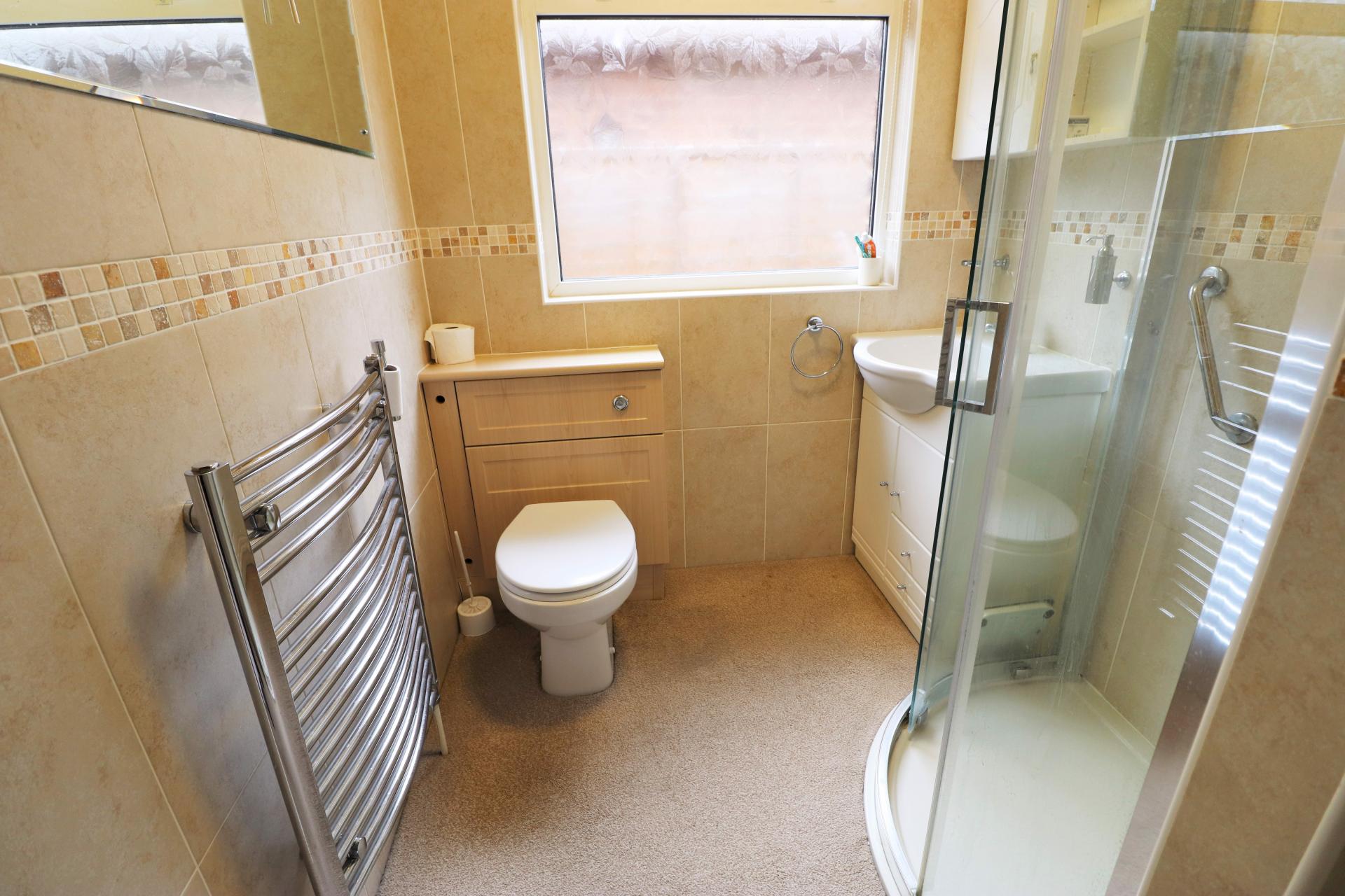 Double glazed window to the side. Corner shower cubicle with wall mounted controls. Wash hand basin with vanity cupboard and drawers below. Low level WC. Airing cupboard. Wall mounted electric heater. Two heated towel rails.
