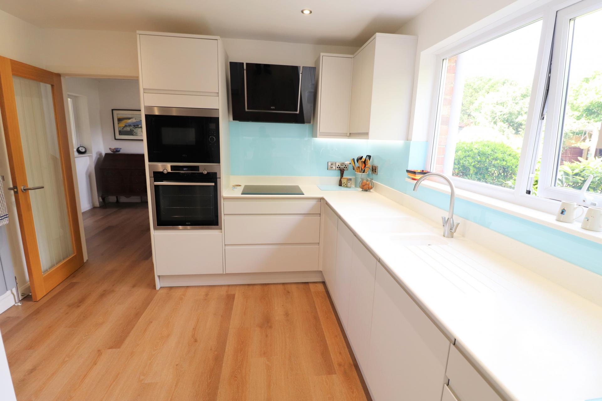 Double glazed window to the rear. Roll edge worktops with inset one and half bowl, single drainer sink unit with mixer tap. Range of base units and drawers with matching wall mounted cupboards. Built in over and microwave. Four ring hob with extractor unit over. Space for an American style fridge freezer. Vertical radiator. Inset ceiling spot lights.