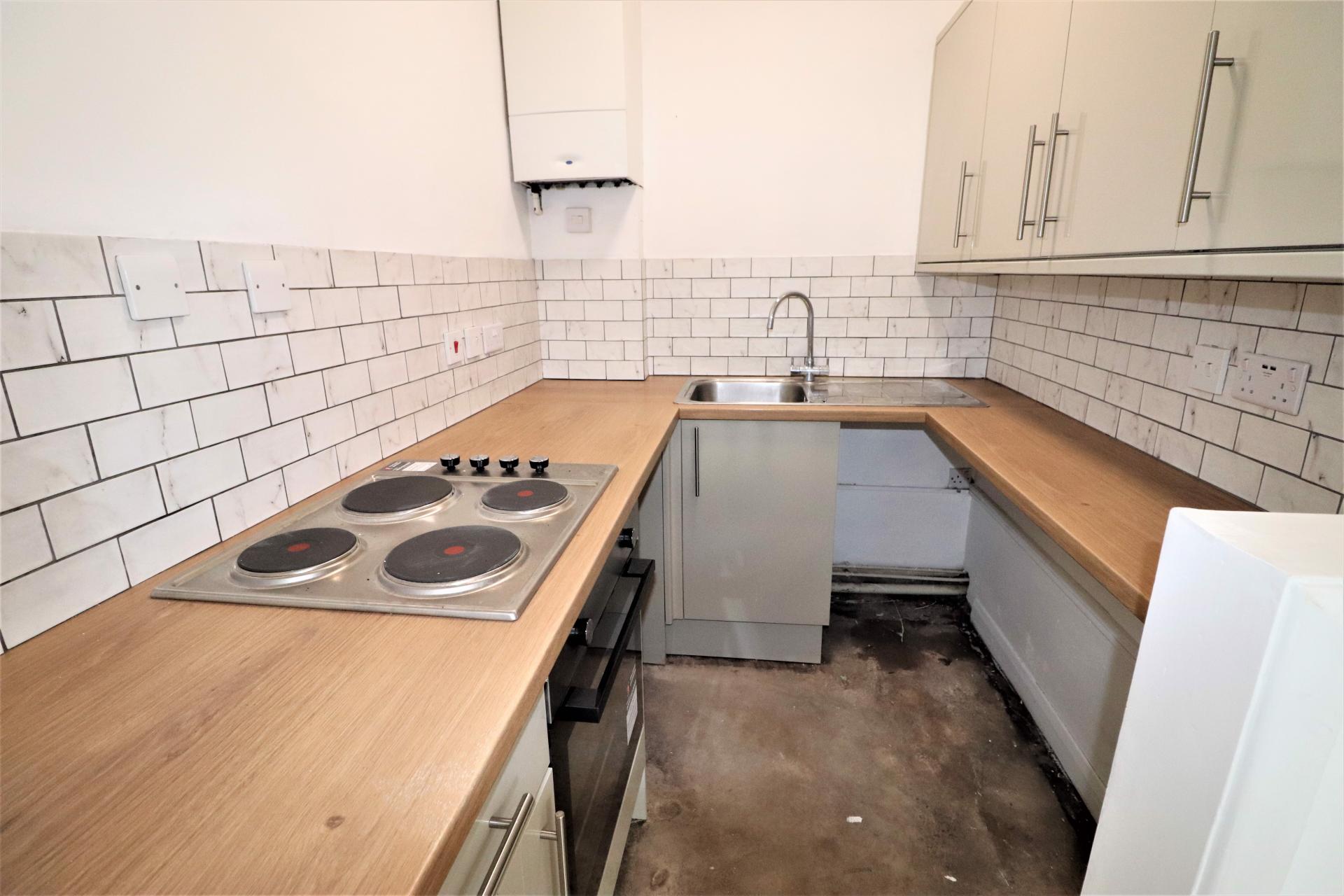 Roll edge worktop with inset stainless steel, single bowl, single drainer sink unit with mixer tap. Range of base units and drawer with matching wall mounted cupboards. Space and plumbing for washing machine. Space for fridge. Wall mounted gas boiler.