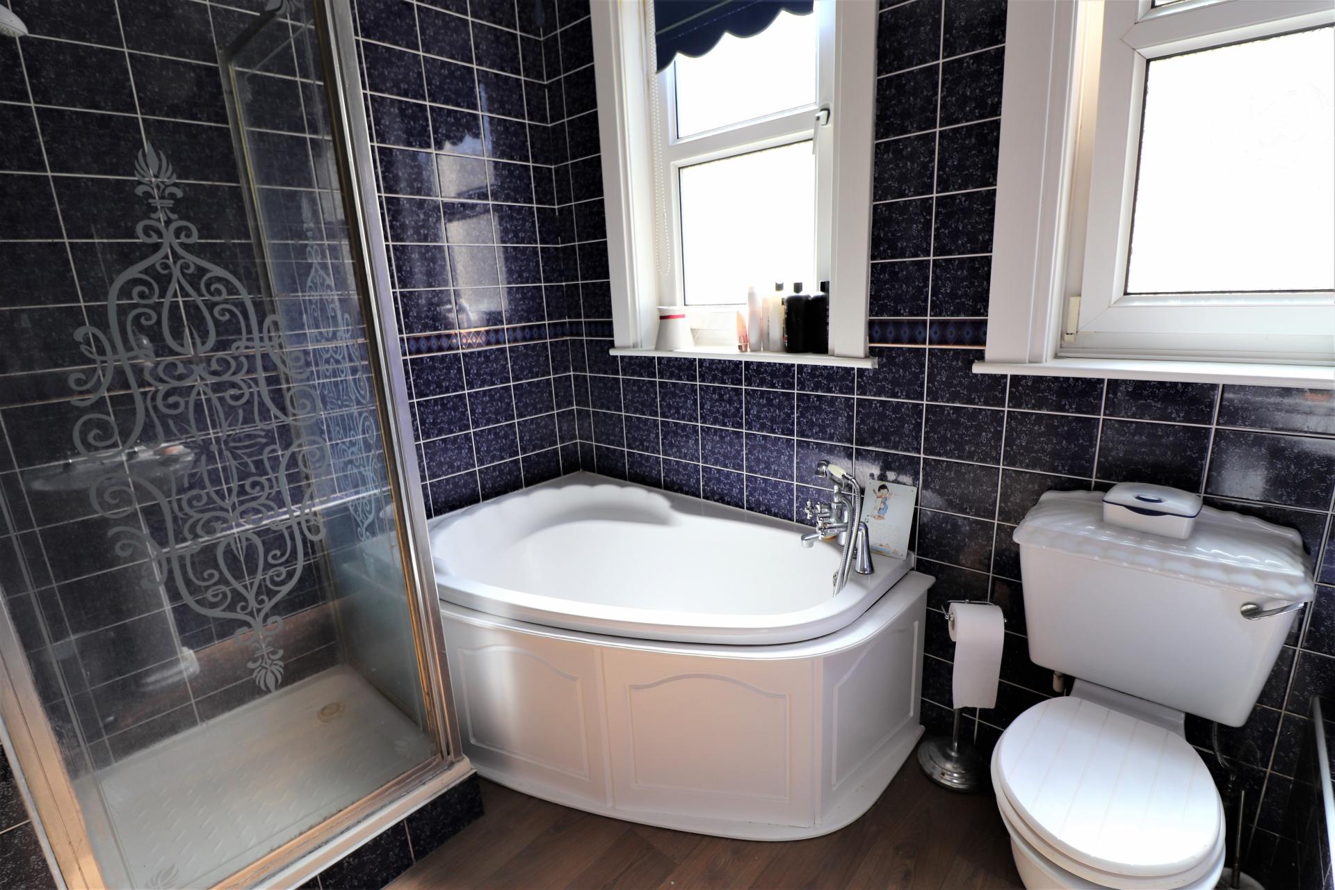 Bath with shower connector over, shower cubicle with electric shower, WC, pedestal wash basin, two double glazed windows, tiled walls, vinyl flooring, heated towel rail.