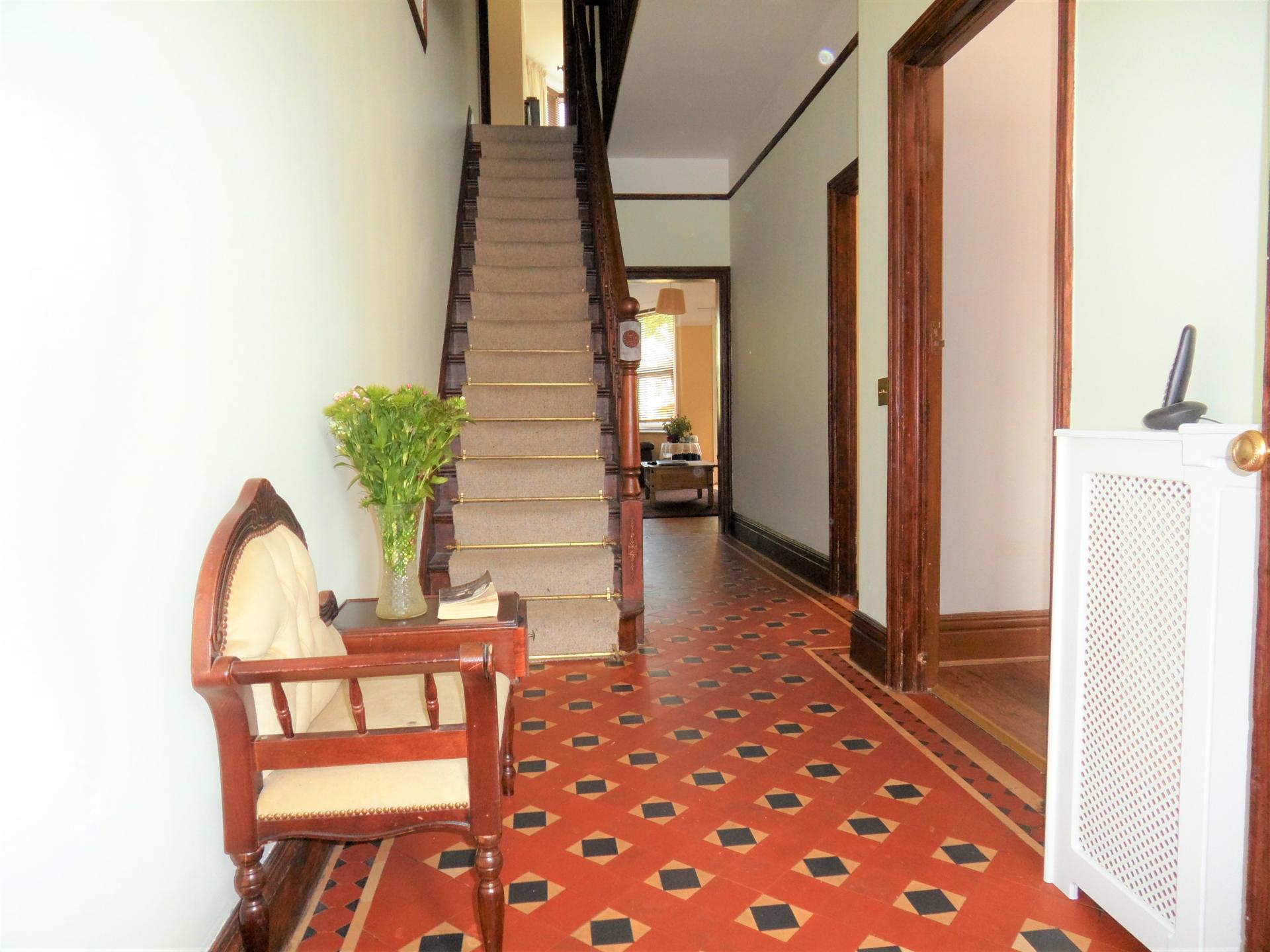 Original tiled walls and flooring. Stained glass door to entrance hall.