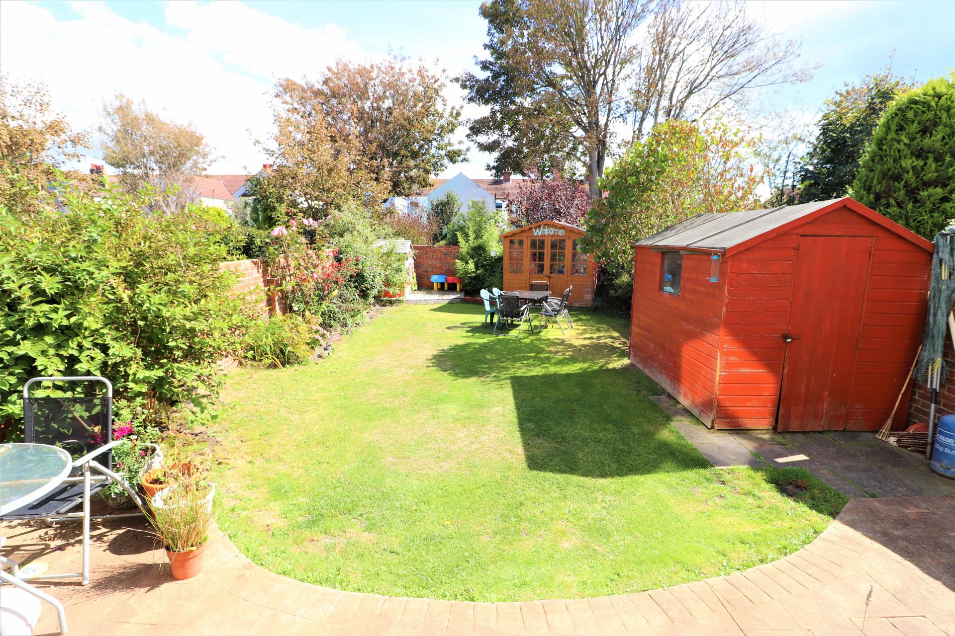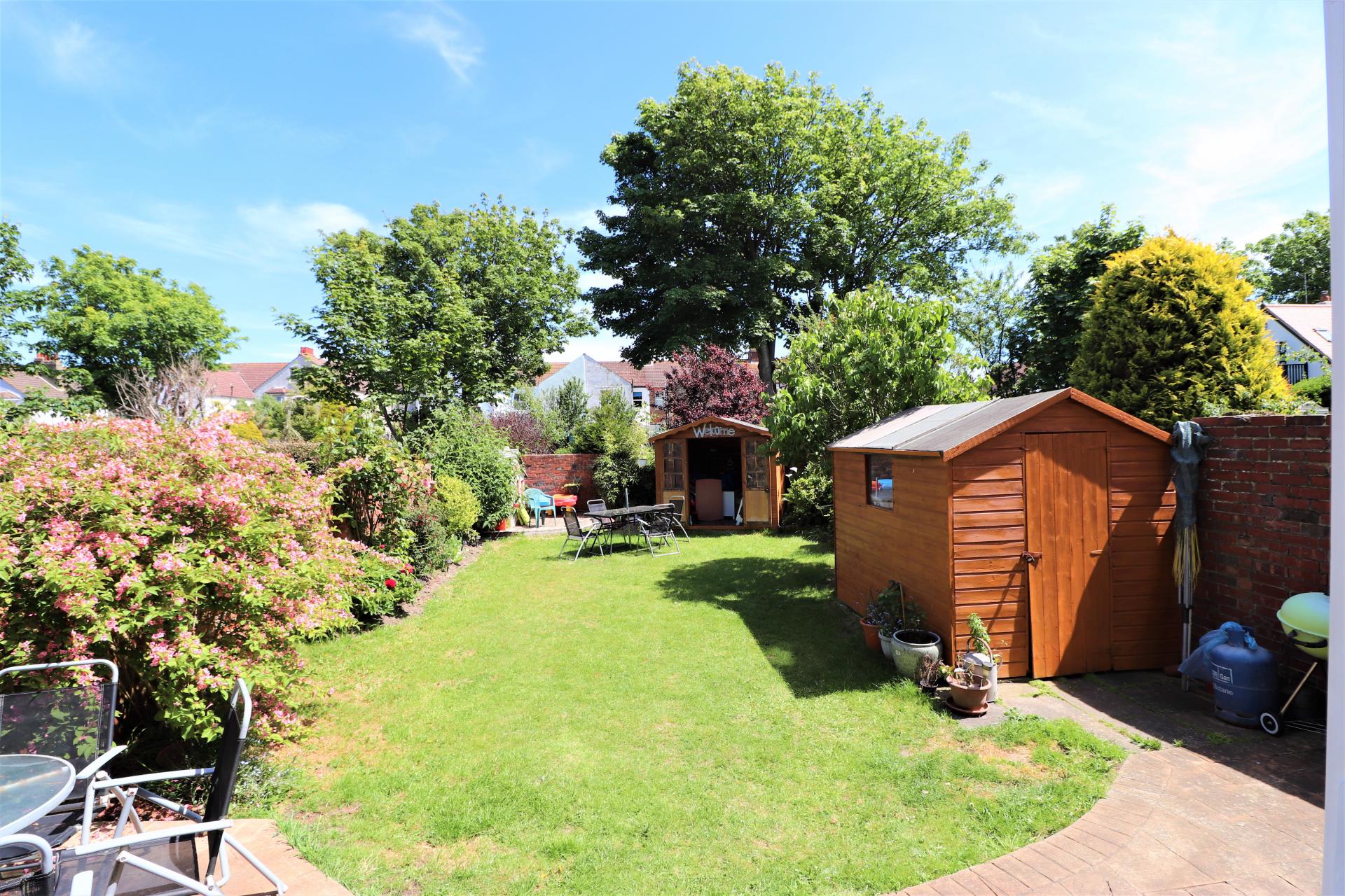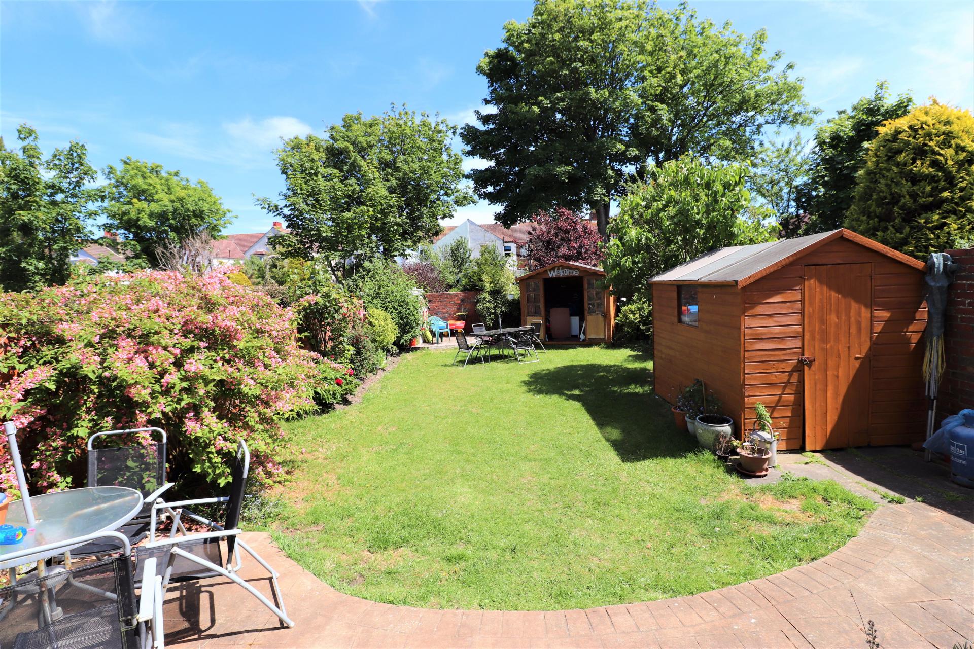 Mainly laid to lawn with flower beds, side access, outside power and water tap, one shed, one summerhouse with power, patio area.
