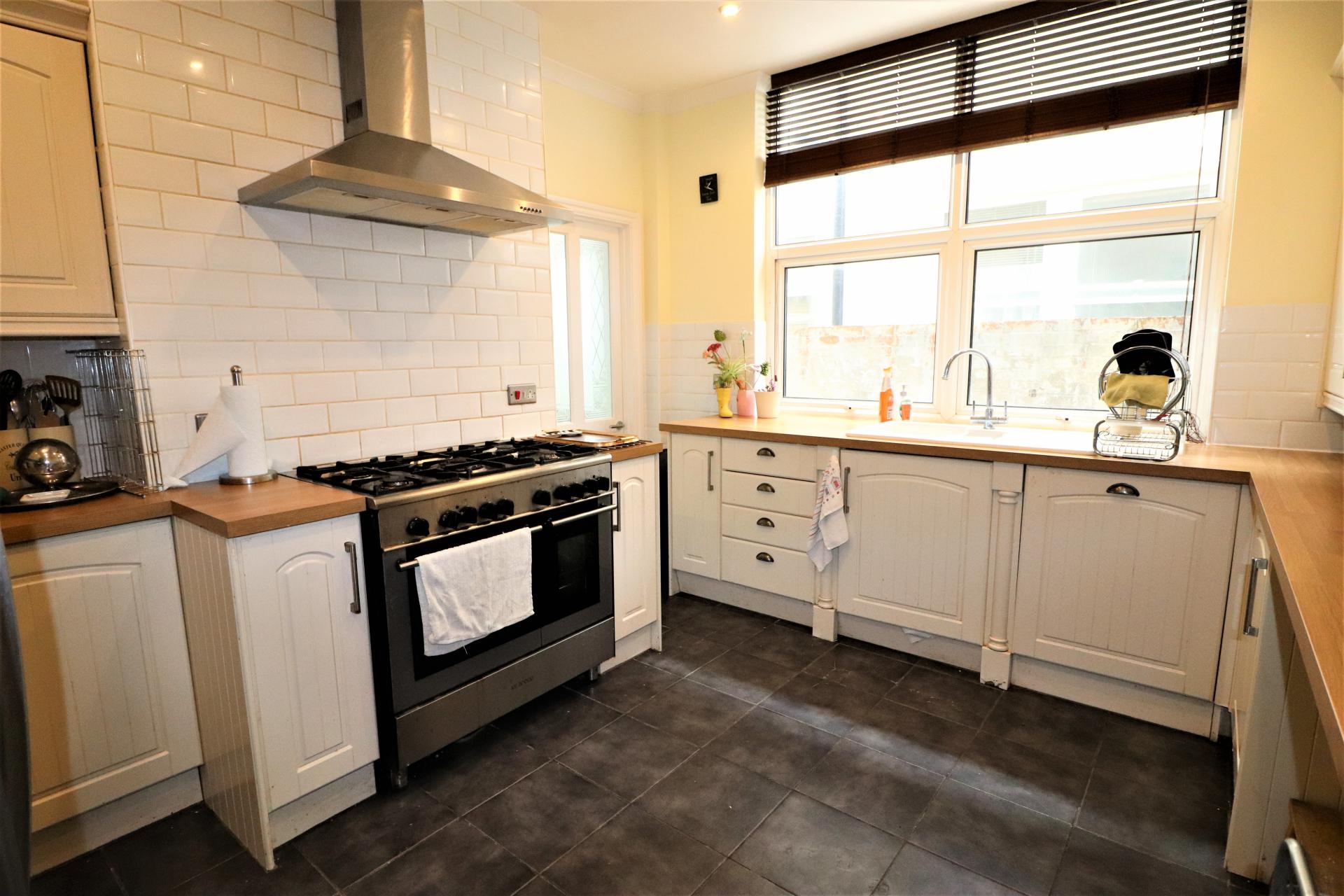 A range of fitted wall and base units, wood work surfaces, one and half bowl sink, tiled splash backs, two double glazed windows, spot lights, range style cooker with extractor fan over, built in dish washer, space for American style fridge/freezer, 2 radiators, tiled flooring, cupboard housing boiler.