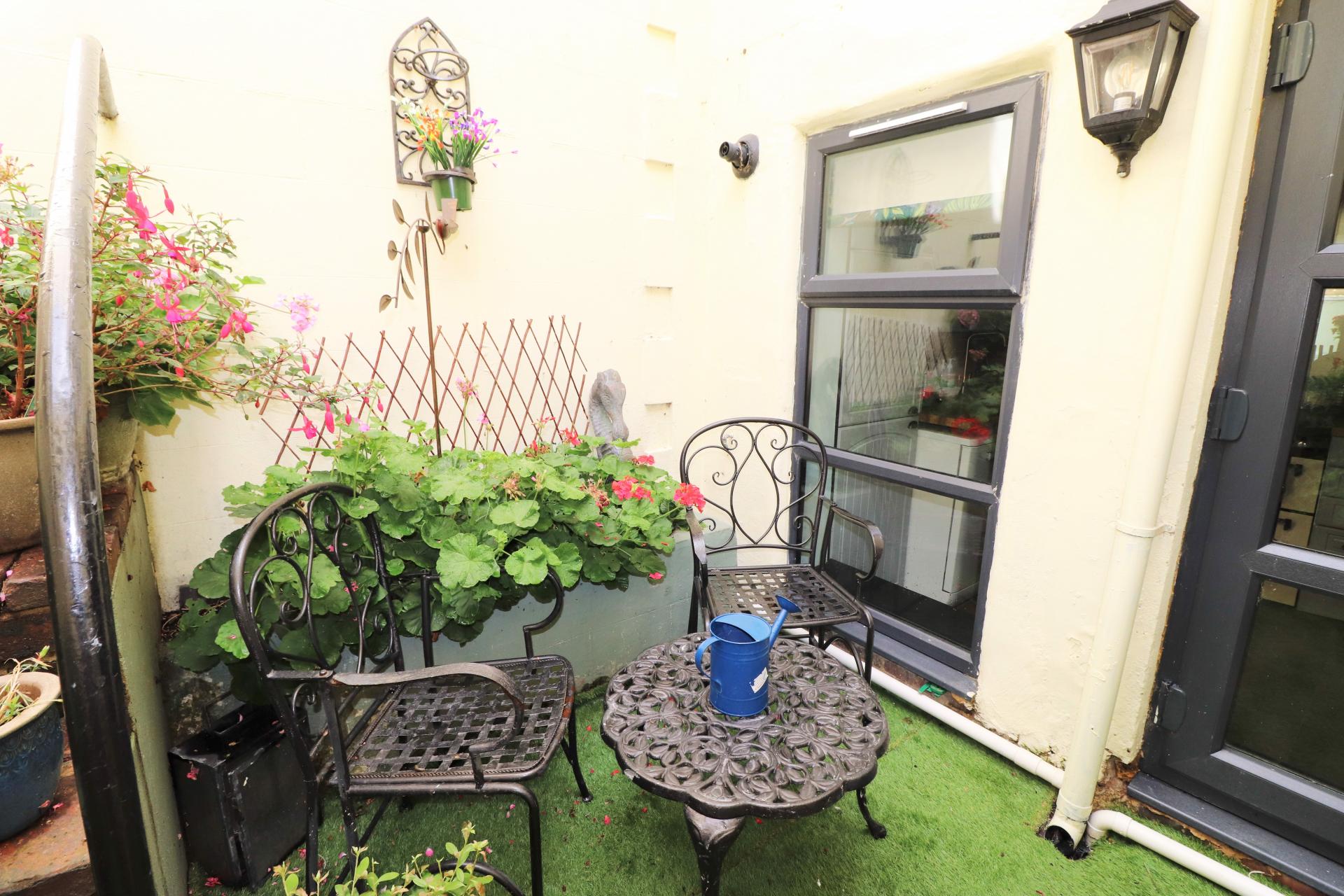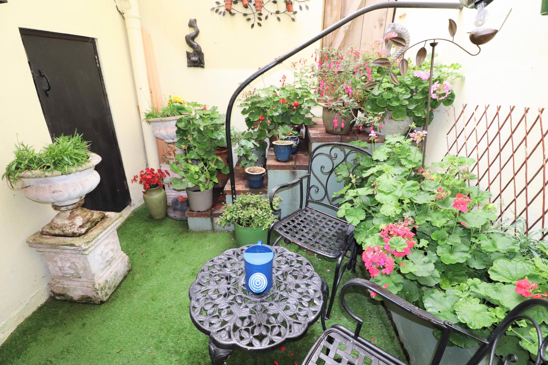 Private courtyard garden with stairs giving rear access. Storage cupboards.