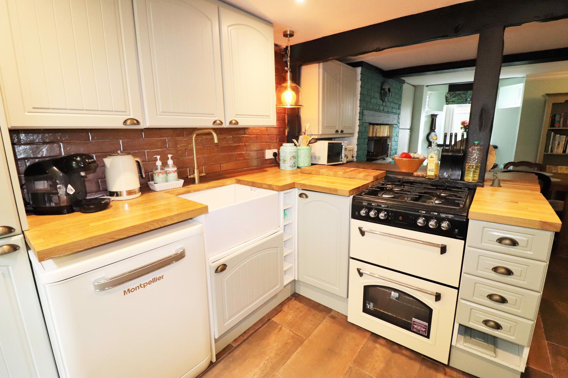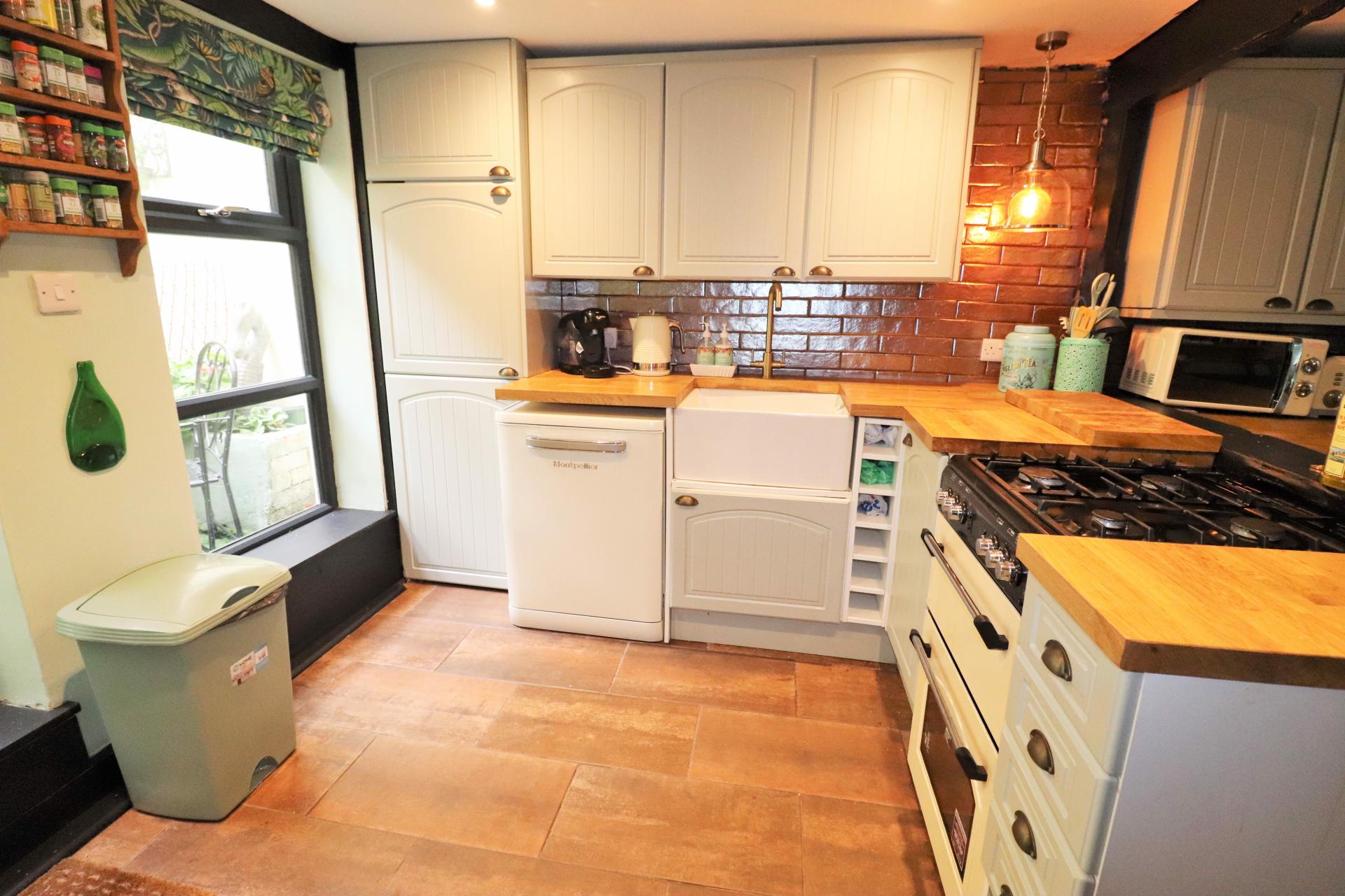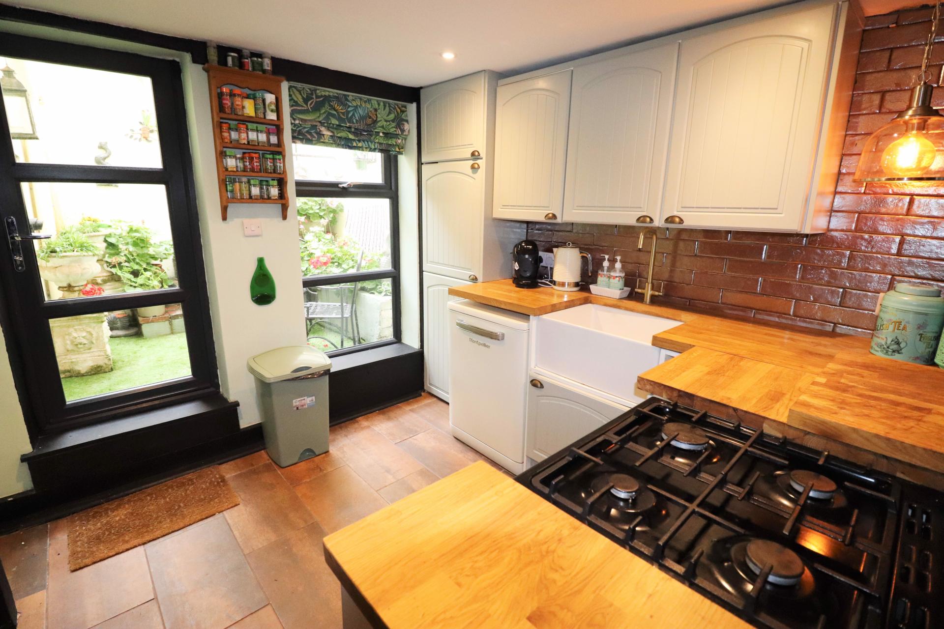 Double glazed door leading to the courtyard garden. Double glazed window to the rear. Timber effect worktops with inset butler sink with mixer tap. Range of base units and drawers with matching wall mounted cupboards and a wine rack. Space and plumbing for a washing machine and a dishwasher. Spaces for a cooker and a fridge freezer.