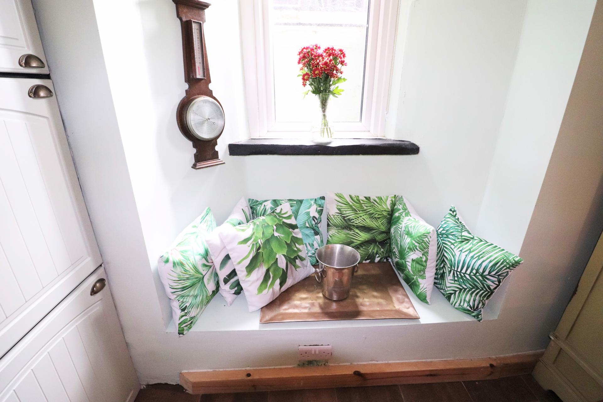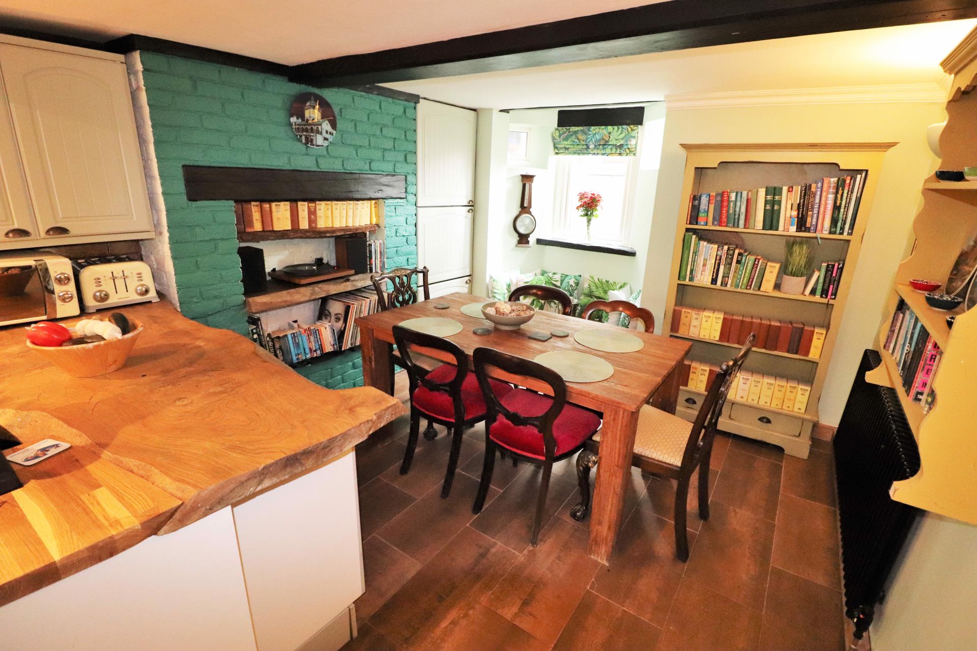 Forming park of an open plan kitchen breakfast room with 3 double glazed windows to the front. Several storage cupboards. Exposed beam. Victorian style radiator.