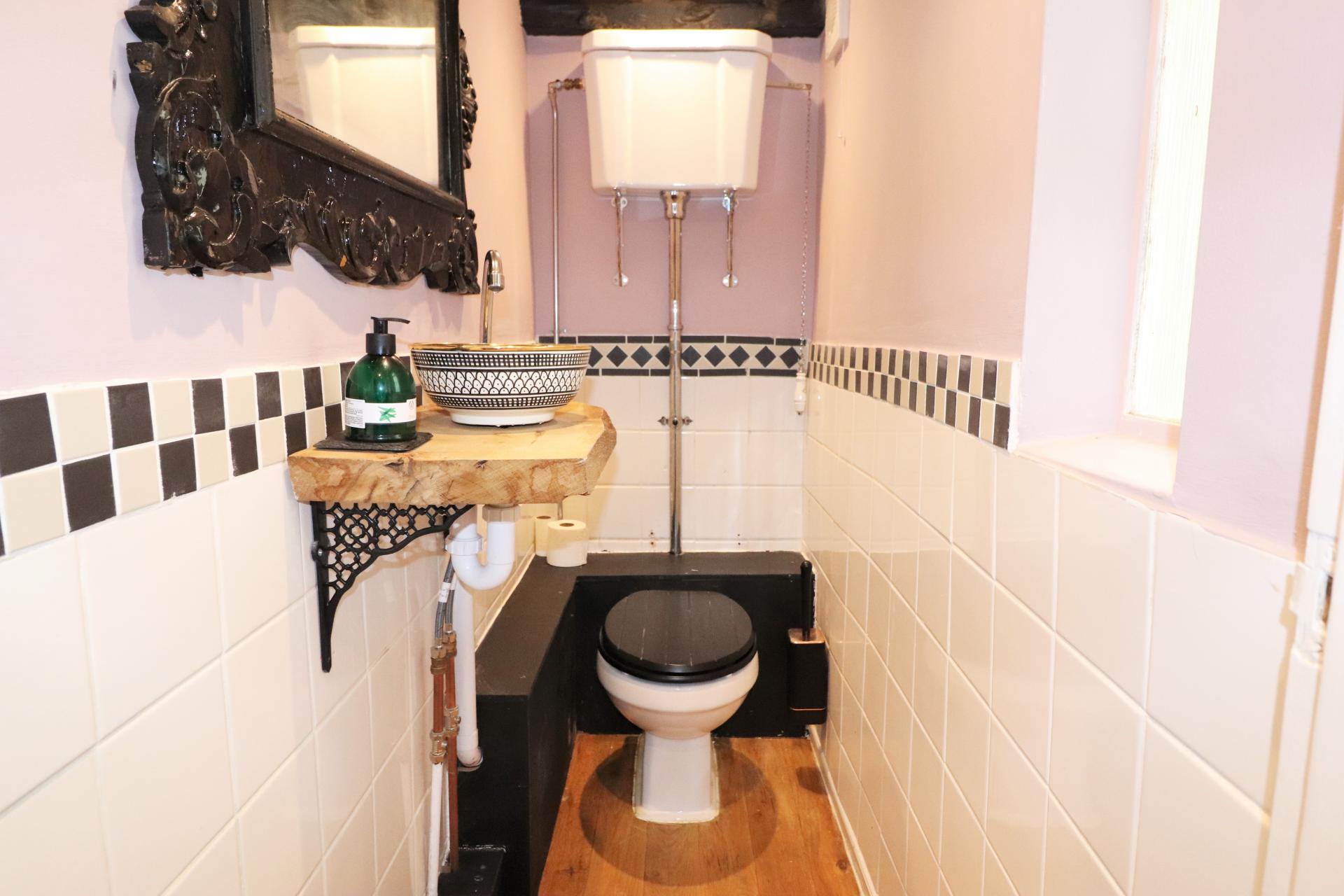 Two windows to the side. Low level WC. Ornamental wash hand basin. Vertical multi bar radiator. Inset ceiling spot lights.
