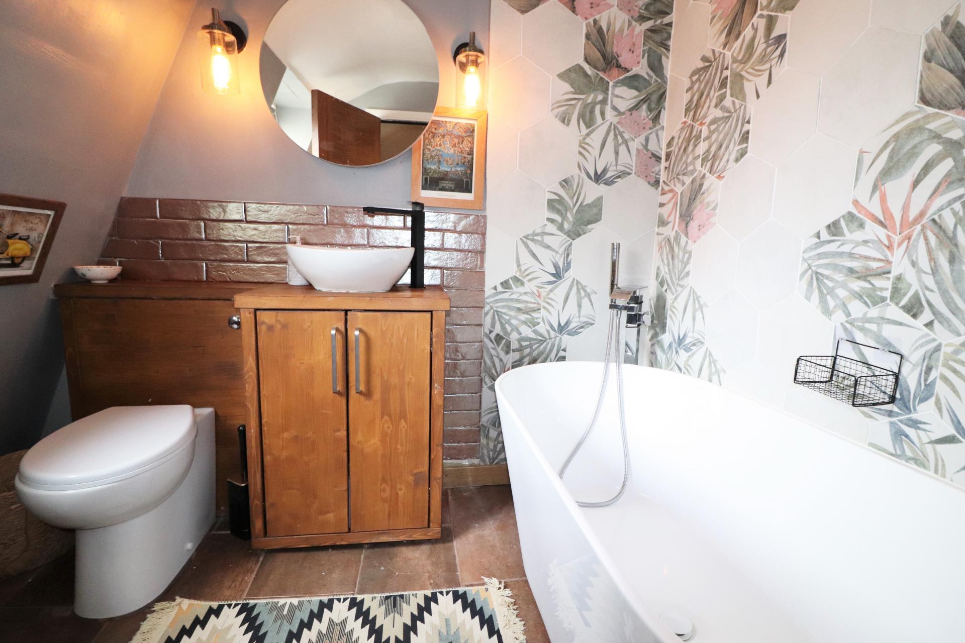 Double glazed window to the rear. Roll edge bath with hand held microphone style shower attachment. Low level WC. Wash hand basin with vanity cupboard below. Victorian style radiator.