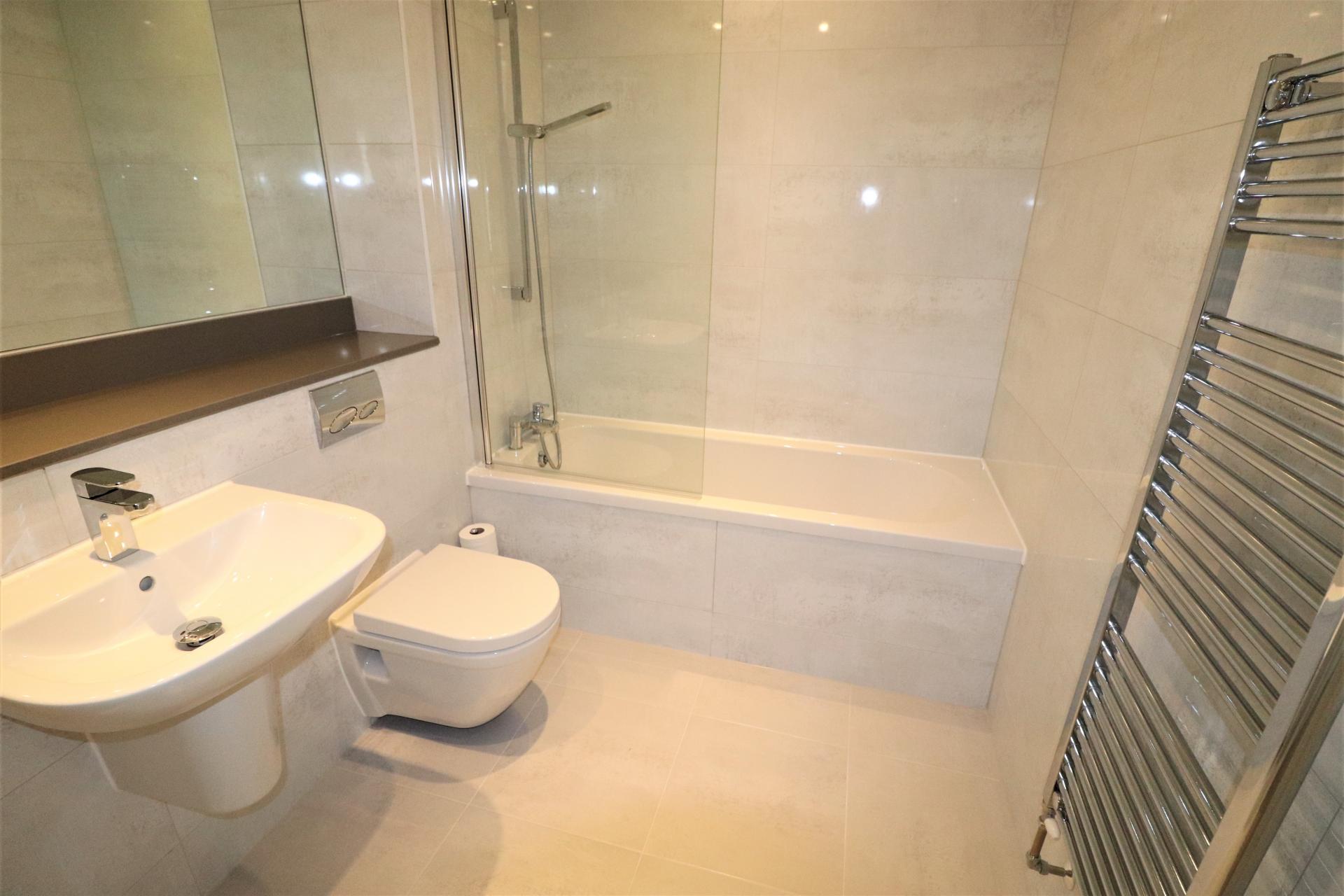 Bath with shower connector over, WC, wall mounted wash basin, spot lights, extractor, tiled walls and flooring, heated towel rail.