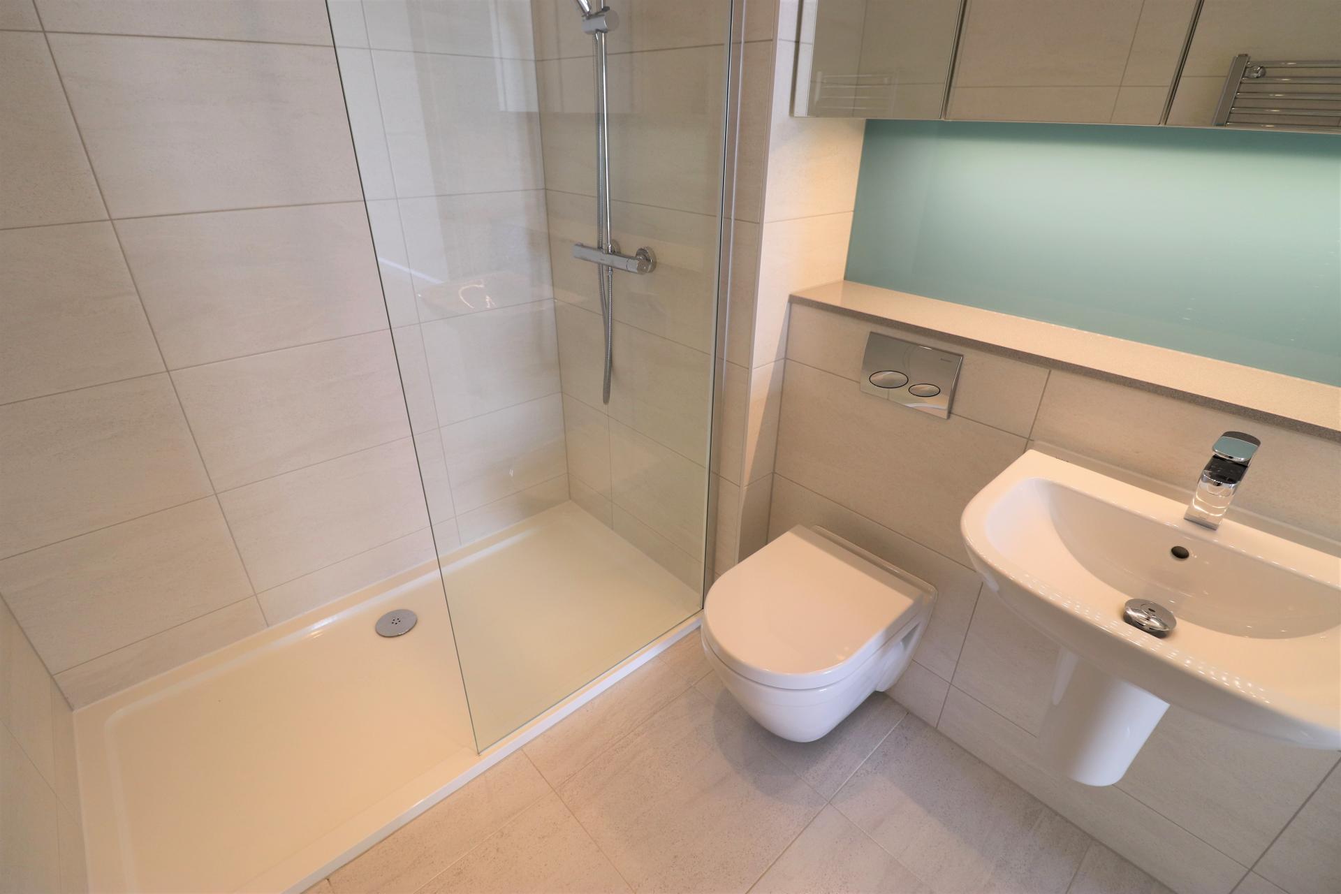 Fitted to a high standard comprising a walk in shower cubicle with mixer tap, heated towel rail, WC, wall mounted wash basin, built in cabinets, spot lights, extractor, tiled walls and flooring.