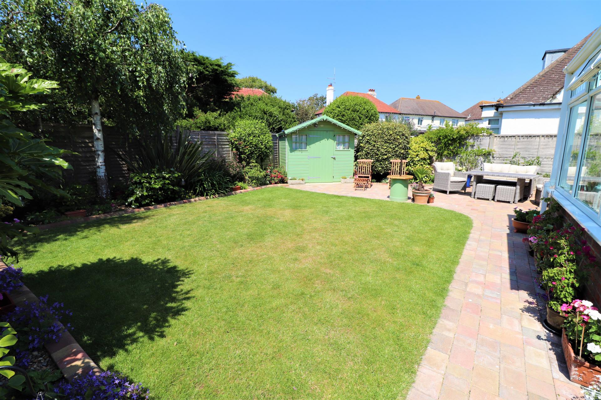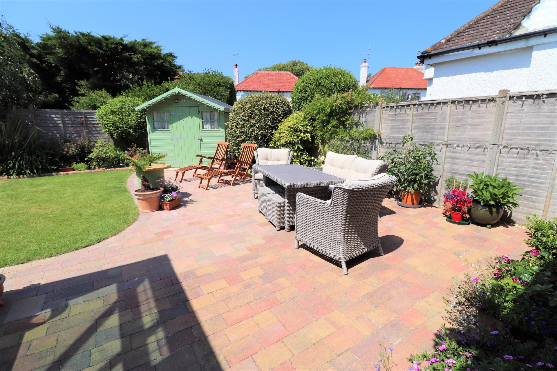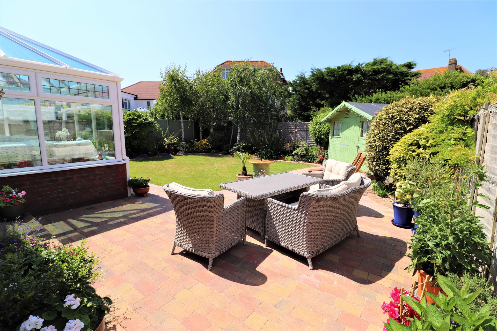 Enclosed with an area of lawn with mature shrub borders. Block paved patio areas.