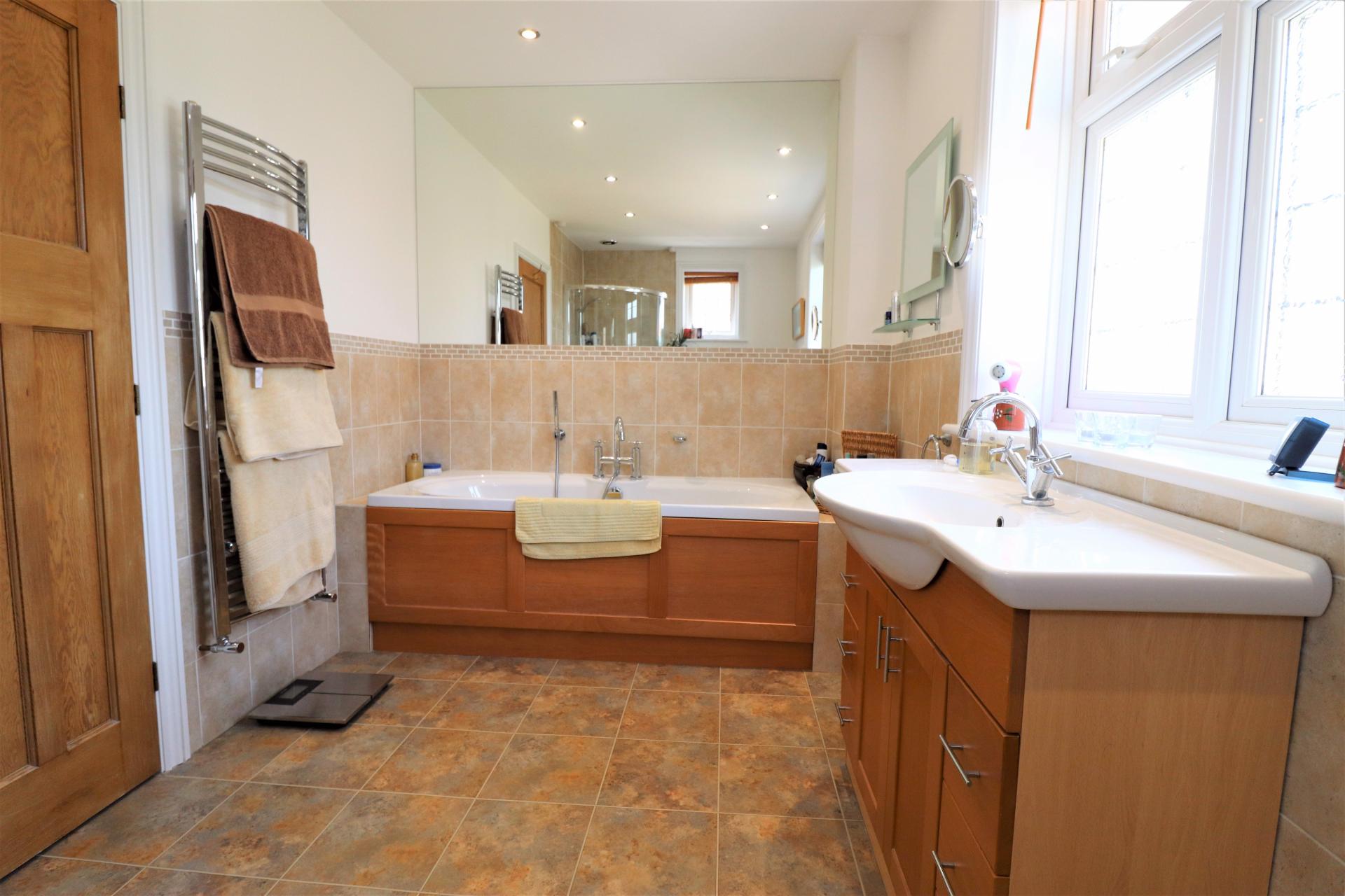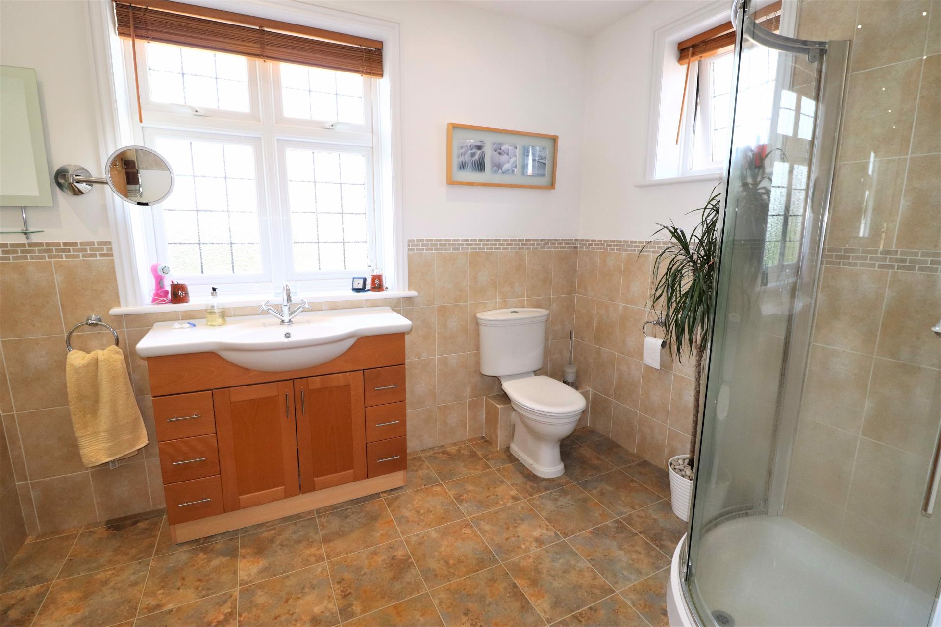 Part tiled with double glazed, leaded light windows to the side and rear. Panel enclosed bath with mixer tap and hand held shower attachment. Corner shower cubicle with wall mounted shower unit. Low level WC. Wash hand basin with vanity cupboard and drawers below. Heated towel rail. Inset ceiling spotlights.