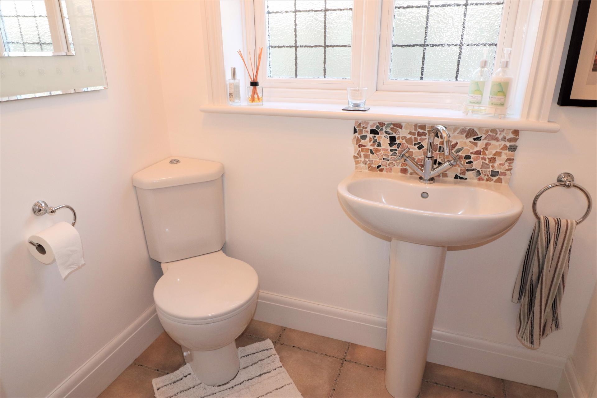 Double glazed, leaded light window to the side. Low level WC. Pedestal wash hand basin. Double panel radiator. Under stairs storage cupboard.