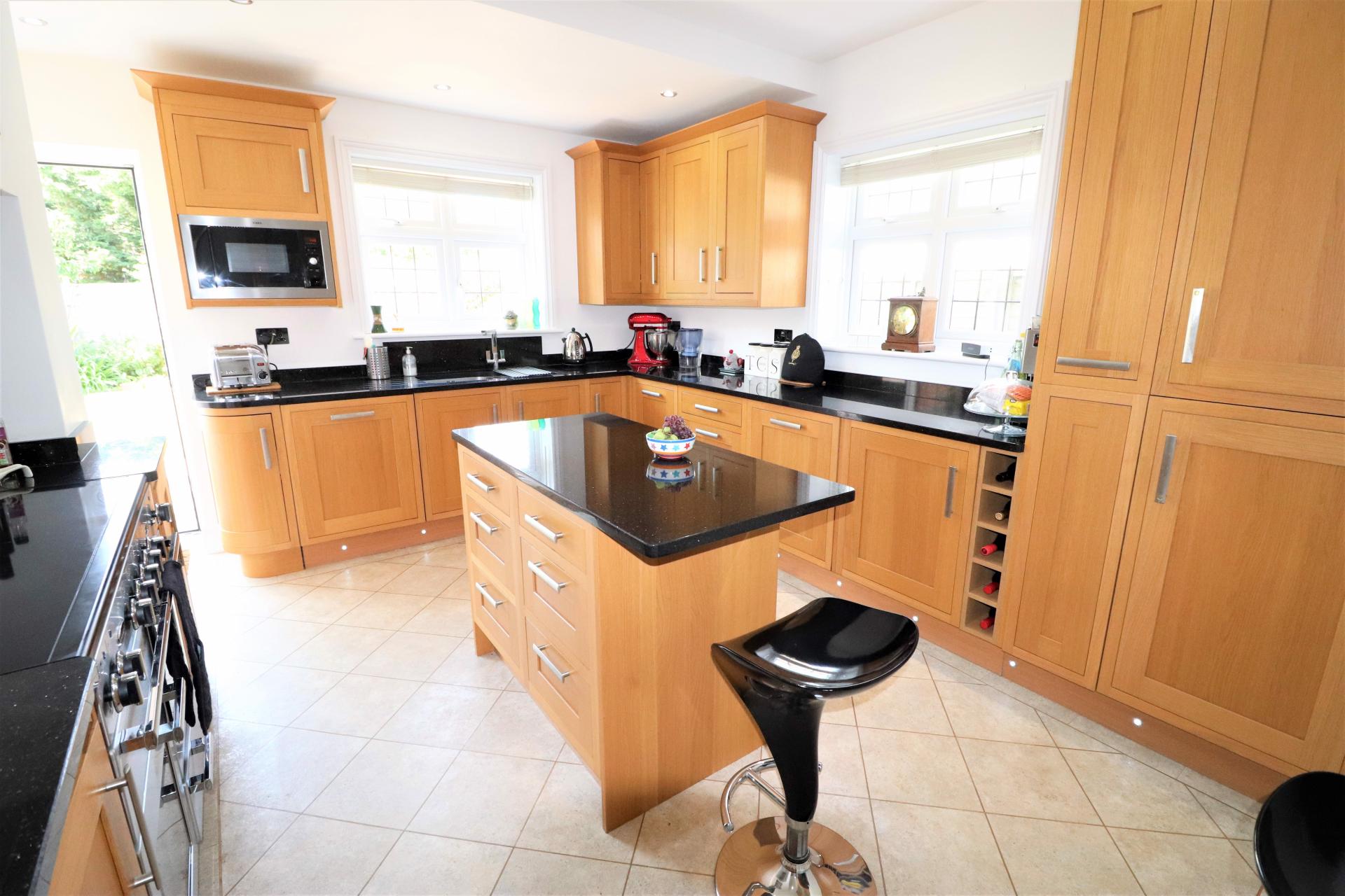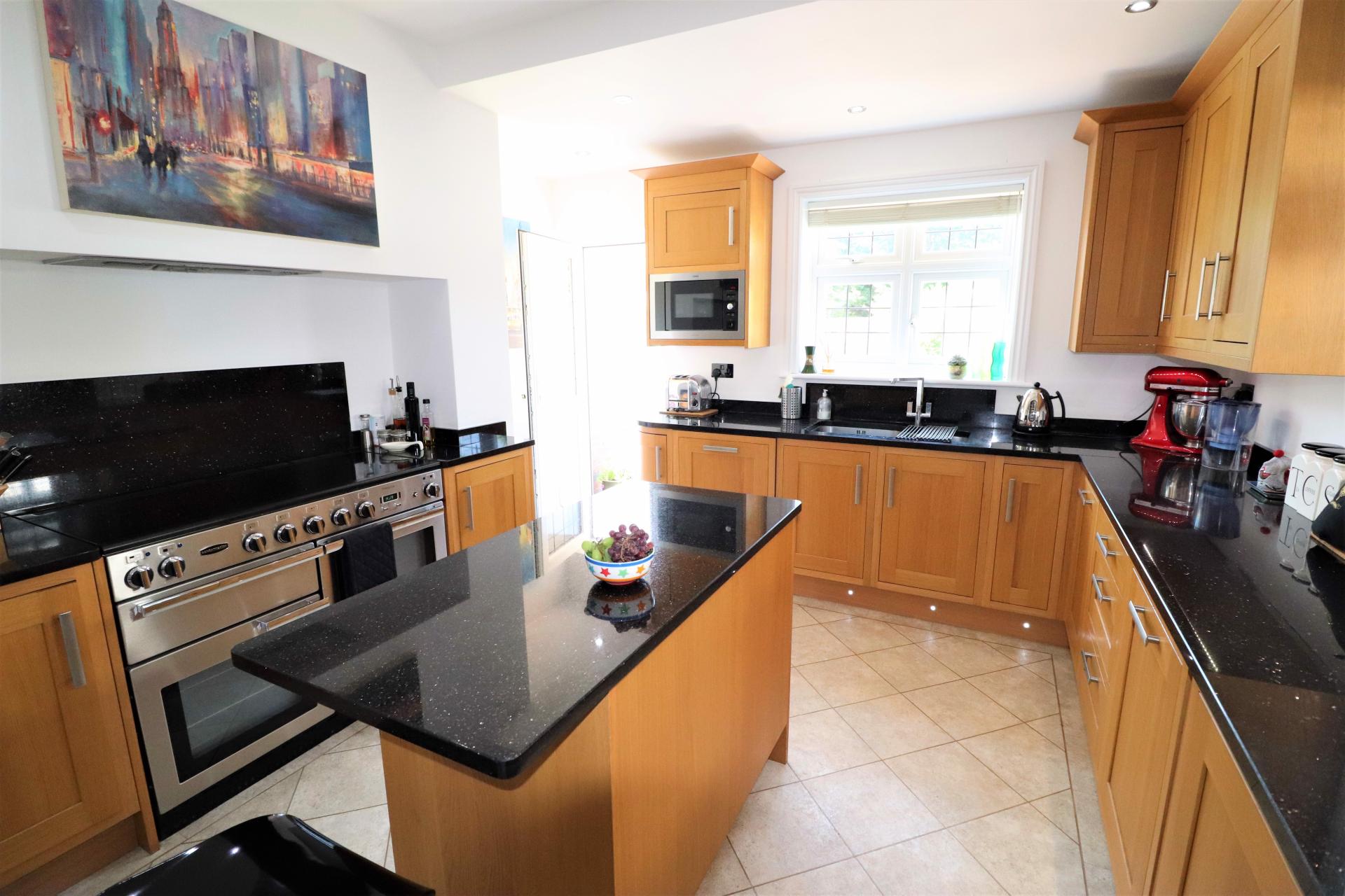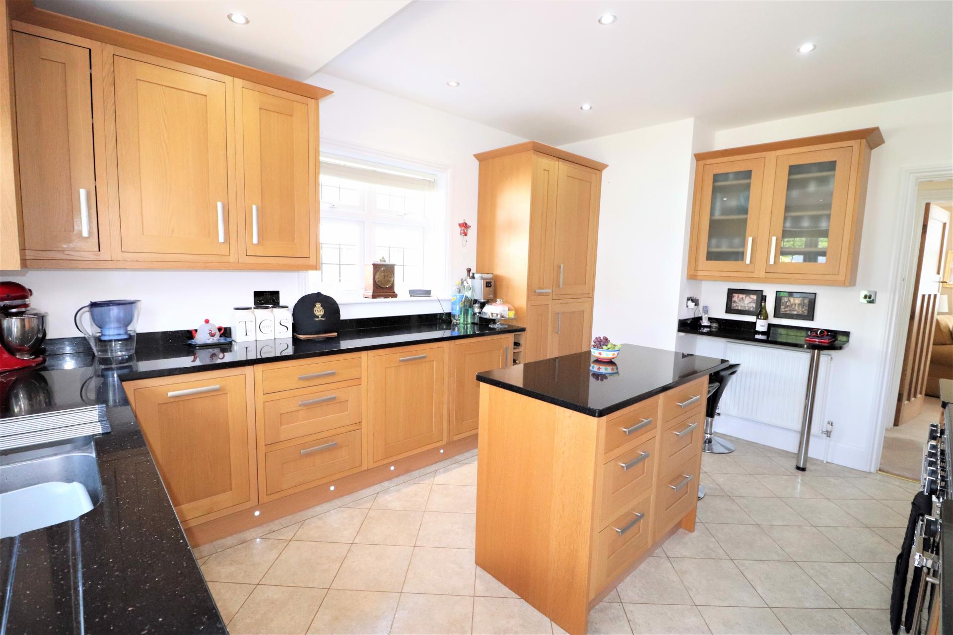 Double glazed, leaded light door to the rear garden. Double glazed, leaded light windows to the side and rear. Black granite worktops with double bowl sink unit with mixer tap. Island centrepiece with drawers below. Range of base units and drawers with matching wall mounted cupboards. Breakfast bar. Space for double width Cooker. Built in Fridge freezer, dishwasher and washing machine. Double panel radiator. Inset ceiling spotlights.