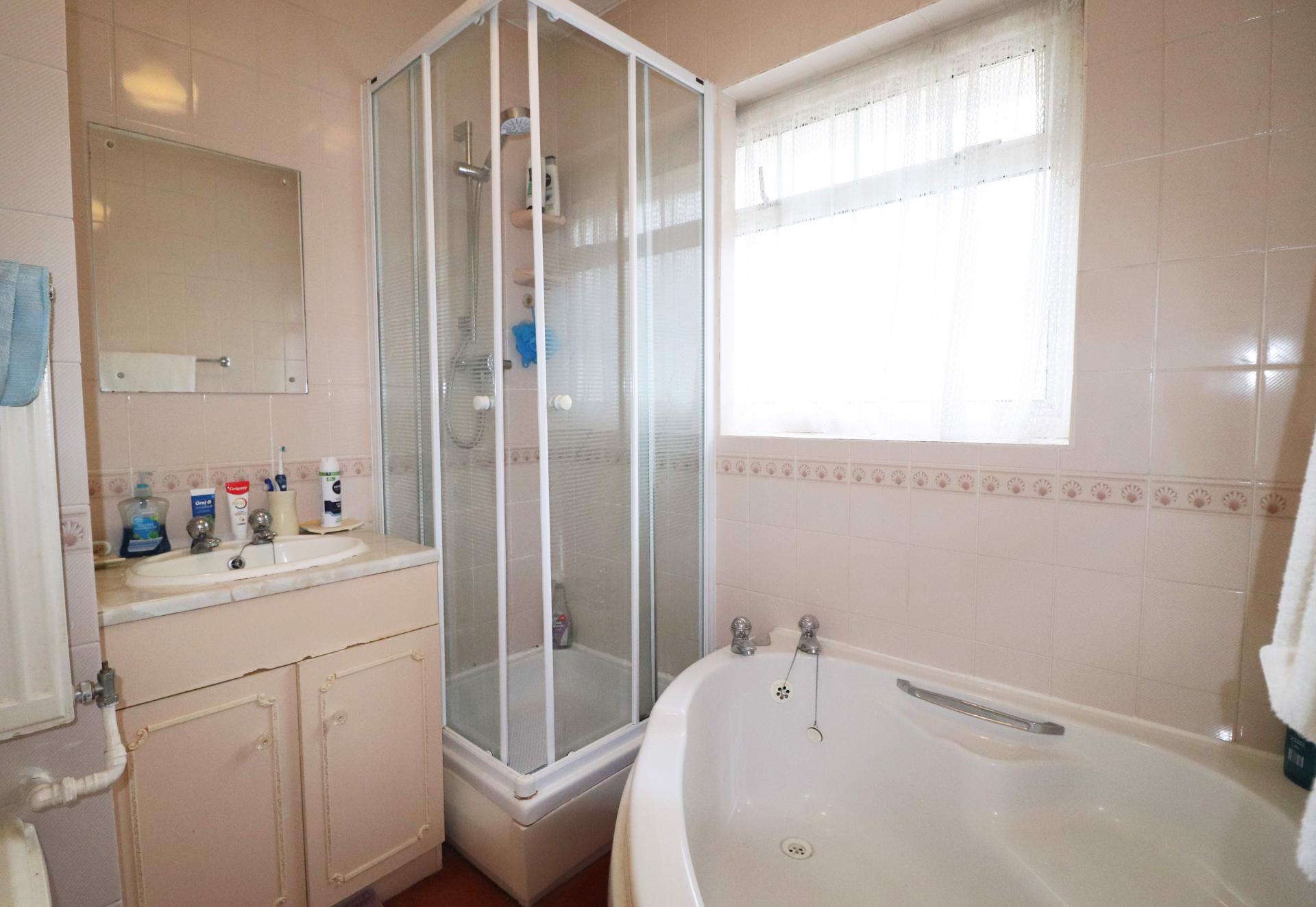 Tiled room with a double glazed window to the side. Corner bath. Corner shower cubicle with wall mounted controls. Wash hand basin with vanity cupboard below. Single panel radiator.