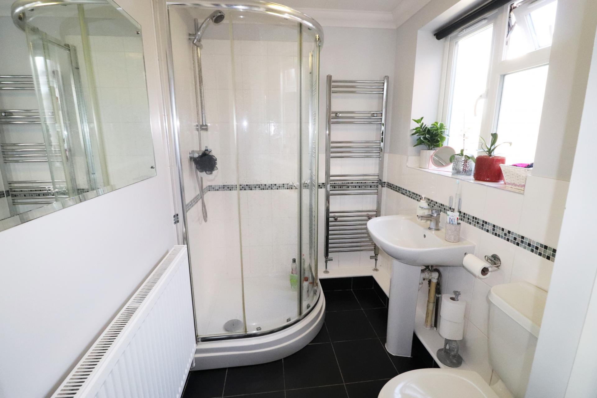 Part tiled with a double glazed window to the side. Corner shower cubicle with wall mounted controls. Low level WC. Pedestal wash hand basin. Heated towel rail. Double panel radiator.