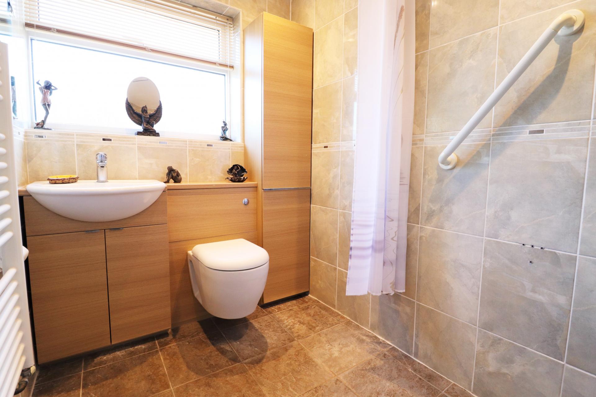 Tiled room with a double glazed window to the side. Wall mounted shower unit and controls. Low level WC. Wash hand basin with vanity cupboard below. Additional storage cupboard. Heated towel rail. Inset ceiling spot lights.