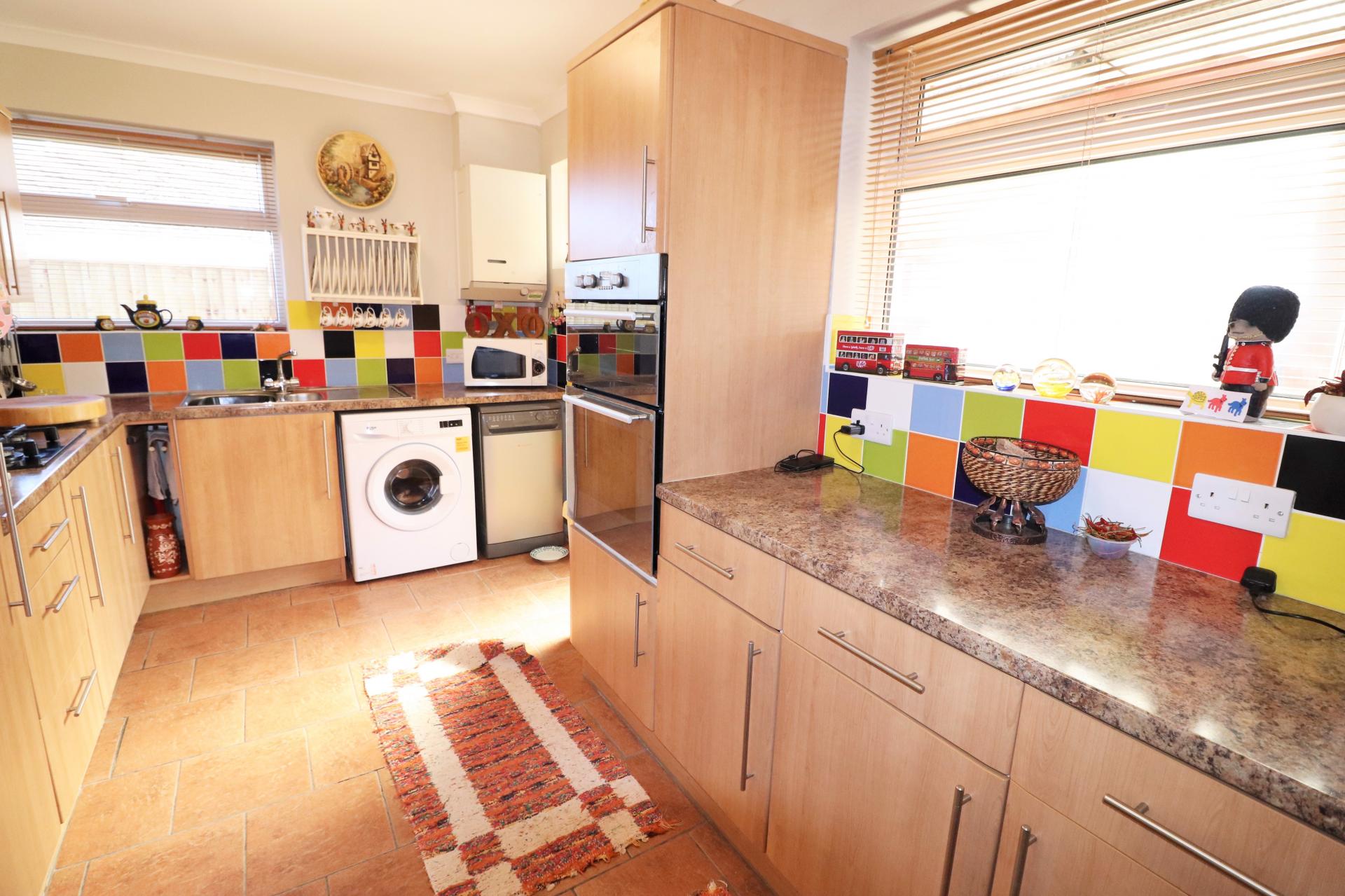 Double glazed door to the rear. Double glazed windows to the side and rear. Roll edge worktops with inset stainless steel, one and a half bowl, single drainer sink unit with mixer tap. Range of base unit and drawers with matching wall mounted cupboards. Four ring gas hob with extractor unit above. Fitted double oven. Space and plumbing for a dishwasher and washing machine. Space for a fridge freezer. Single panel radiator.