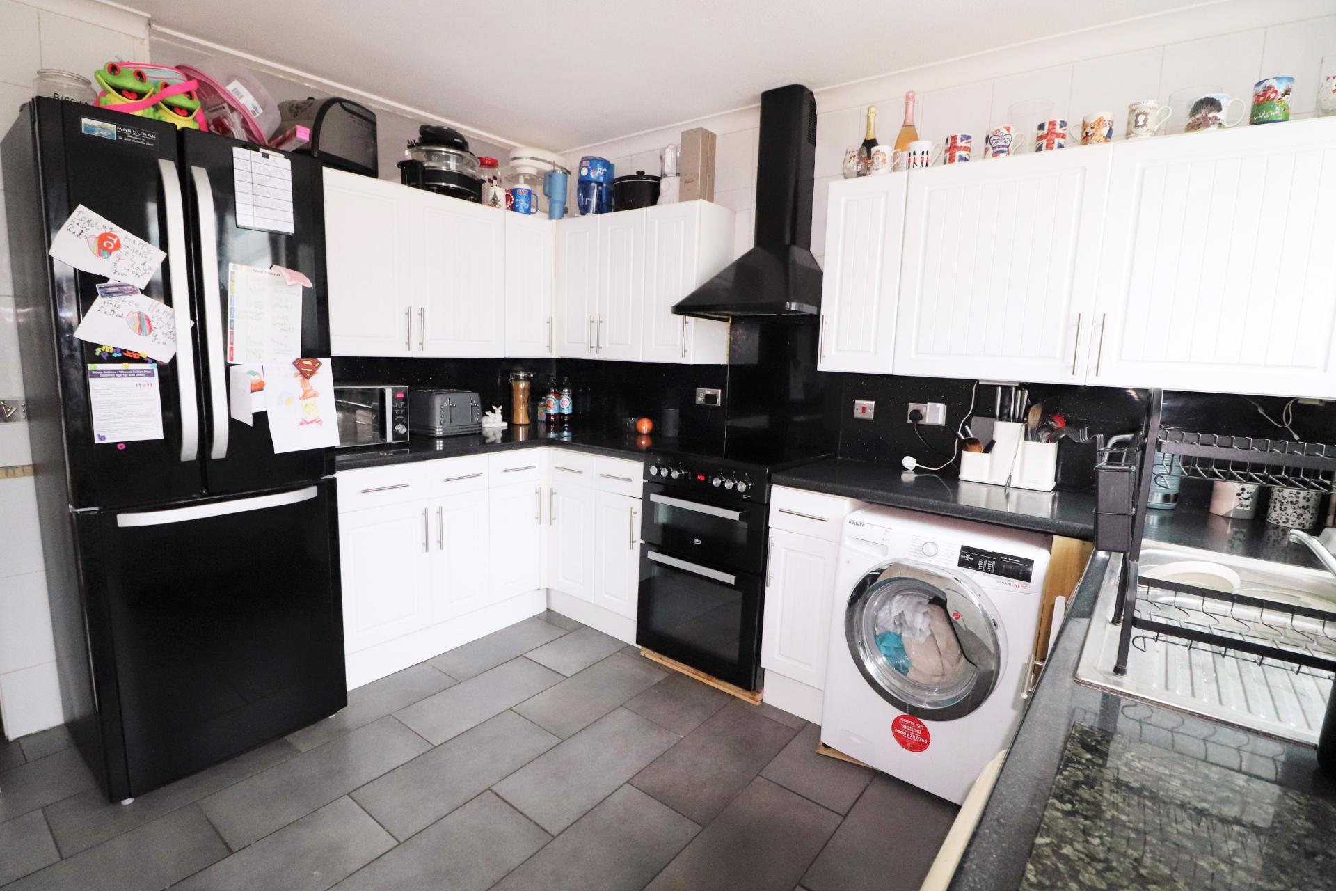 Double glazed window to the rear. Door to the conservatory. Roll edge worktops with inset stainless steel, one and a half bowl, single drainer sink unit with mixer tap. Range of base units and drawers with matching wall mounted cupboards. Space for a cooker with an extractor hood over. Space and plumbing for two washing machines. Space for a fridge freezer. Walk in storage cupboard.