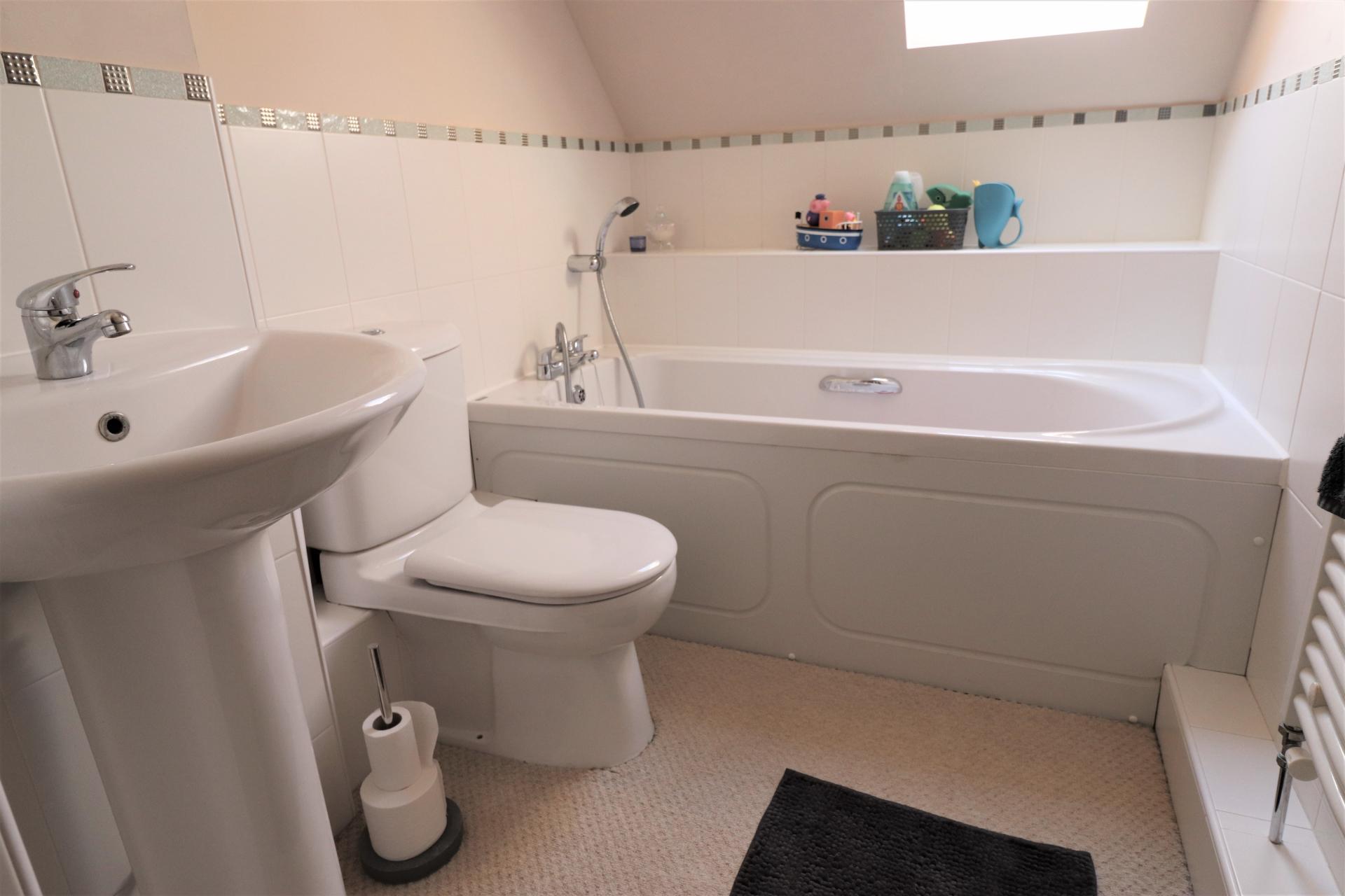 Part tiled room with double glazed Velux window to the side. Panel enclosed bath with hand held shower attachment. Low level WC. Pedestal wash hand basin, Heated towel rail. Underfloor heating. Inset ceiling spot lights. Cupboard housing gas fired central heating boiler.